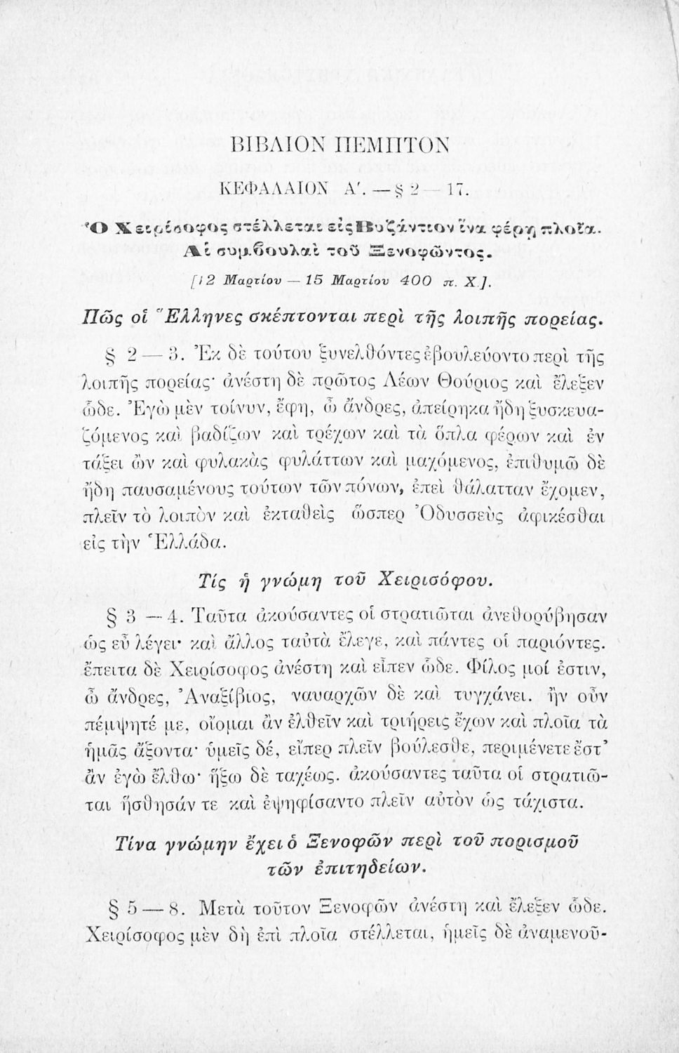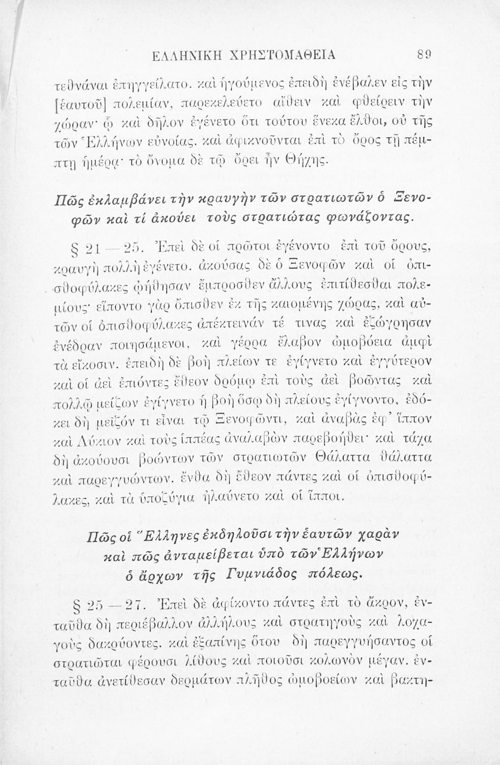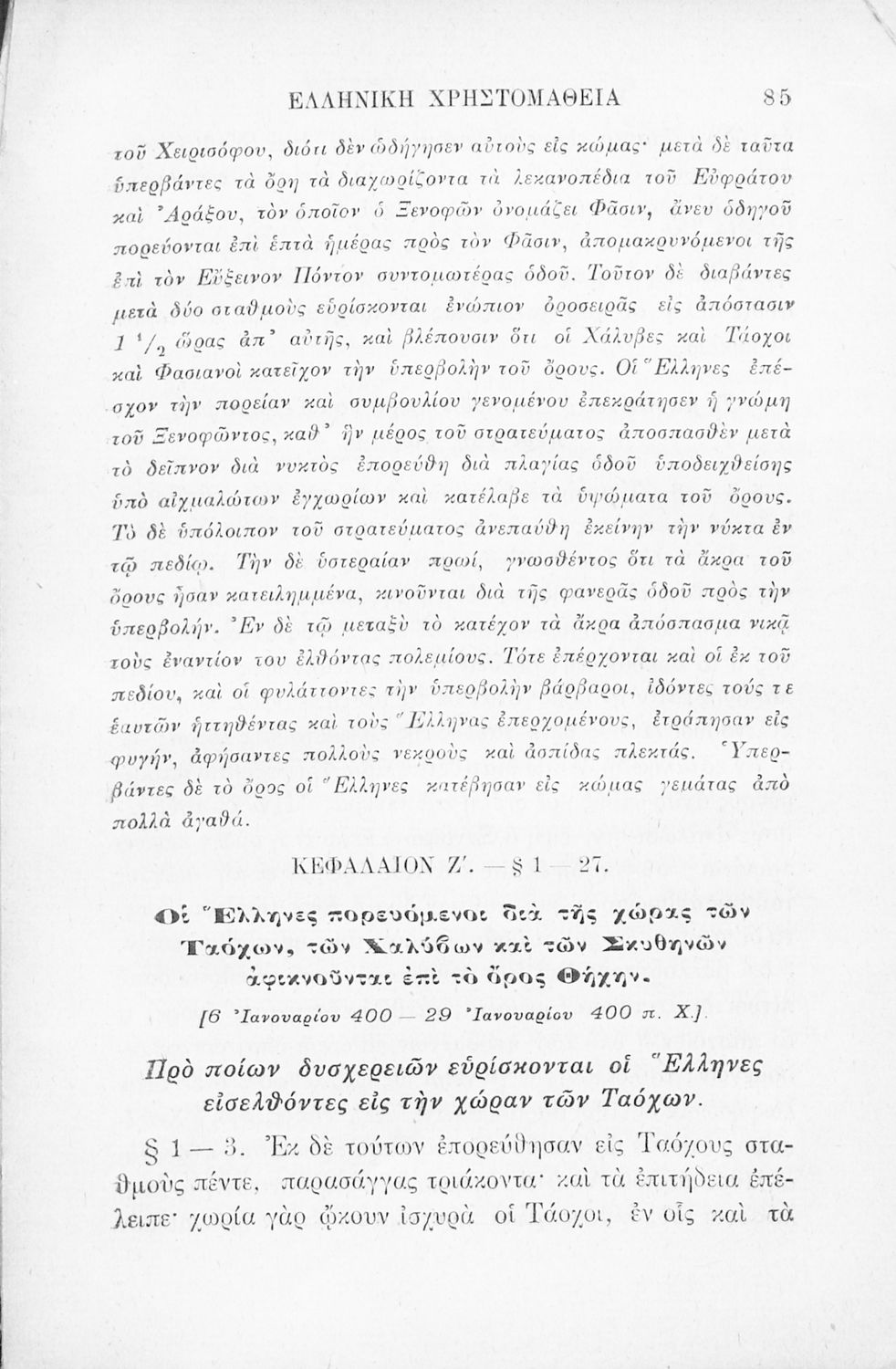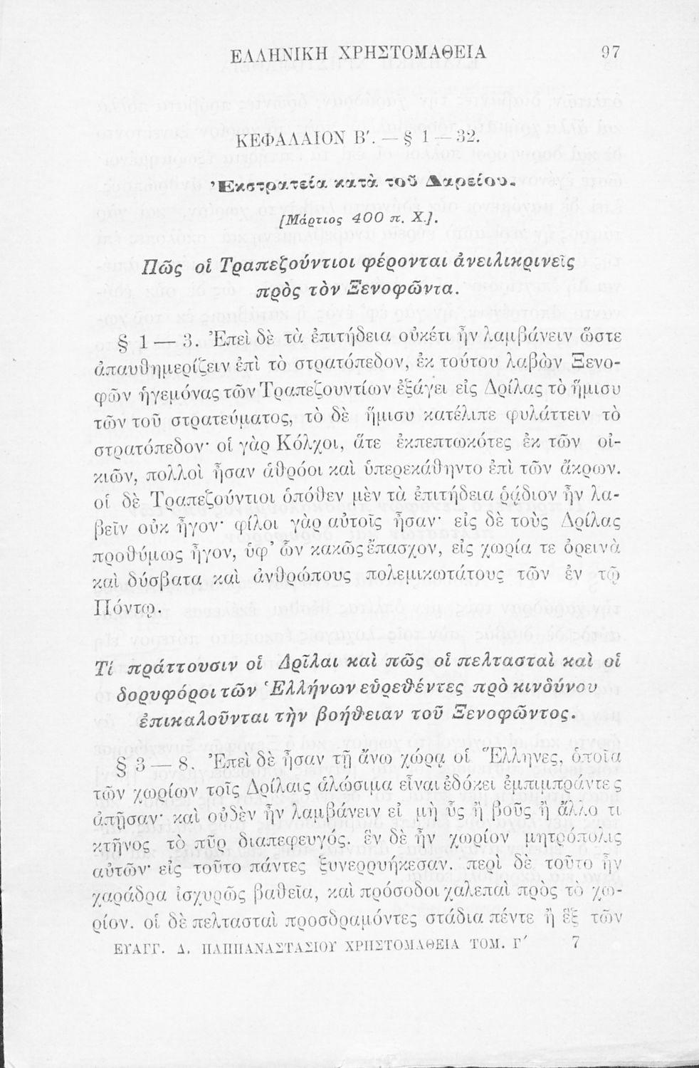 Ελληνική χρηστομάθεια τόμος Γ΄ εκλογαί εκ των τεσσάρων τελευταίων βιβλίων της Κύρου Αναβάσεως του Ξενοφώντος, εκ του Γ΄ και Δ΄ βιβλίου των Ελληνικών του αυτού και εκ του Λουκιανού το Ενύπνιον και Ανάχαρσιν προς χρήσιν των μαθητών της Γ΄ τάξεως του Ελληνικού Σχολείου