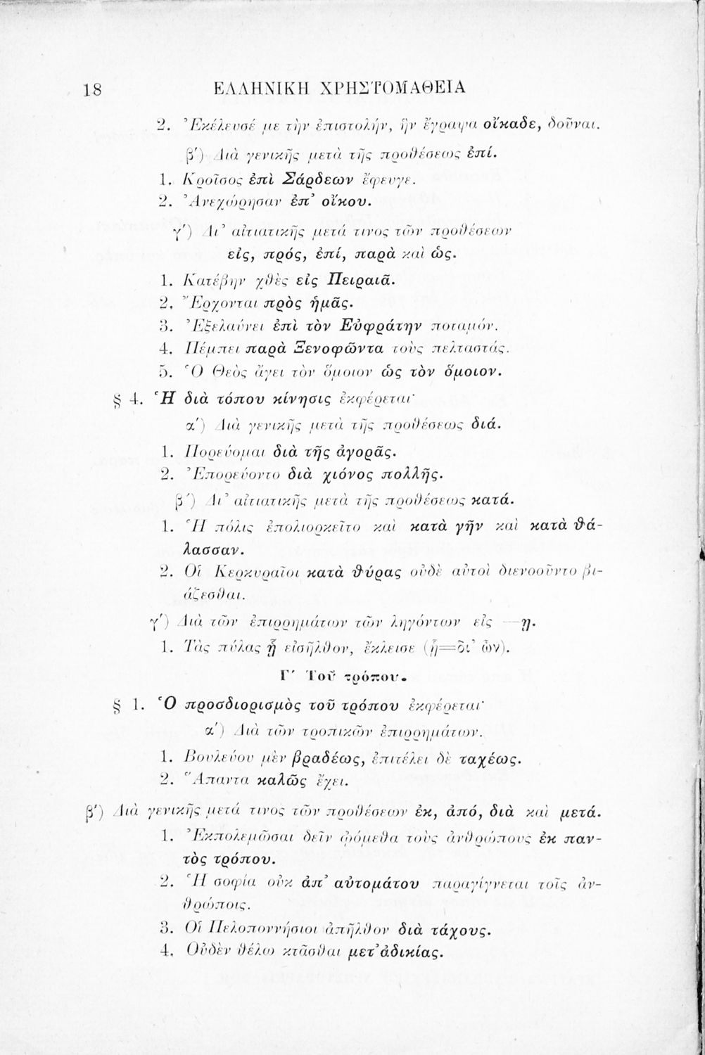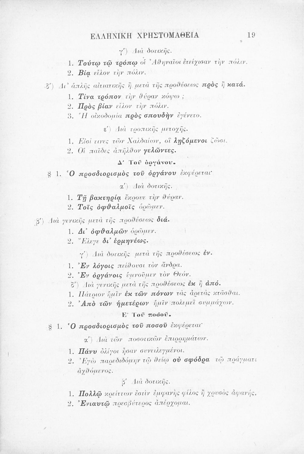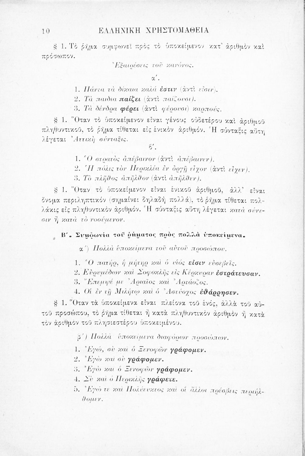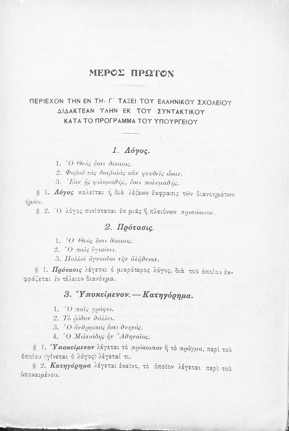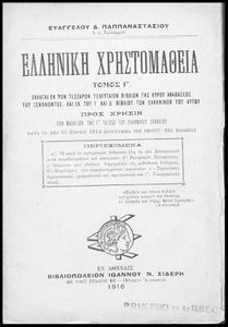 Βαθμίδα εκπαίδευσης: Δευτεροβάθμια Τάξη: Γ' Ελληνικού Σχολείου Μάθημα: Αρχαία Ελληνικά Γλώσσα: Καθαρεύουσα Παρουσίαση περιεχομένου: Σχολικό εγχειρίδιο Αρχαίων Ελληνικών Γ' Ελληνικού Σχολείου που περιλαμβάνει γραμματική της αρχαίας ελληνικής, αποσπάσματα από το έργο του Ξενοφώντα Ελληνικά και τα έργα του Λουκιανού Ενύπνιον και Ανάχαρσις, βιογραφικά σημειώματα των συγγραφέων, ερμηνευτικές και πραγματολογικές σημειώσεις. |
