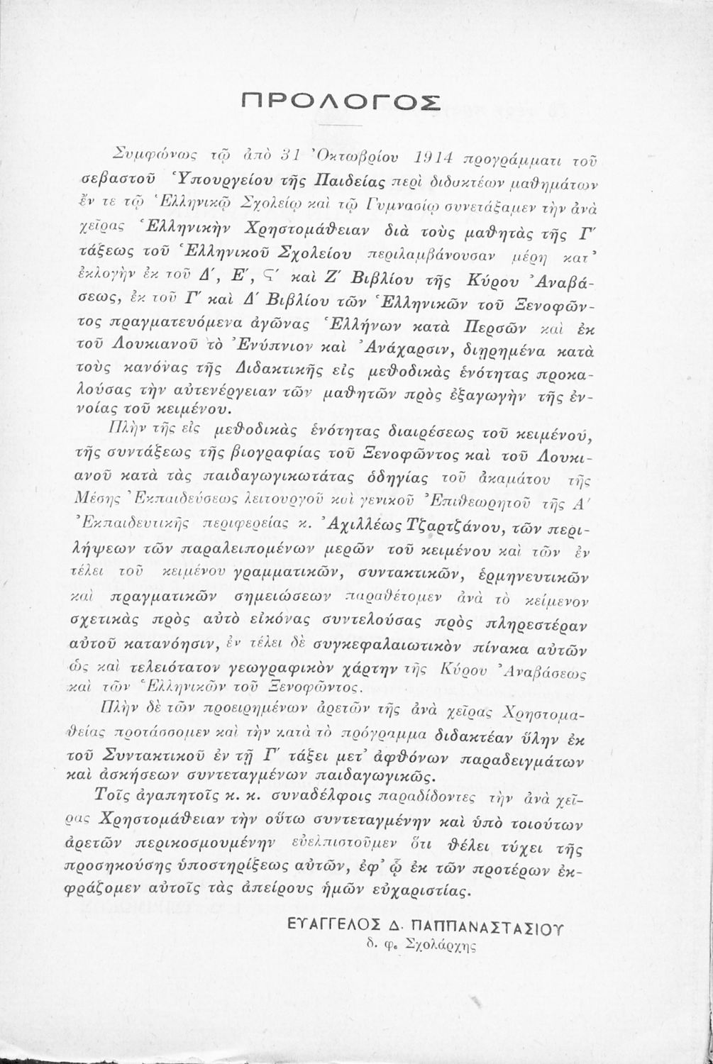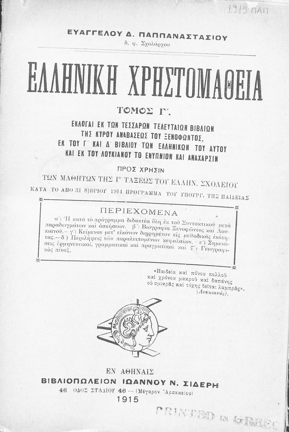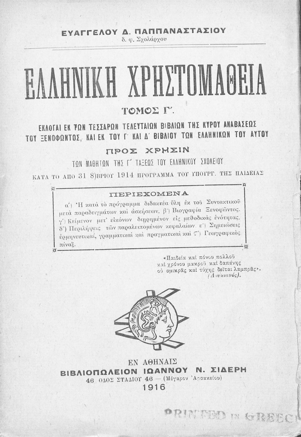 Σχολικό εγχειρίδιο Αρχαίων Ελληνικών Γ' Ελληνικού Σχολείου που περιλαμβάνει γραμματική της αρχαίας ελληνικής, αποσπάσματα από το έργο του Ξενοφώντα Ελληνικά και τα έργα του Λουκιανού Ενύπνιον και Ανάχαρσις, βιογραφικά σημειώματα των συγγραφέων, ερμηνευτικές και πραγματολογικές σημειώσεις.