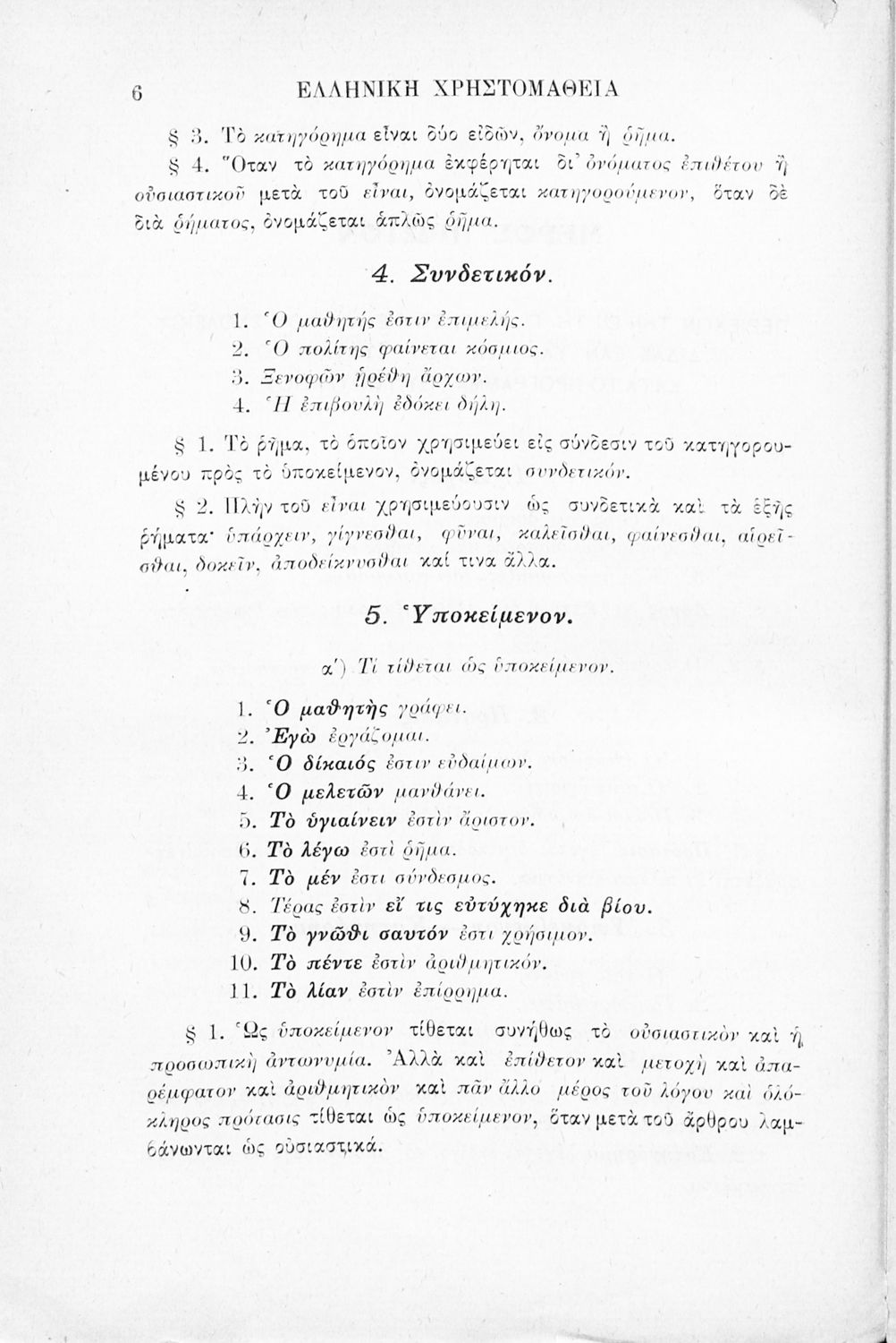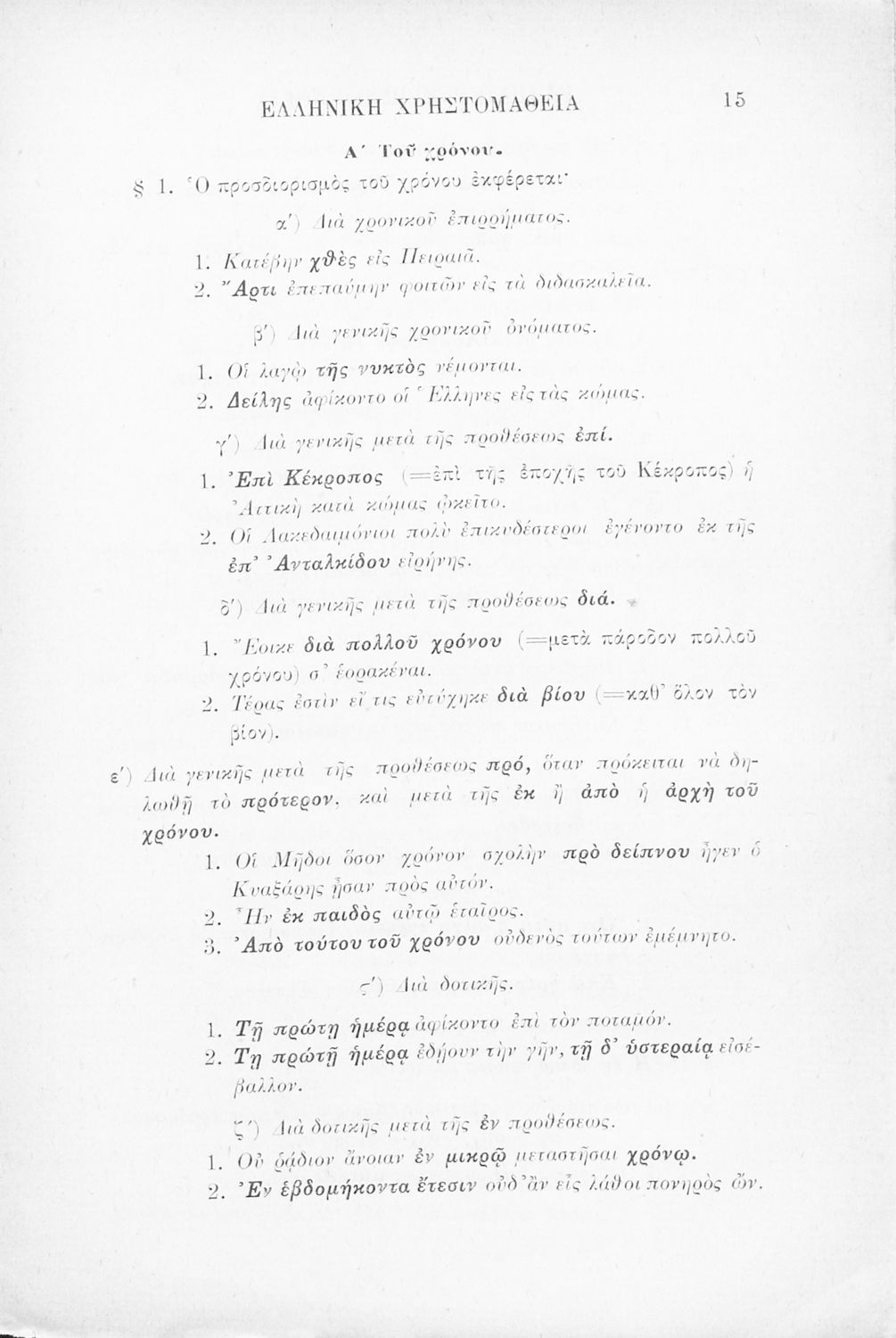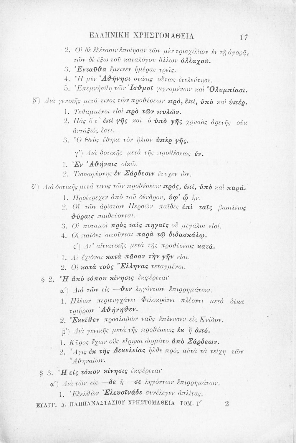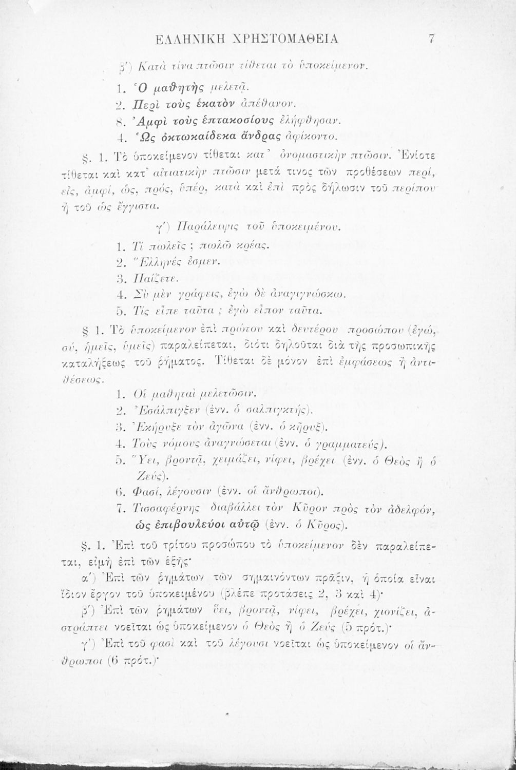 Σχολικό εγχειρίδιο Αρχαίων Ελληνικών Γ' Ελληνικού Σχολείου που περιλαμβάνει γραμματική της αρχαίας ελληνικής, αποσπάσματα από το έργο του Ξενοφώντα Ελληνικά και τα έργα του Λουκιανού Ενύπνιον και Ανάχαρσις, βιογραφικά σημειώματα των συγγραφέων, ερμηνευτικές και πραγματολογικές σημειώσεις.