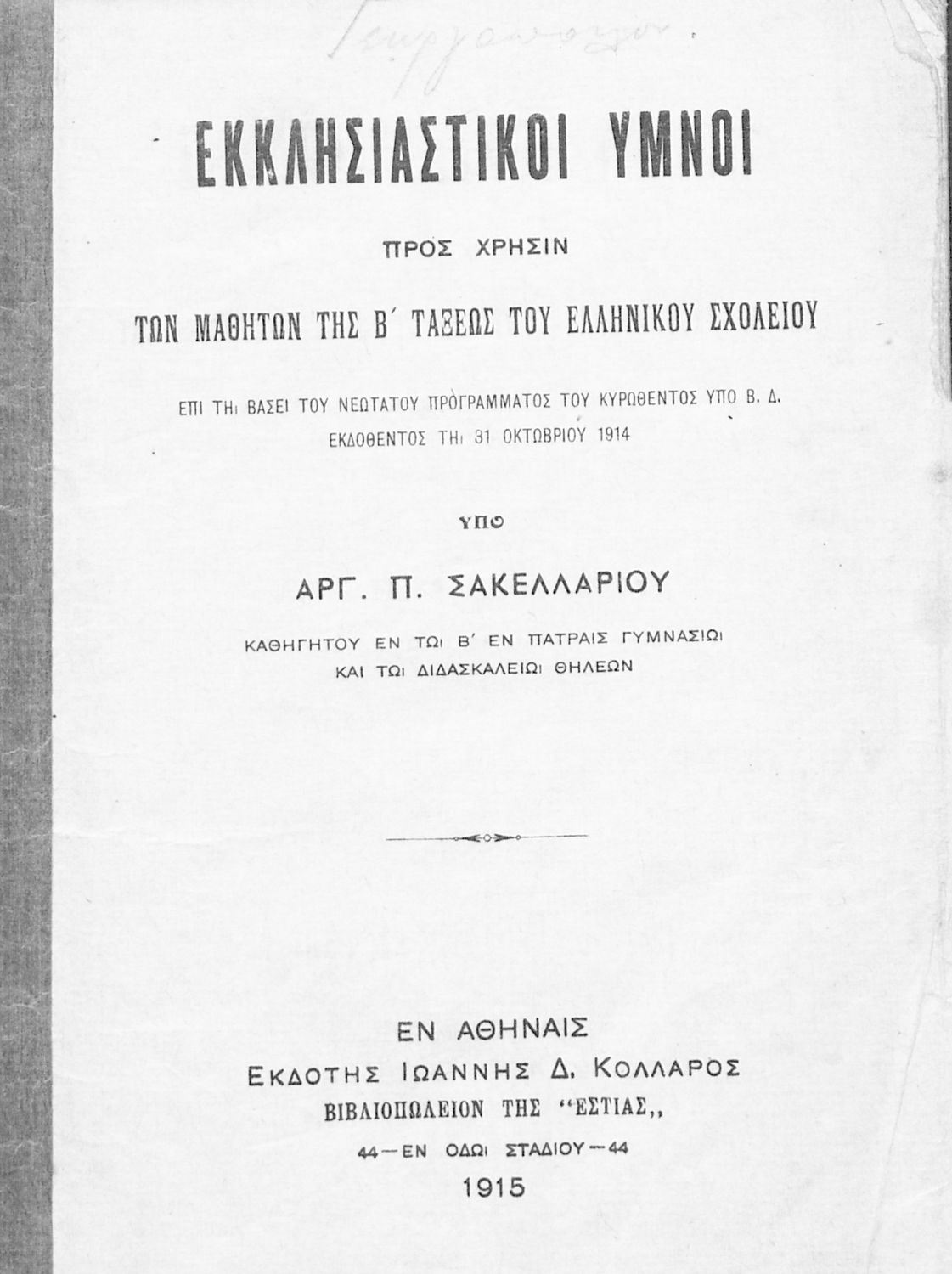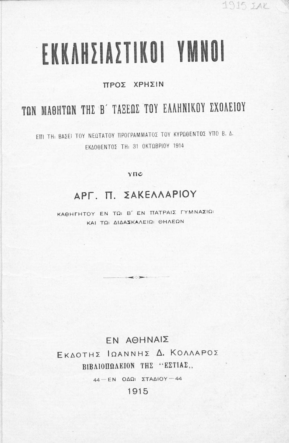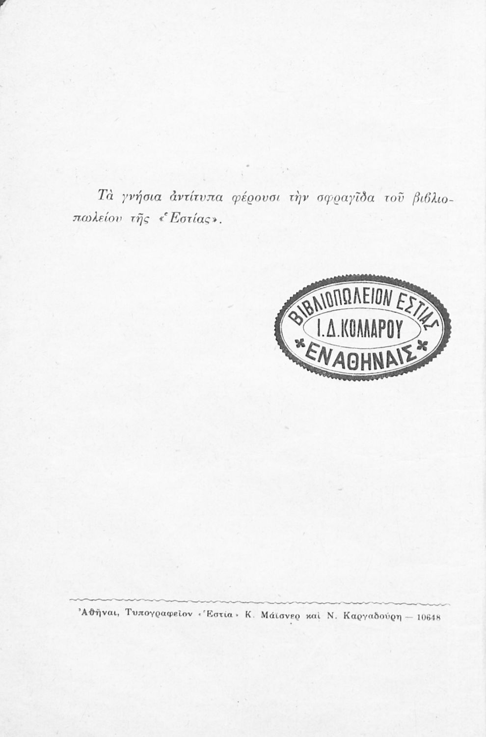 Εκδότης: Ιωάννης Δ. Κολλάρος Έτος έκδοσης: 1915 Τόπος έκδοσης: Αθήνα |