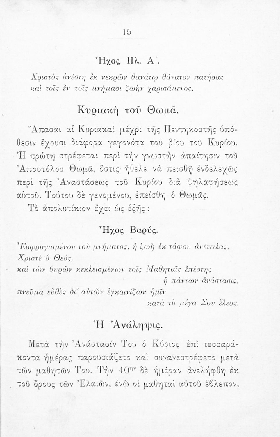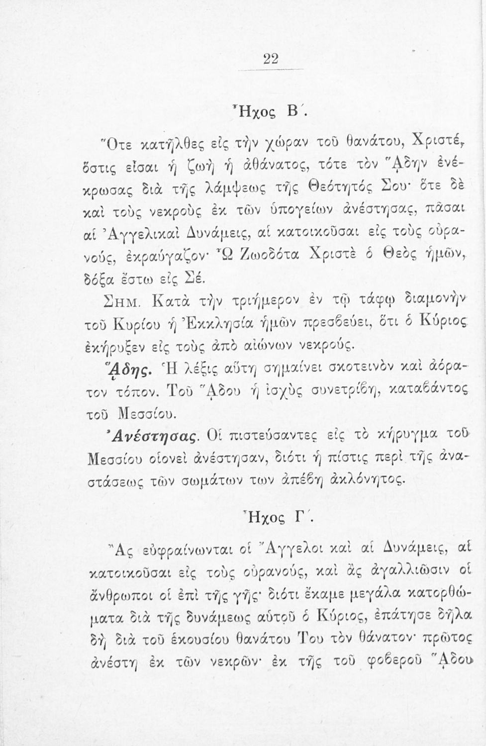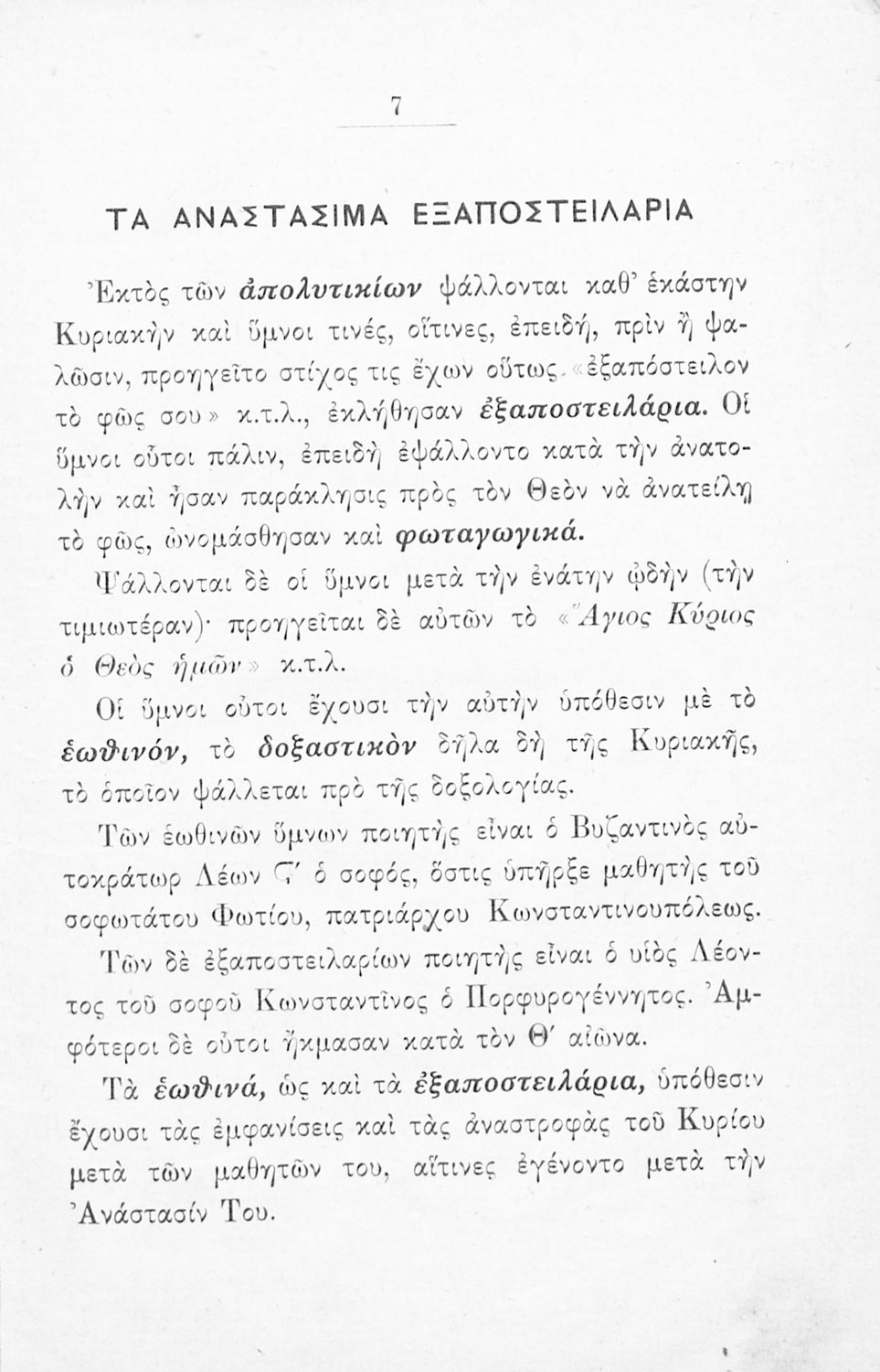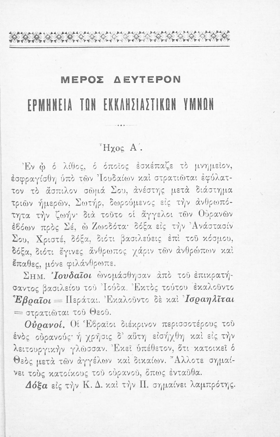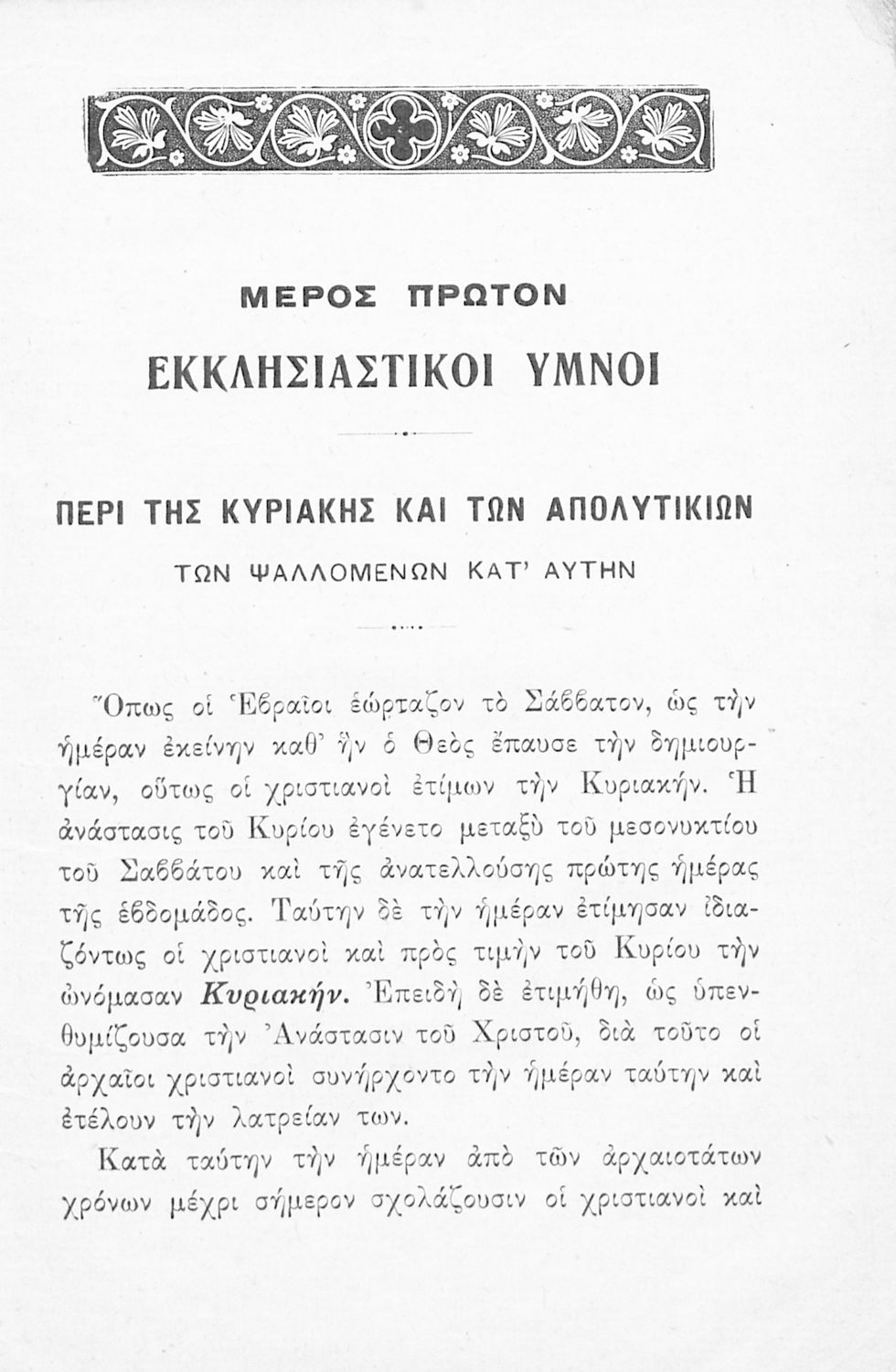 Σχολικό εγχειρίδιο Θρησκευτικών Β' Ελληνικού Σχολείου που περιλαμβάνει εκκλησιαστικούς ύμνους, απολυτίκια και αναστάσιμα εξαποστειλάρια και ερμηνευτικές σημειώσεις.