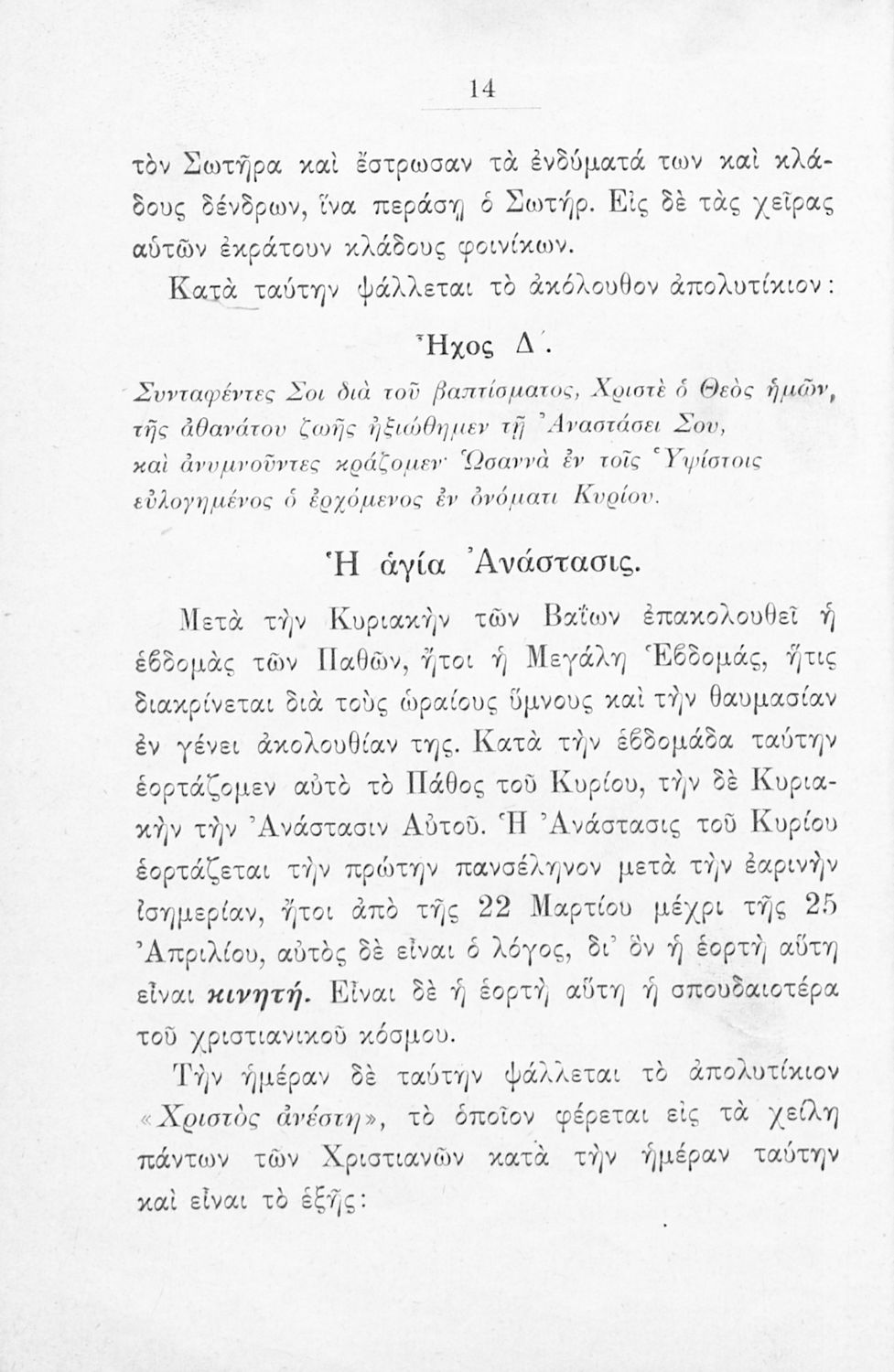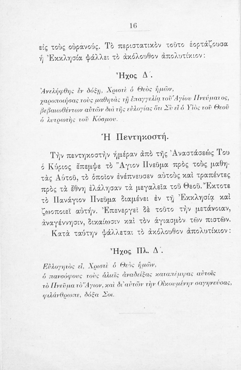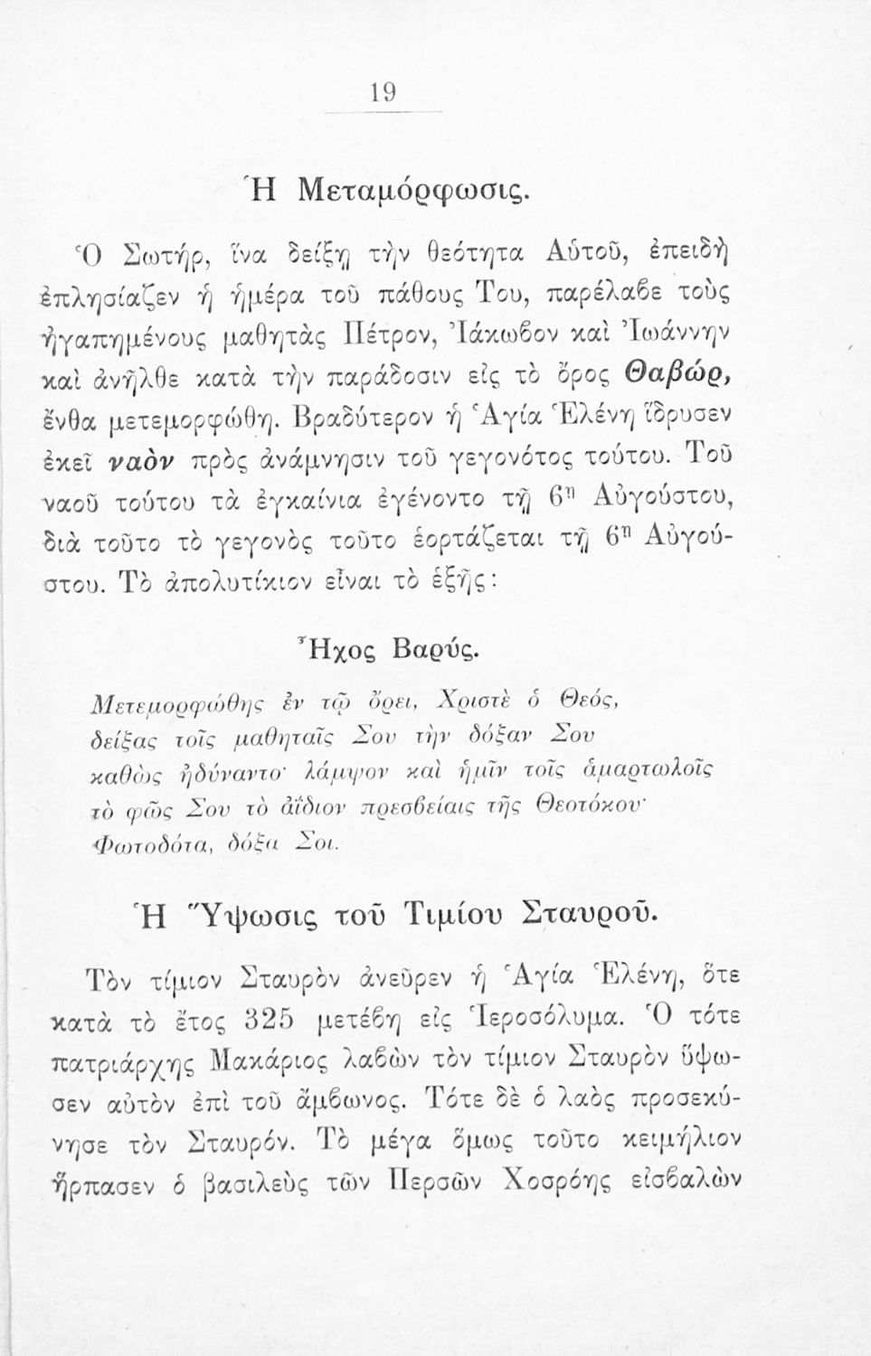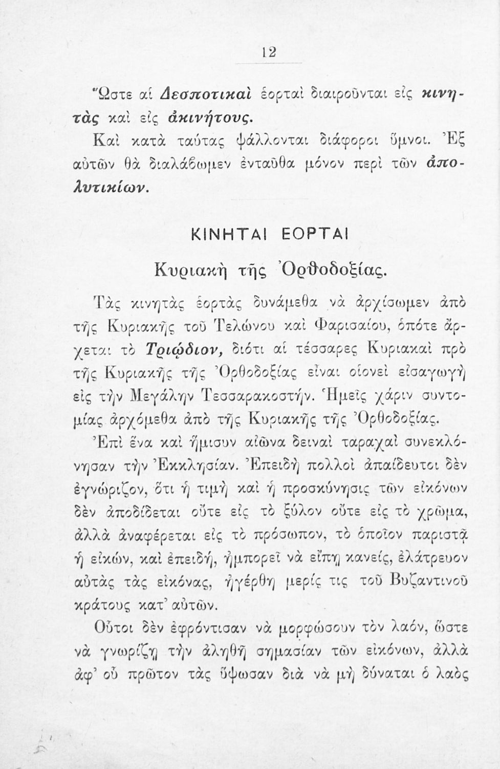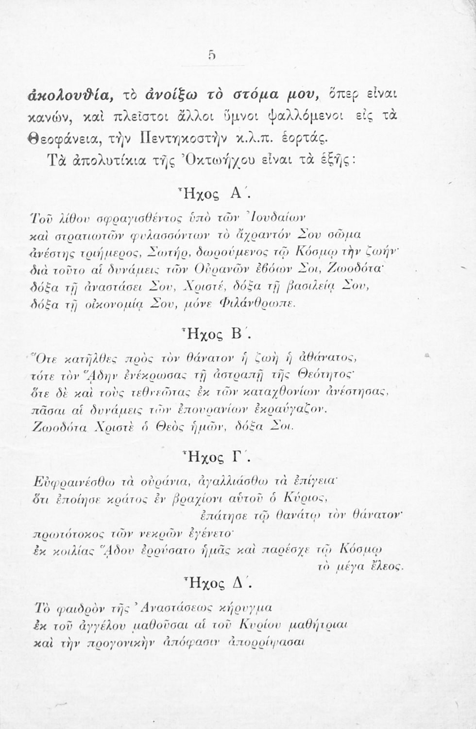 Σχολικό εγχειρίδιο Θρησκευτικών Β' Ελληνικού Σχολείου που περιλαμβάνει εκκλησιαστικούς ύμνους, απολυτίκια και αναστάσιμα εξαποστειλάρια και ερμηνευτικές σημειώσεις.
