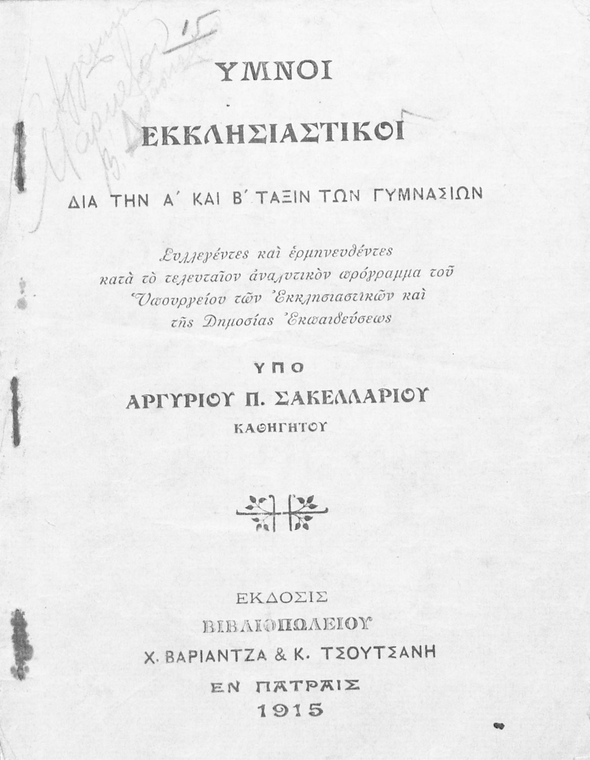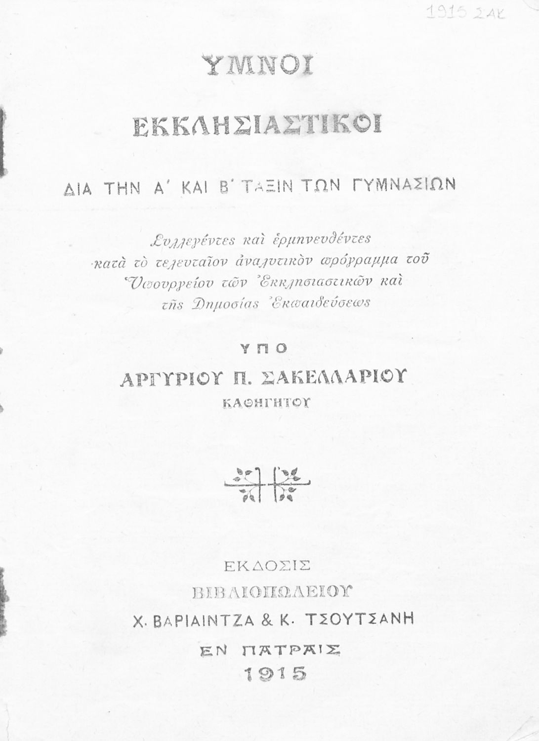 Εκδότης: Χ. Βαριαίντζας και Κ. Τσουτσάνης Έτος έκδοσης: 1915 Τόπος έκδοσης: Πάτρα |