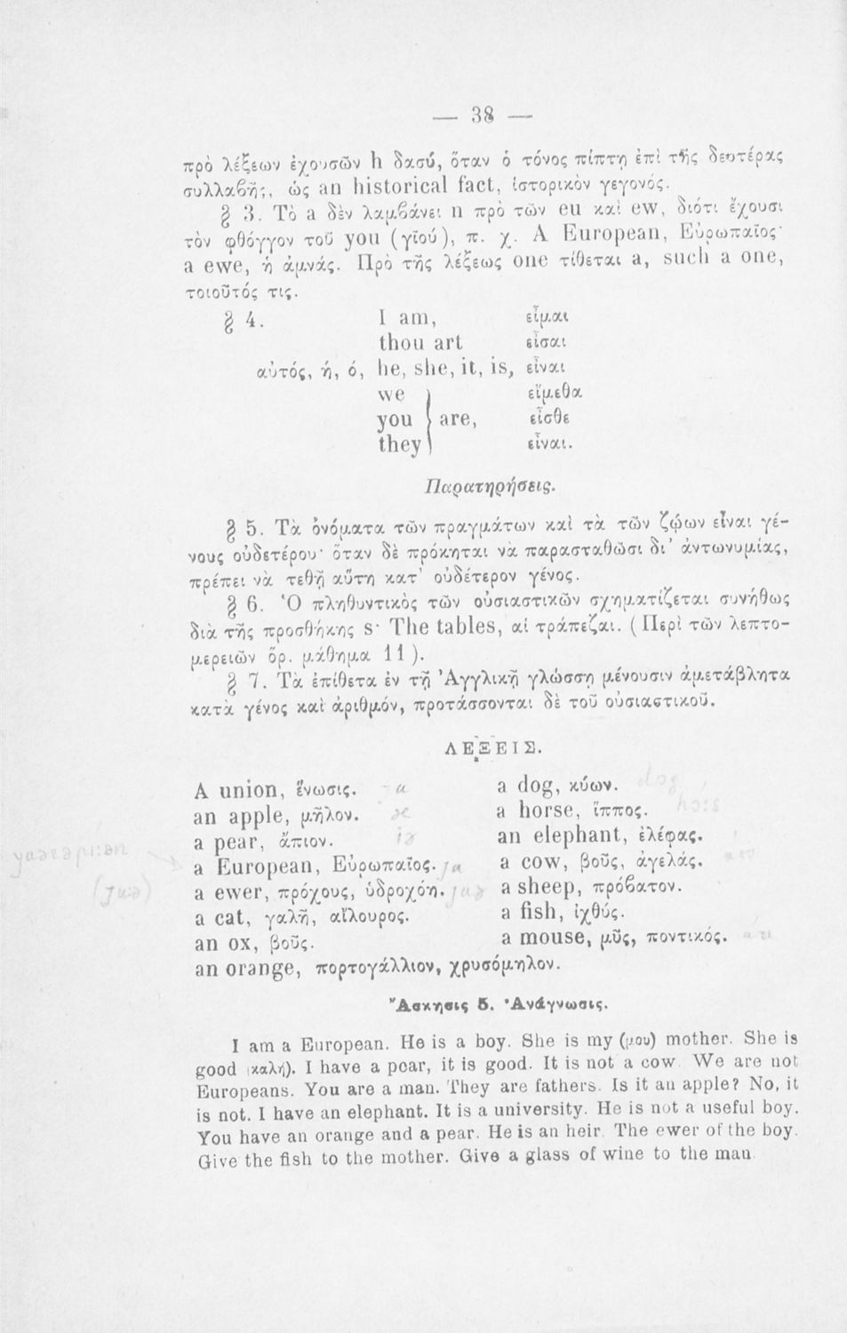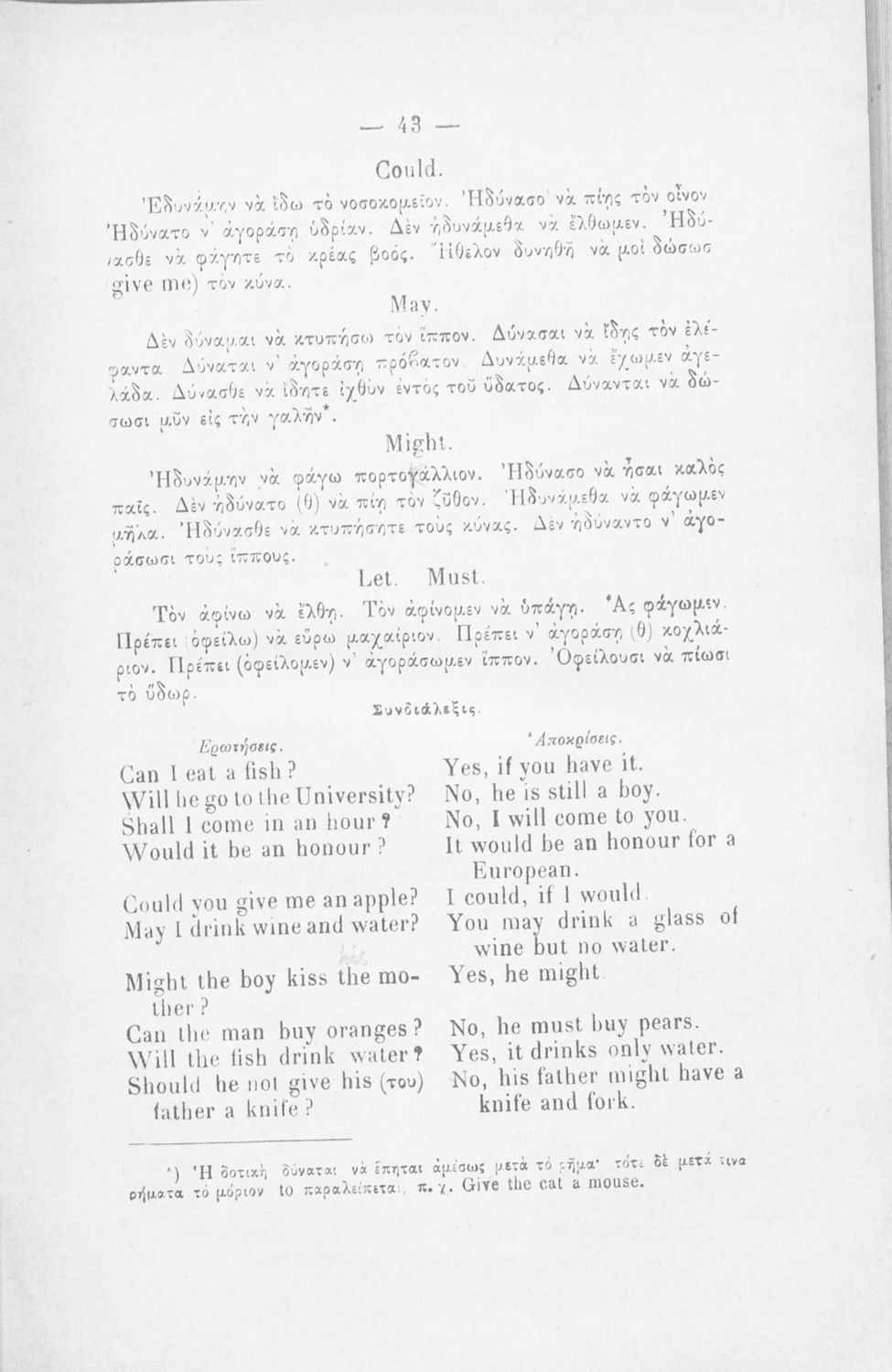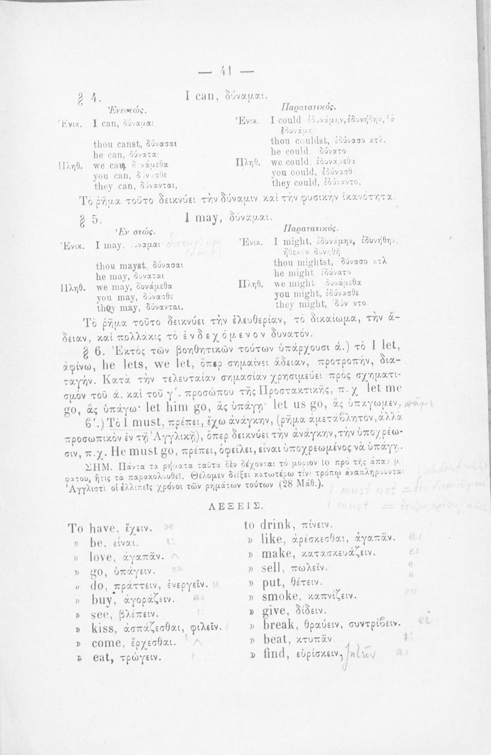 Παιδαγωγικό βοήθημα για το μάθημα των Αγγλικών. Το εγχειρίδιο περιλαμβάνει τους βασικούς κανόνες εκμάθησης της αγγλικής γλώσσας (συντακτικού και γραμματικής) και χωρίζεται σε 2 κύρια μέρη. Το πρώτο μέρος ασχολείται με την προφορά των γραμμάτων, με τα άρθρα, τα επιρρήματα, τις αντωνυμίες κ.α. Το δεύτερο μέρος εξειδικεύει την ύλη του πρώτου μέρους σε επιμέρους και ειδικότερα ζητήματα και δίδει συγκεκριμένα παραδείγματα γραφής επιστολών και γραμμάτων αλληλογραφίας στην αγγλική γλώσσα. Το εγχειρίδιο ολοκληρώνεται με αγγλοελληνικό και ελληνοαγγλικό λεξιλόγιο.
