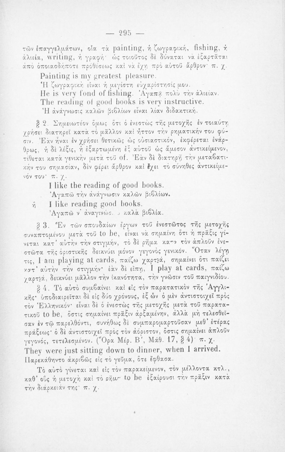 Παιδαγωγικό βοήθημα για το μάθημα των Αγγλικών. Το εγχειρίδιο περιλαμβάνει τους βασικούς κανόνες εκμάθησης της αγγλικής γλώσσας (συντακτικού και γραμματικής) και χωρίζεται σε 2 κύρια μέρη. Το πρώτο μέρος ασχολείται με την προφορά των γραμμάτων, με τα άρθρα, τα επιρρήματα, τις αντωνυμίες κ.α. Το δεύτερο μέρος εξειδικεύει την ύλη του πρώτου μέρους σε επιμέρους και ειδικότερα ζητήματα και δίδει συγκεκριμένα παραδείγματα γραφής επιστολών και γραμμάτων αλληλογραφίας στην αγγλική γλώσσα. Το εγχειρίδιο ολοκληρώνεται με αγγλοελληνικό και ελληνοαγγλικό λεξιλόγιο.