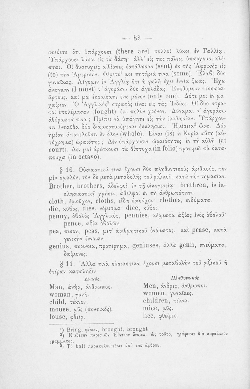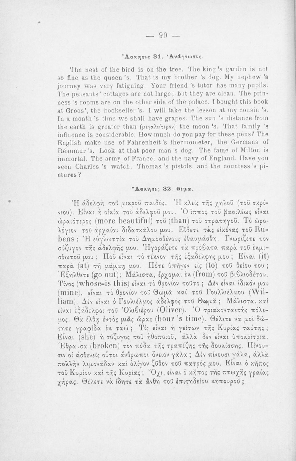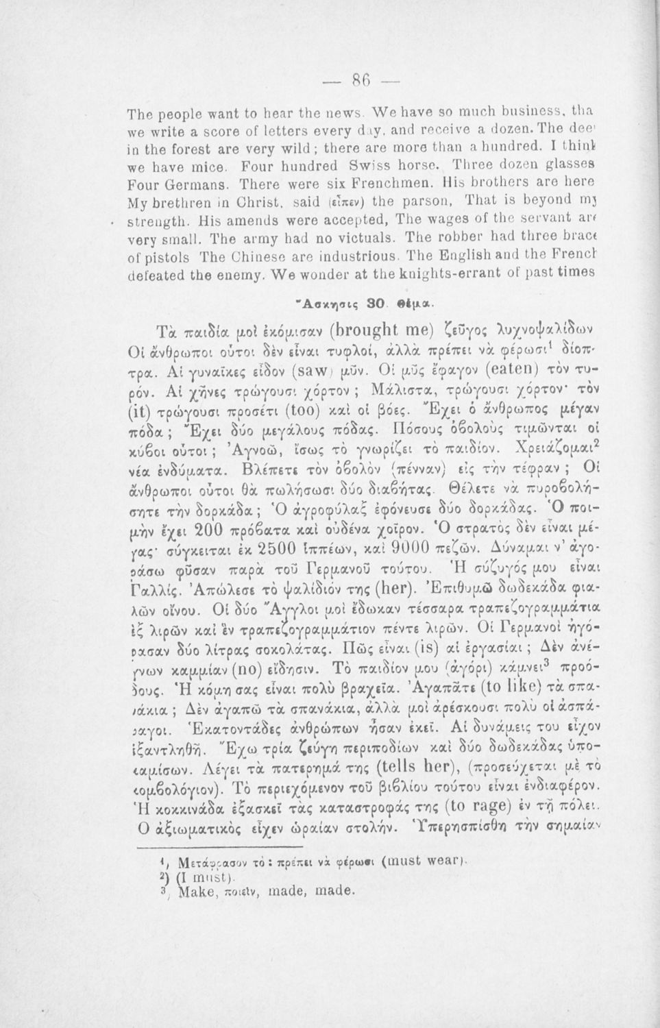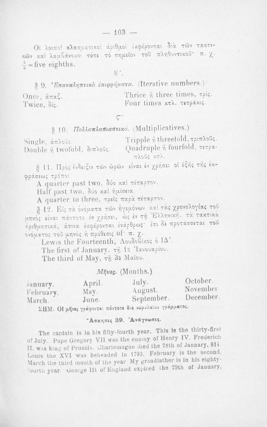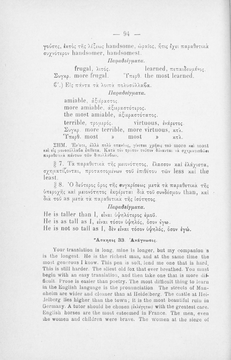 Μάθημα: Αγγλικά Γλώσσα: Καθαρεύουσα Παρουσίαση περιεχομένου: Παιδαγωγικό βοήθημα για το μάθημα των Αγγλικών. Το εγχειρίδιο περιλαμβάνει τους βασικούς κανόνες εκμάθησης της αγγλικής γλώσσας (συντακτικού και γραμματικής) και χωρίζεται σε 2 κύρια μέρη. Το πρώτο μέρος ασχολείται με την προφορά των γραμμάτων, με τα άρθρα, τα επιρρήματα, τις αντωνυμίες κ.α. Το δεύτερο μέρος εξειδικεύει την ύλη του πρώτου μέρους σε επιμέρους και ειδικότερα ζητήματα και δίδει συγκεκριμένα παραδείγματα γραφής επιστολών και γραμμάτων αλληλογραφίας στην αγγλική γλώσσα. Το εγχειρίδιο ολοκληρώνεται με αγγλοελληνικό και ελληνοαγγλικό λεξιλόγιο. |