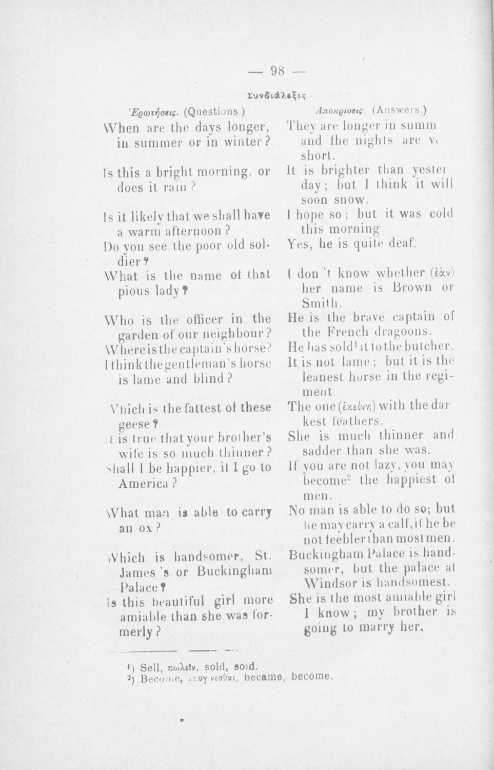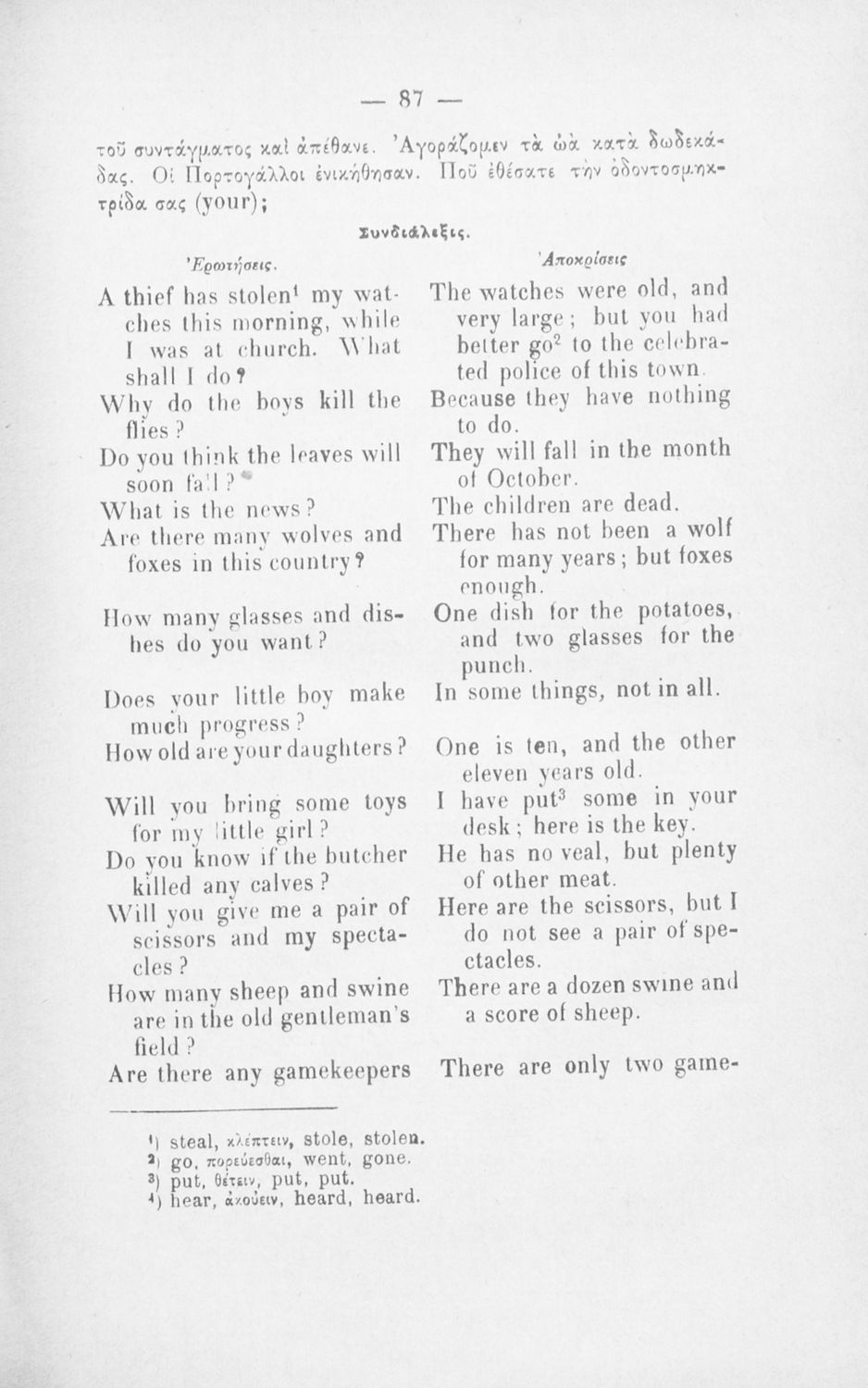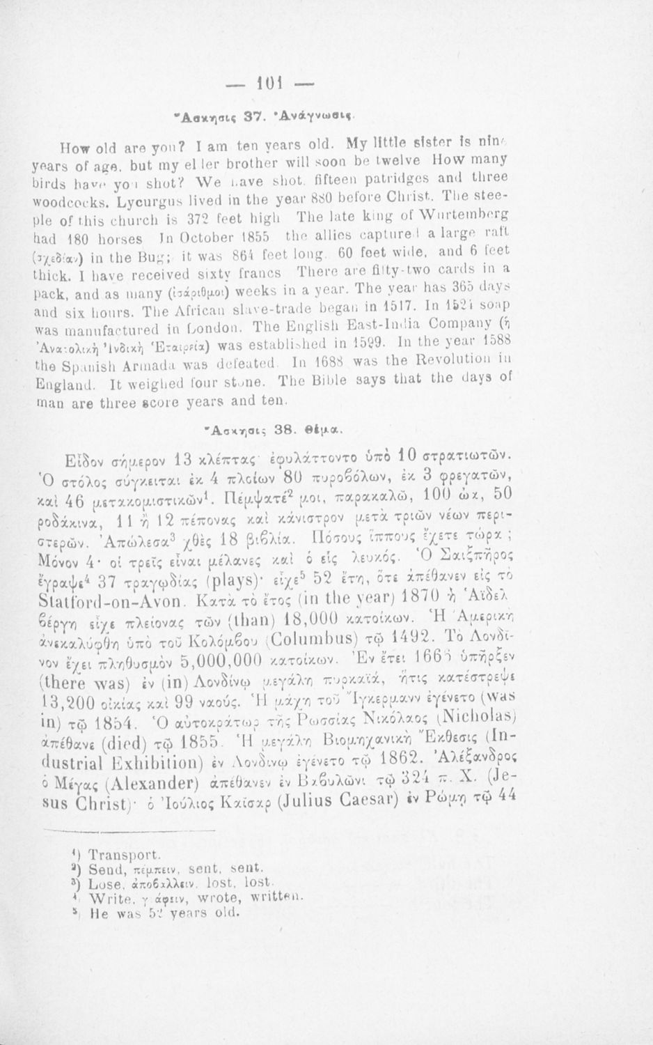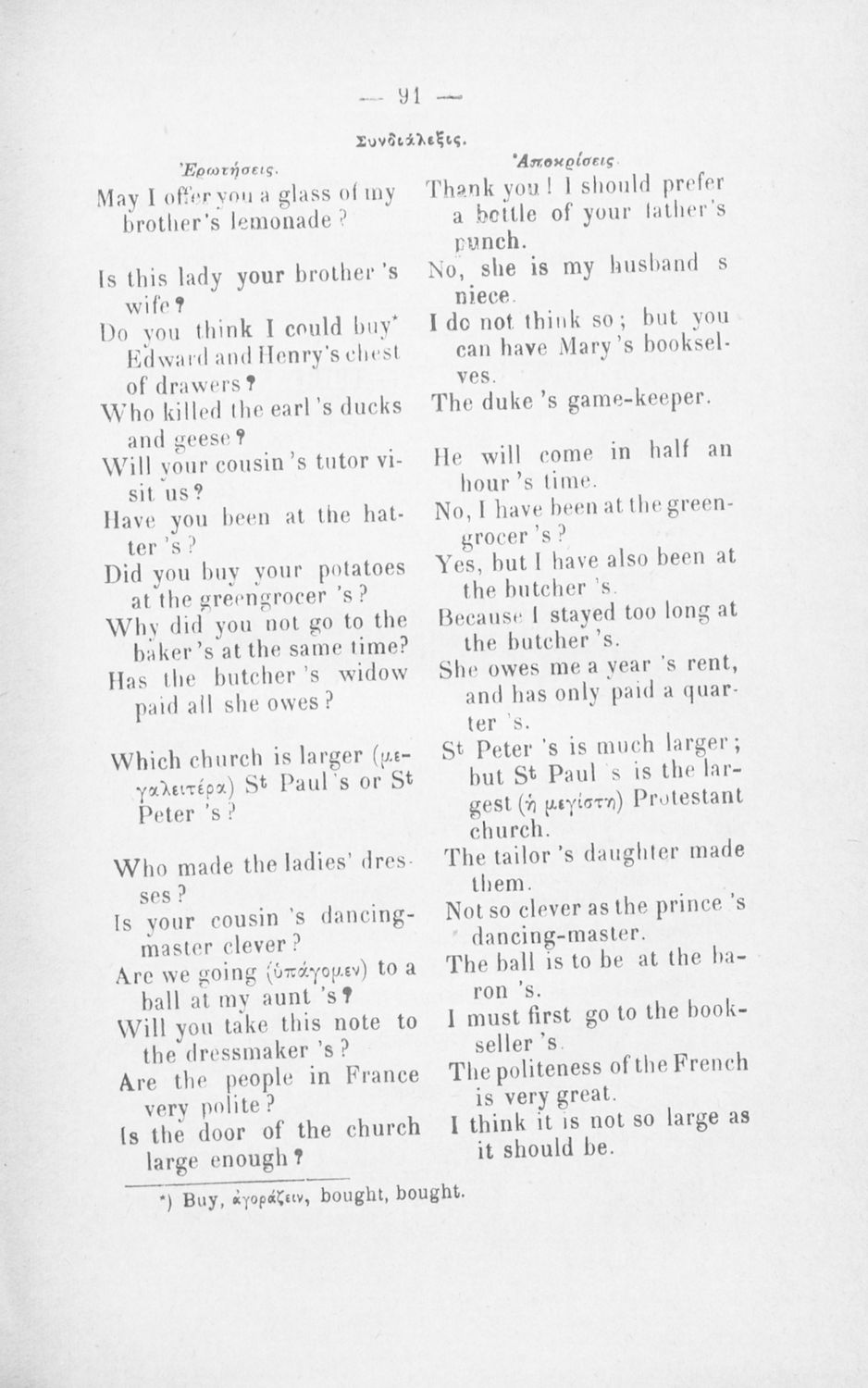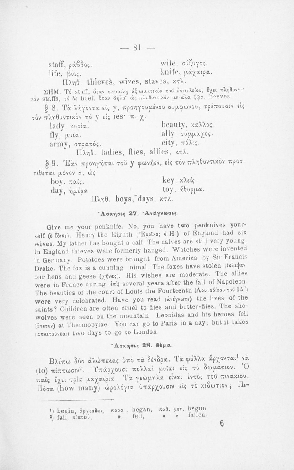 Μάθημα: Αγγλικά Γλώσσα: Καθαρεύουσα Παρουσίαση περιεχομένου: Παιδαγωγικό βοήθημα για το μάθημα των Αγγλικών. Το εγχειρίδιο περιλαμβάνει τους βασικούς κανόνες εκμάθησης της αγγλικής γλώσσας (συντακτικού και γραμματικής) και χωρίζεται σε 2 κύρια μέρη. Το πρώτο μέρος ασχολείται με την προφορά των γραμμάτων, με τα άρθρα, τα επιρρήματα, τις αντωνυμίες κ.α. Το δεύτερο μέρος εξειδικεύει την ύλη του πρώτου μέρους σε επιμέρους και ειδικότερα ζητήματα και δίδει συγκεκριμένα παραδείγματα γραφής επιστολών και γραμμάτων αλληλογραφίας στην αγγλική γλώσσα. Το εγχειρίδιο ολοκληρώνεται με αγγλοελληνικό και ελληνοαγγλικό λεξιλόγιο. |