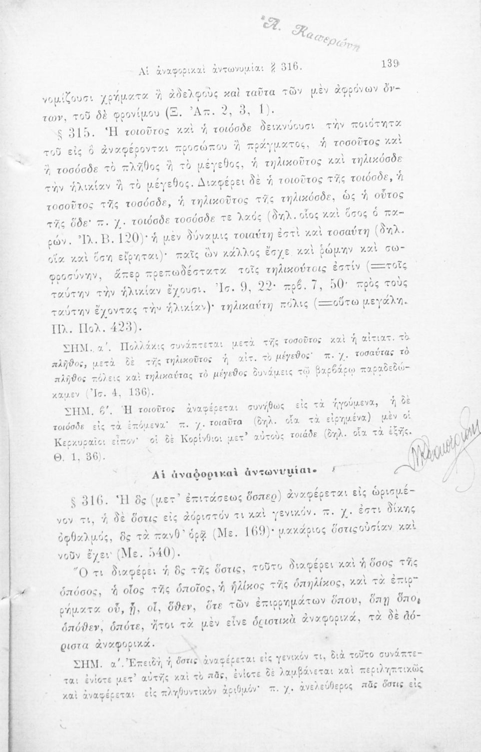 Σχολικό εγχειρίδιο Αρχαίων Ελληνικών για τα Ελληνικά Σχολεία, Παρθεναγωγεία και Γυμνάσια που περιέχει τους κανόνες γραμματικής και είναι χωρισμένο σε φθογγολογικό, τυπολογικό και ετυμολογικό μέρος.