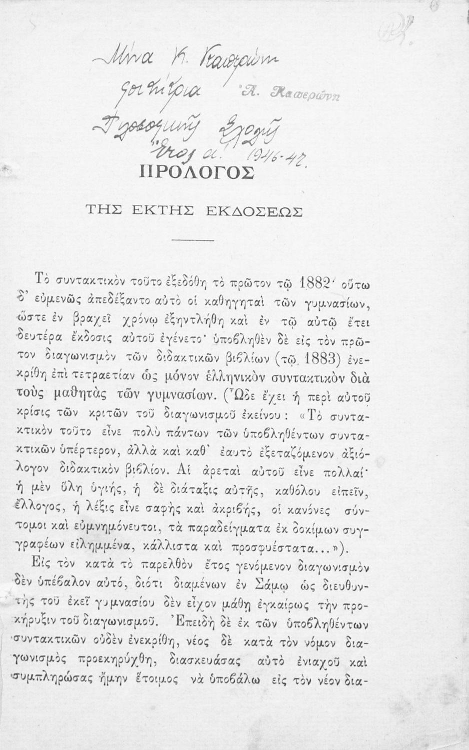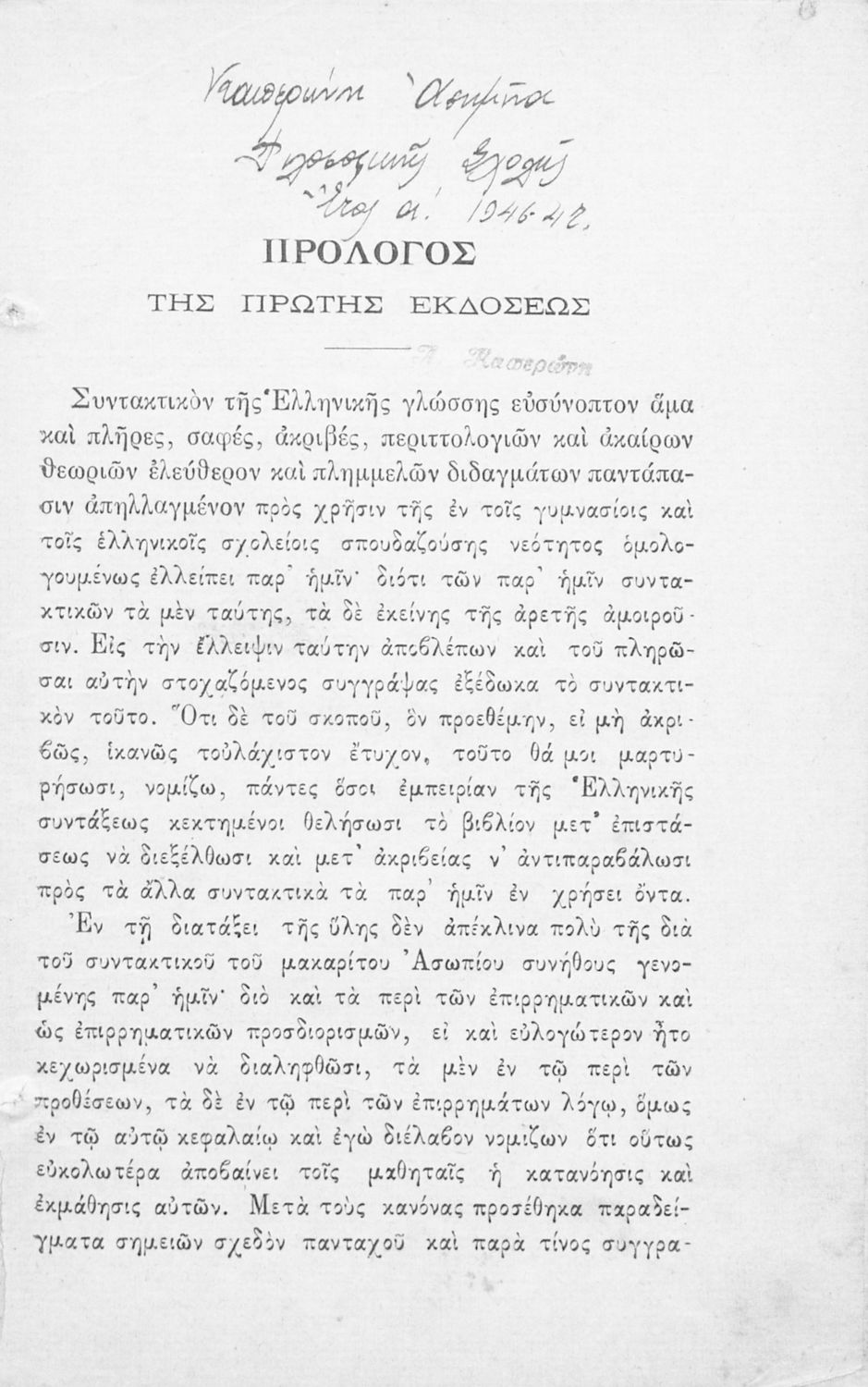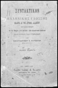 Σχολικό εγχειρίδιο Αρχαίων Ελληνικών για τα Ελληνικά Σχολεία, Παρθεναγωγεία και Γυμνάσια που περιέχει τους κανόνες γραμματικής και είναι χωρισμένο σε φθογγολογικό, τυπολογικό και ετυμολογικό μέρος.