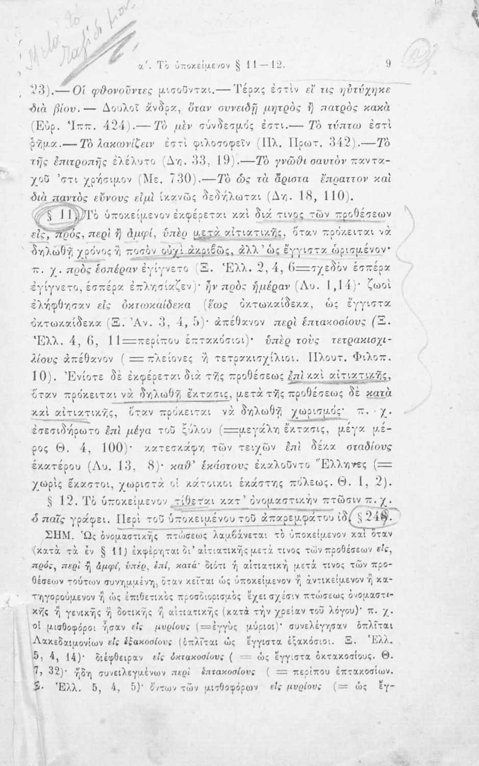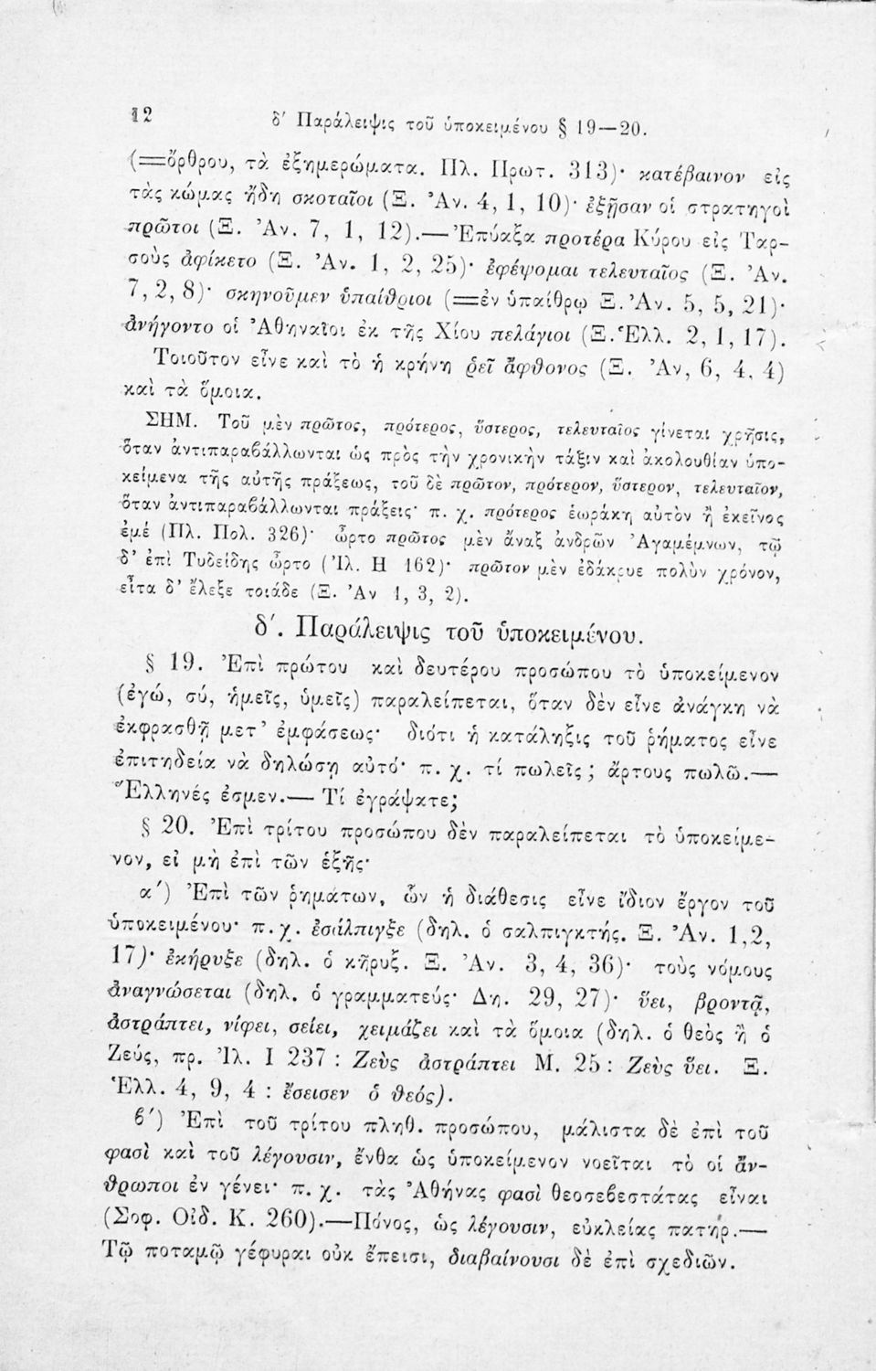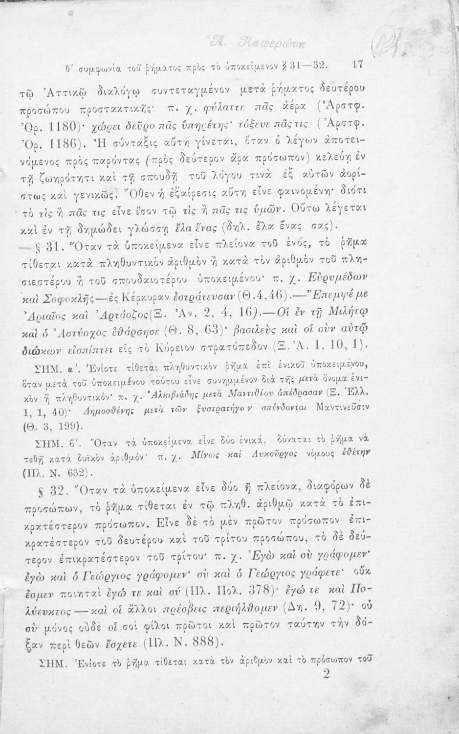 Σχολικό εγχειρίδιο Αρχαίων Ελληνικών για τα Ελληνικά Σχολεία και τα Ανώτερα Παρθεναγωγεία που εξετάζει τα μέρη του λόγου και την σύνταξή τους.
