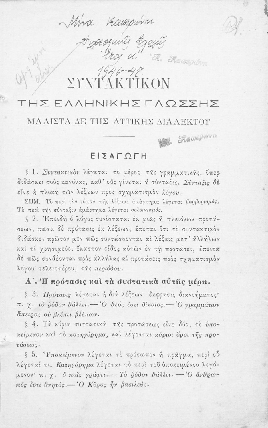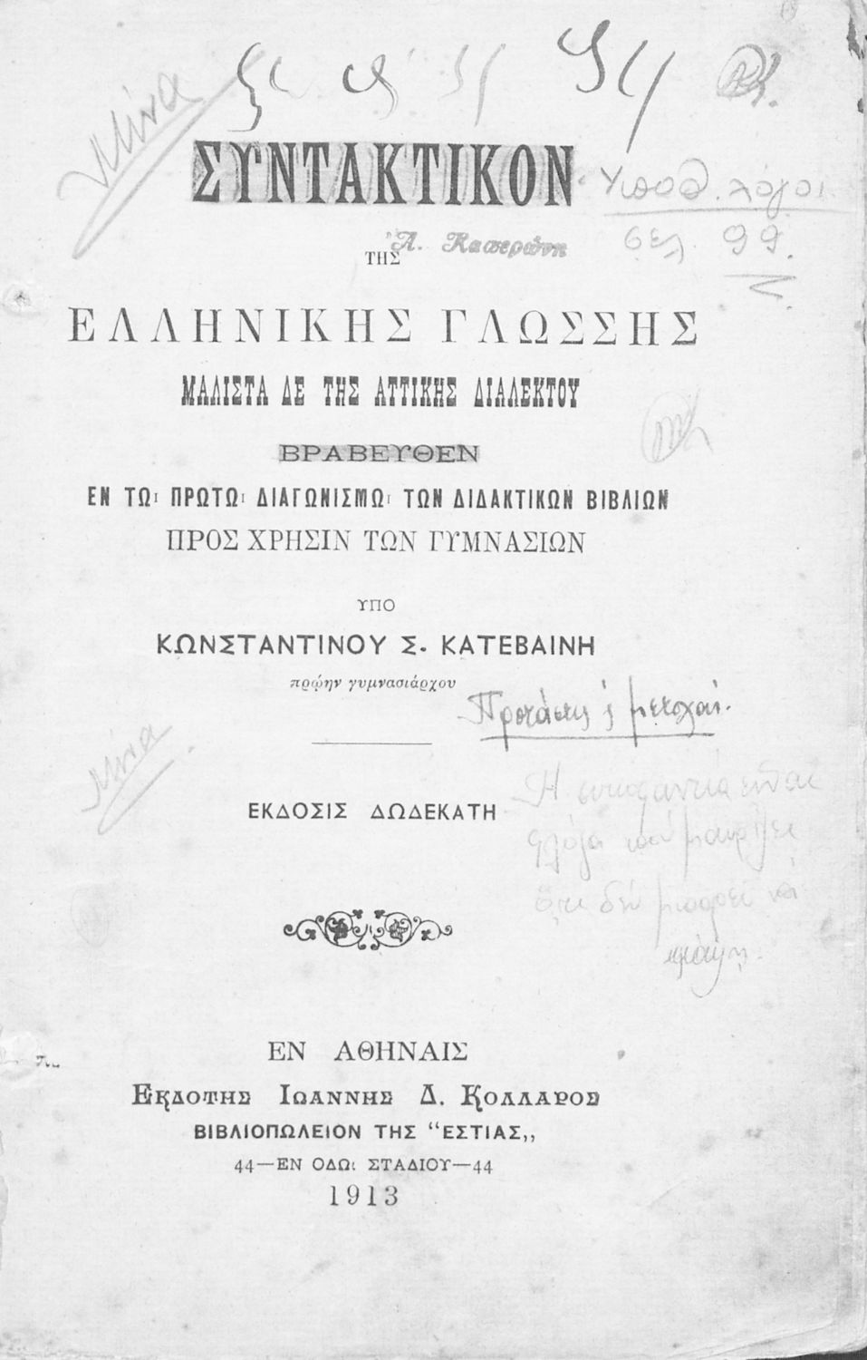 Τίτλος: Συντακτικόν της ελληνικής γλώσσης μάλιστα δε της αττικής διαλέκτου προς χρήσιν των Γυμνασίων