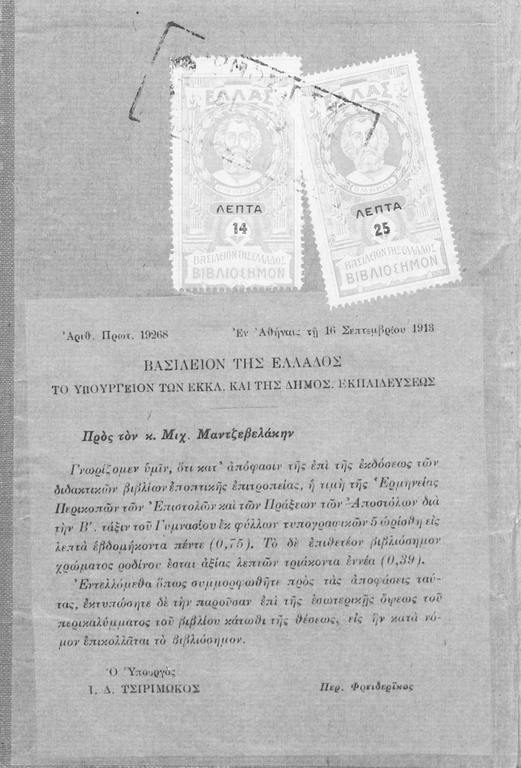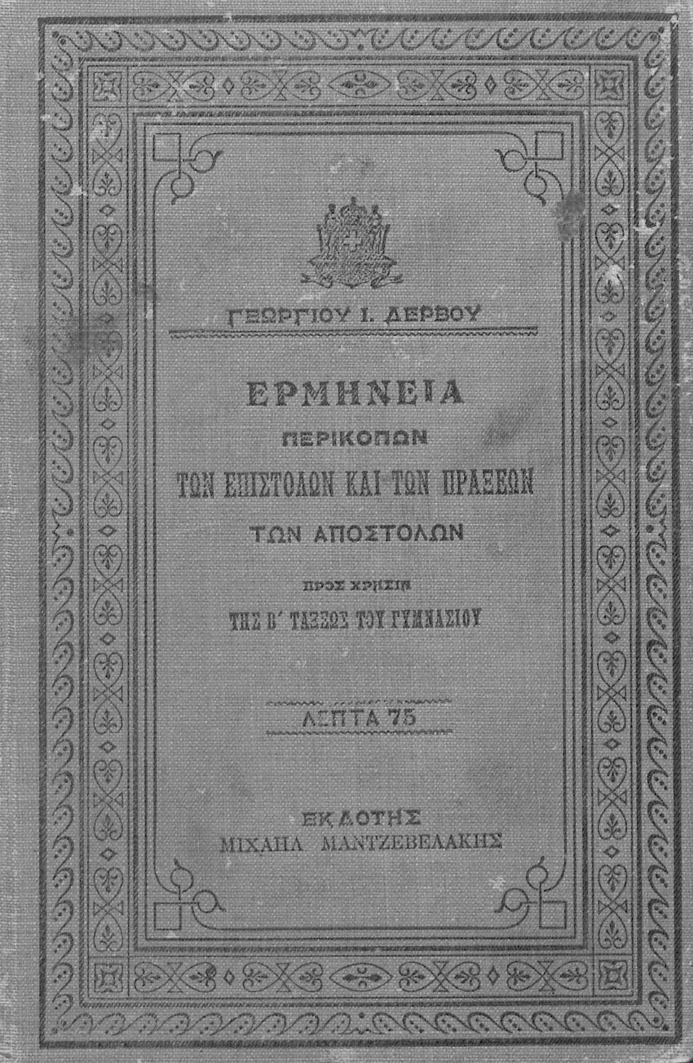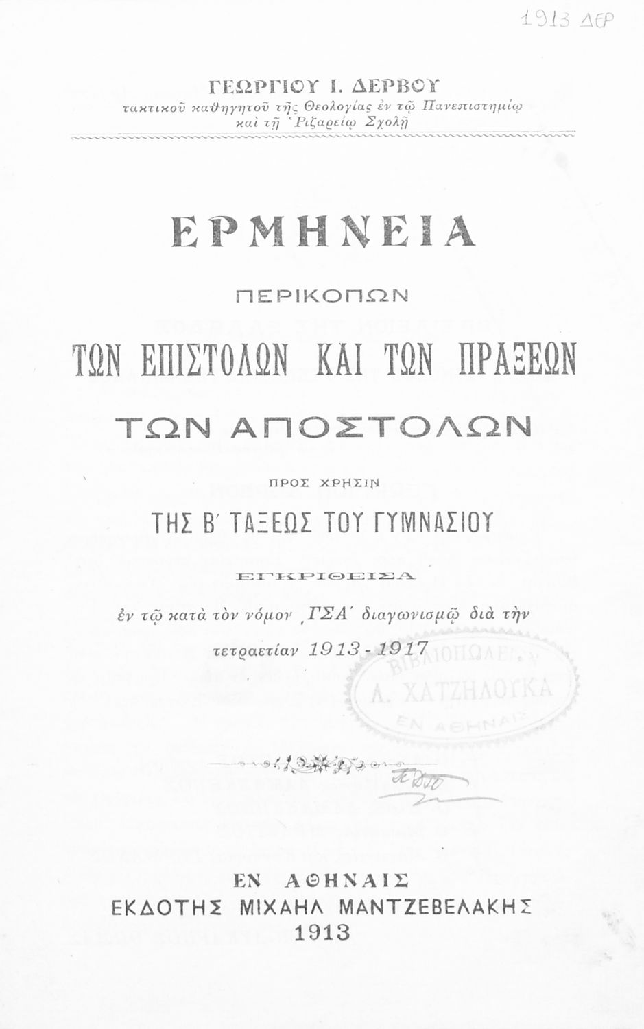 Εκδότης: Μιχαήλ Μαντζαβελάκης Έτος έκδοσης: 1913 Τόπος έκδοσης: Αθήνα Υπουργική απόφαση / Σύμβαση: 19268/16-9-1913 |