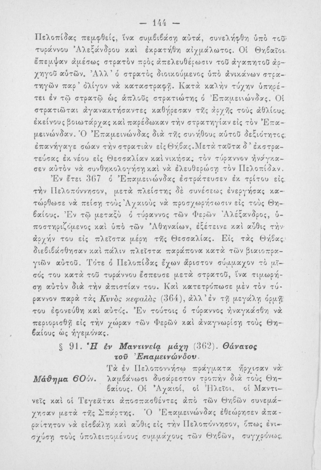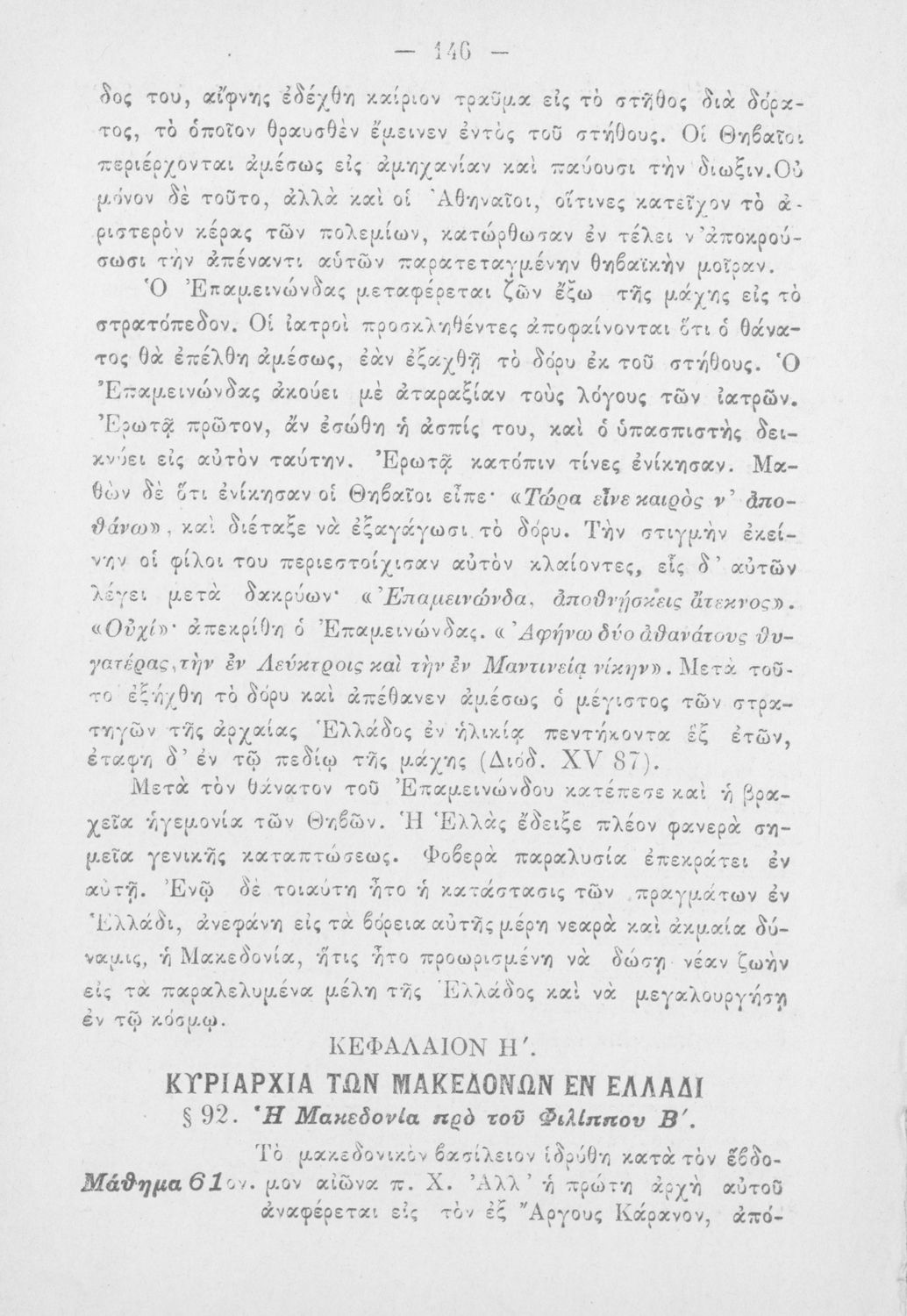 Σχολικό εγχειρίδιο Ιστορίας Α΄ Ελληνικού και Παρθεναγωγείου που καλύπτει την περίοδο από τους μυθικούς και ηρωικούς χρόνους μέχρι την μάχη της Μαντινείας και τον θάνατο του Επαμεινώνδα.