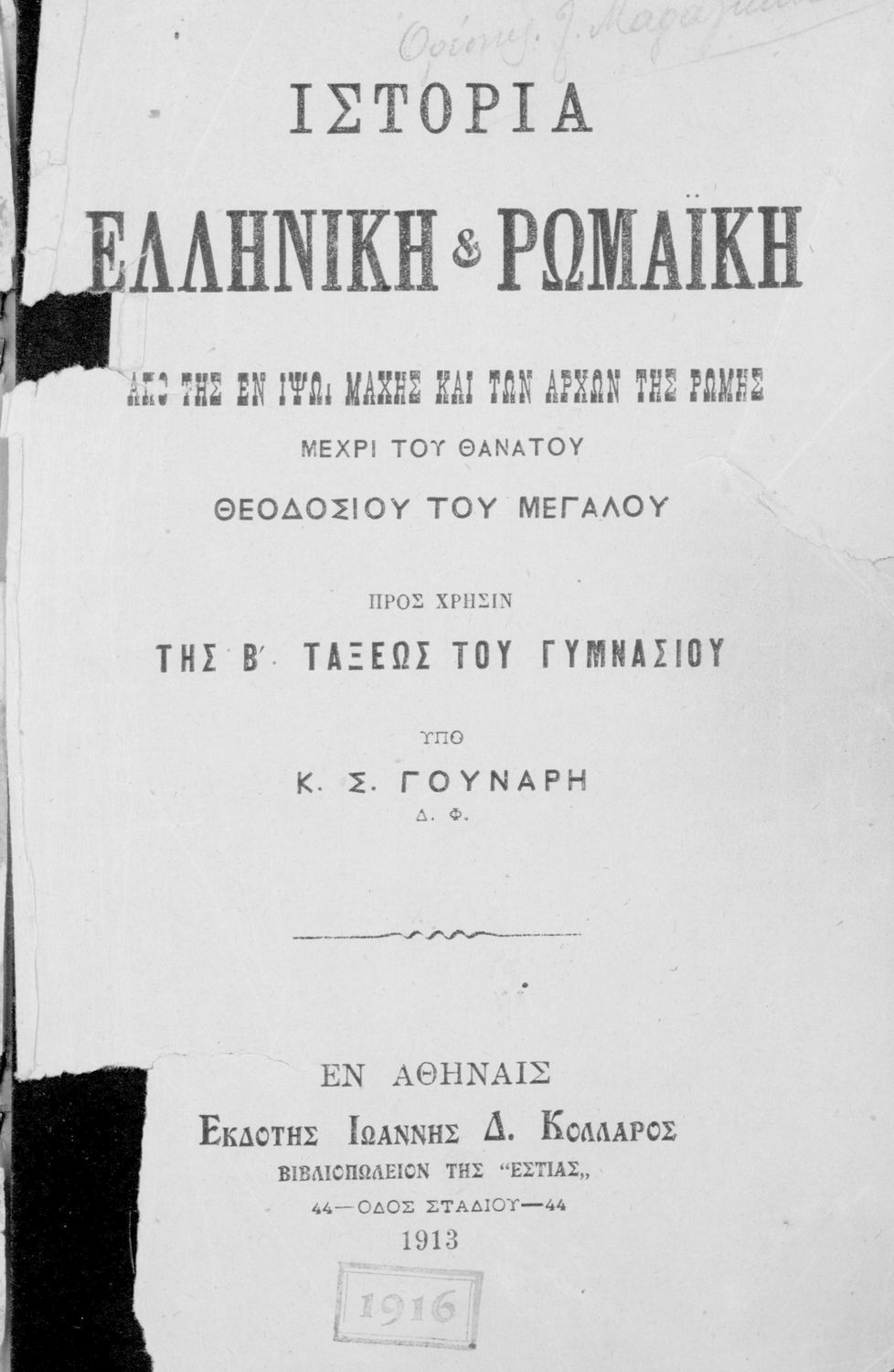 Τίτλος: Ιστορία ελληνική και ρωμαϊκή από της εν Ιψώ μάχης και των αρχών της Ρώμης μέχρι του θανάτου του Θεοδοσίου του Μεγάλου προς χρήσιν της Β΄ τάξεως του γυμνασίου