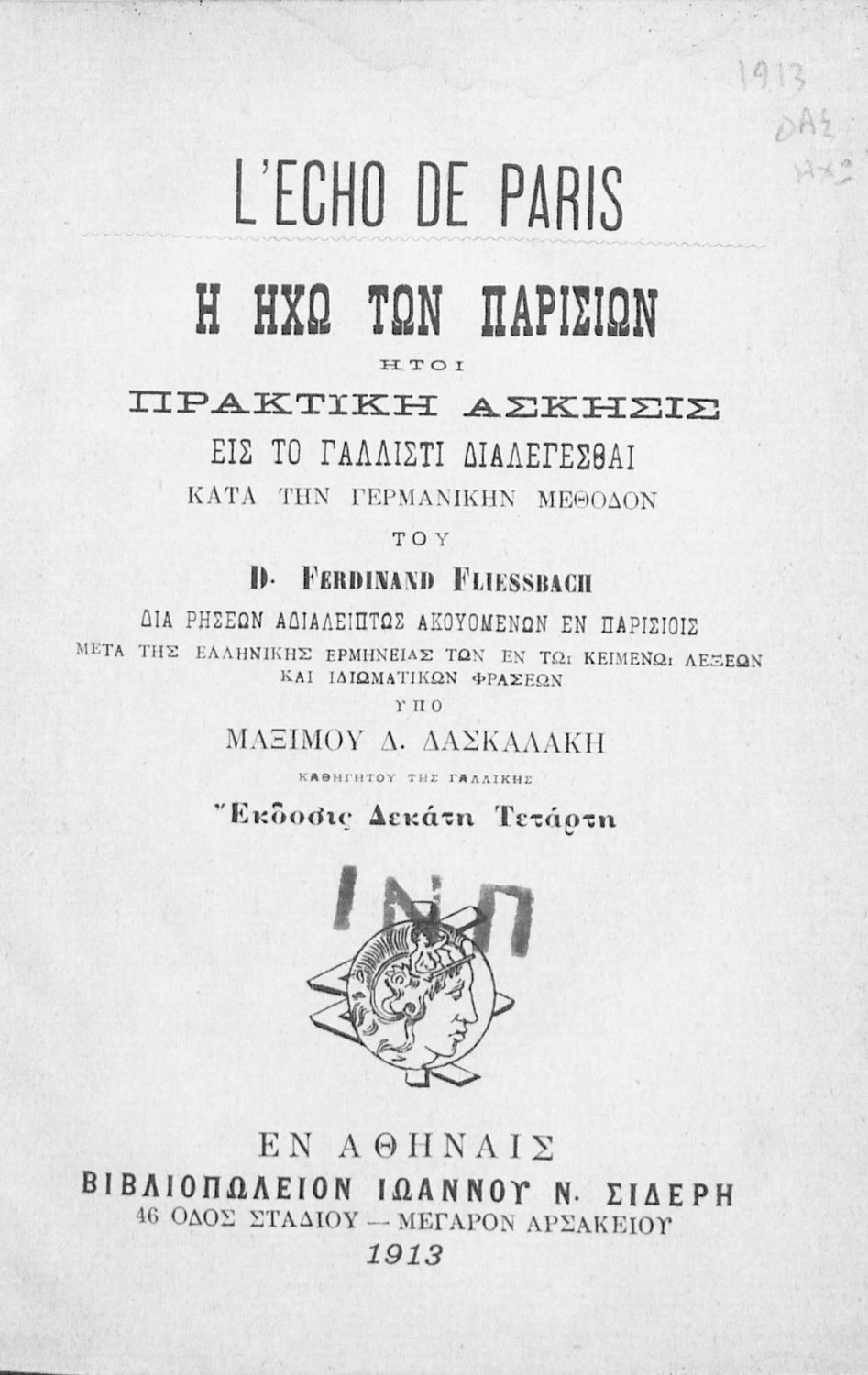 Κωδικός αναγνώρισης: 02-02129 Τίτλος: L΄ echo de Paris, Η Ηχώ των Παρισίων, ήτοι πρακτική άσκησις εις το γαλλιστί διαλέγεσθαι κατά την γερμανικήν μέθοδον του Ferninand Fliessbach, δια ρήσεων αδιαλείπτως ακουομένων εν Παρισίοις, μετά της ελληνικής ερμηνείας των εν τω κειμένω λέξεων και ιδιωματικών φράσεων Συγγραφέας: Μάξιμος Δ. Δασκαλάκης (μετάφραση- επιμέλεια) Μέγεθος και υπόστρωμα: Παιδαγωγικό βοήθημα, σκληρό εξώφυλλο, 312 σελίδες. |
