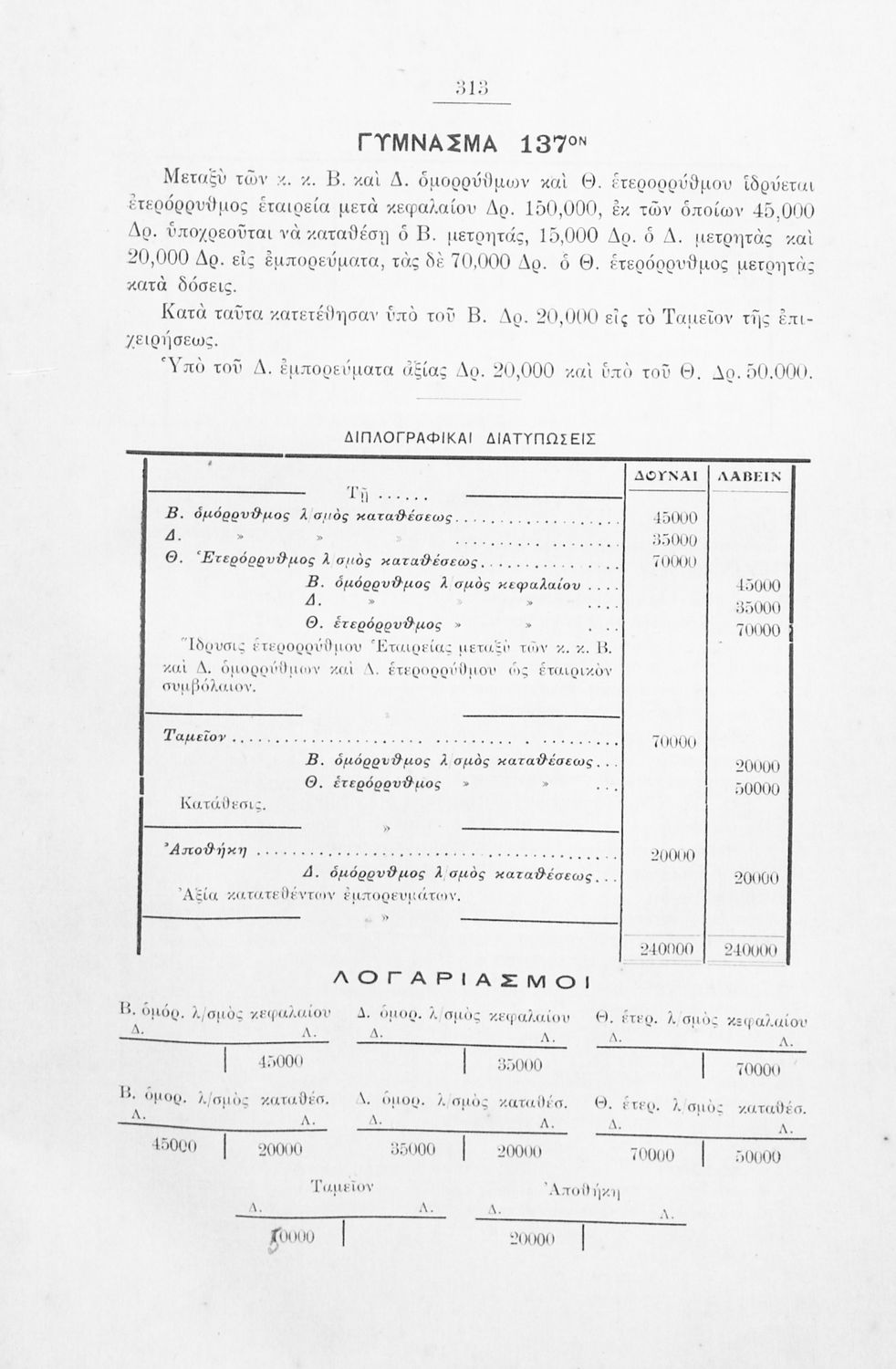 Παρουσίαση περιεχομένου: Εγχειρίδιο που στόχο είχε τη θεωρητική και πρακτική εξοικείωση και εξάσκηση εμπόρων, βιομηχάνων, τραπεζιτών, καθώς και σπουδαστών εμπορικών σχολών στη λογιστική επιστήμη. Το βιβλίο περιλαμβάνει τρόπους υπολογισμού των λογιστικών των εταιριών καθώς και σειρά ασκήσεων για πρακτική εξάσκηση.