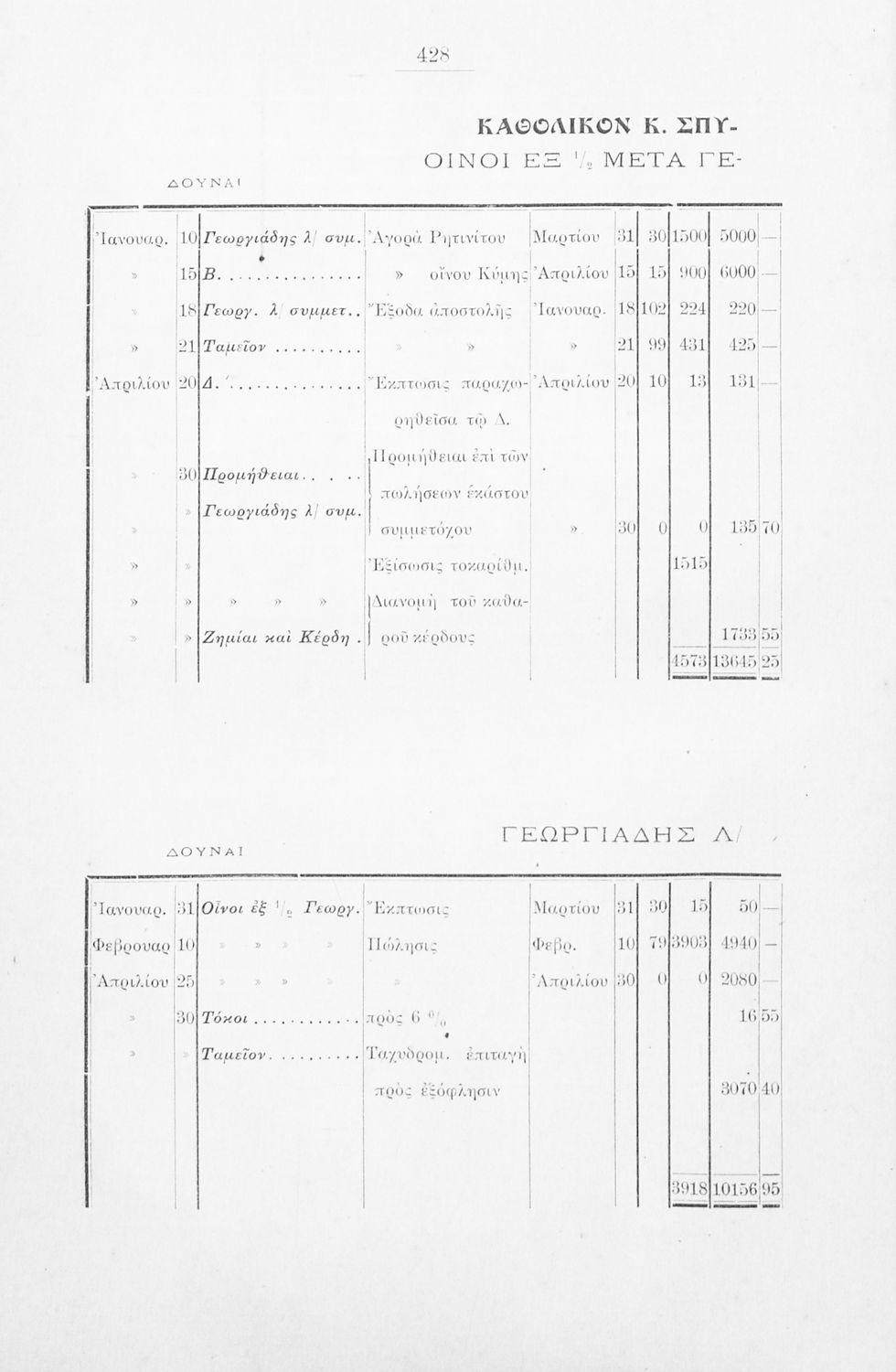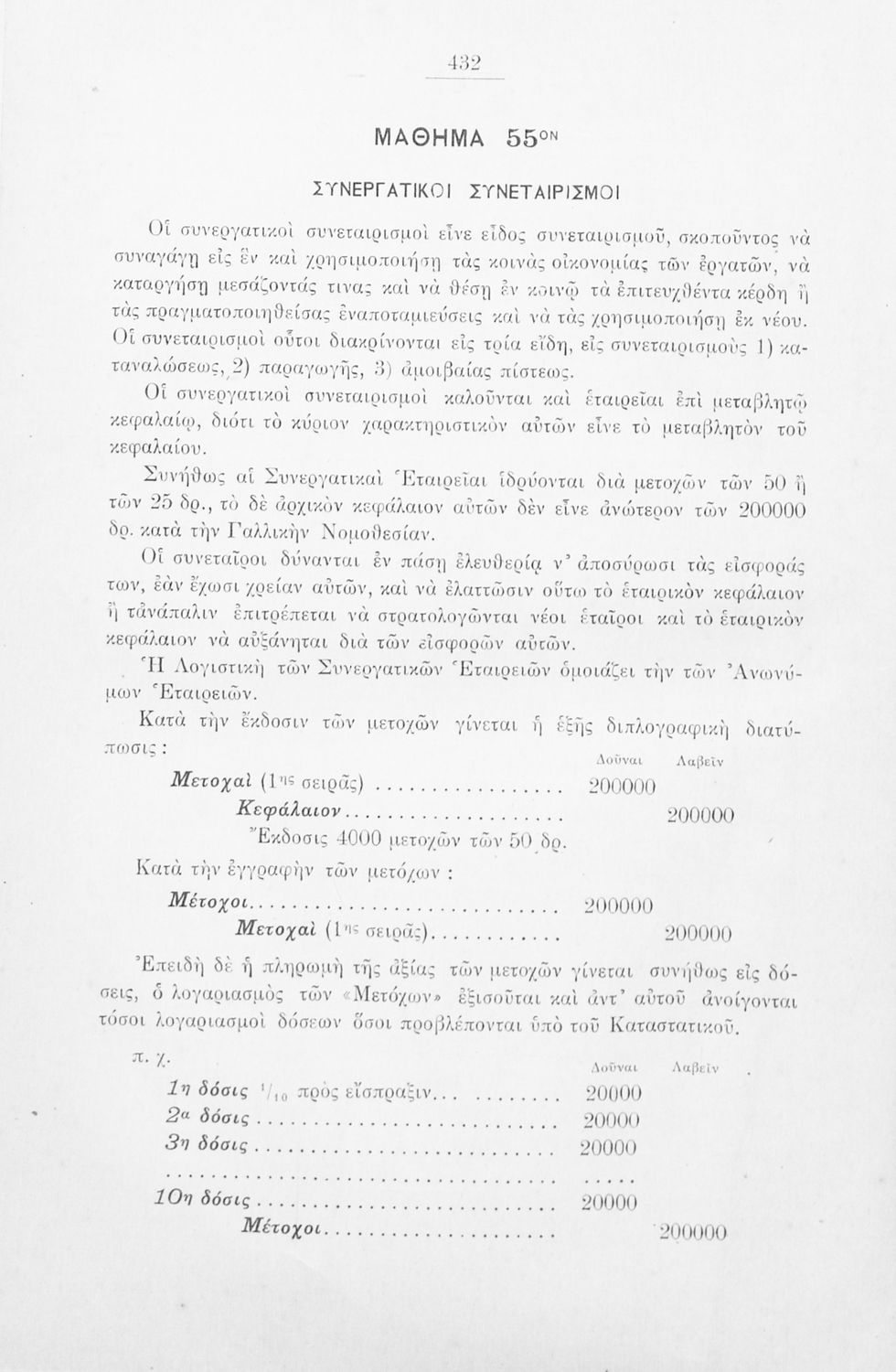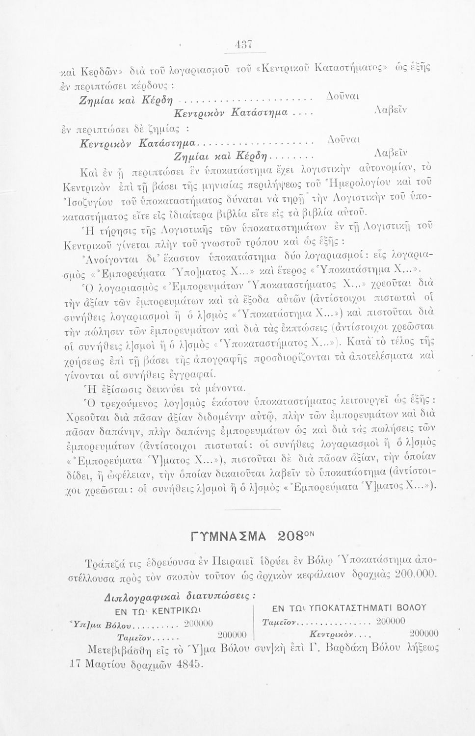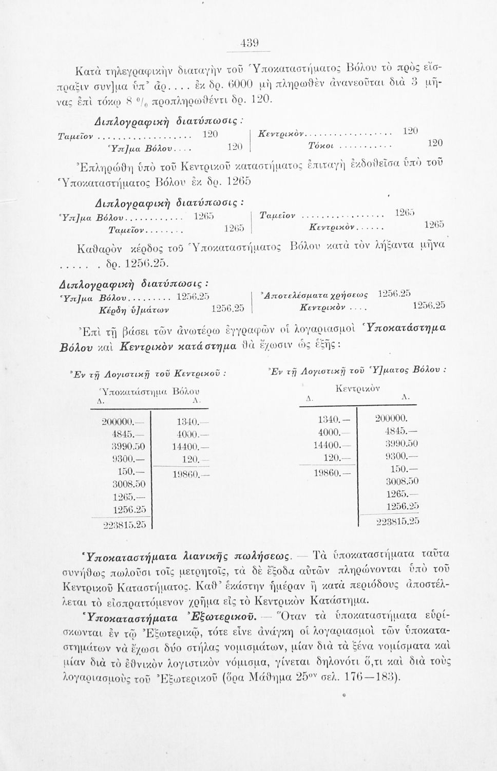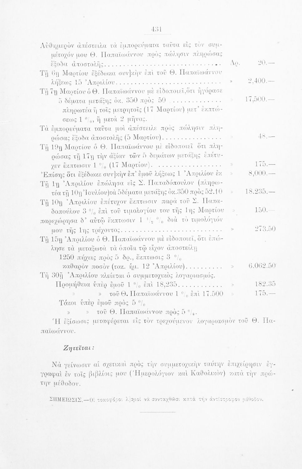 Εγχειρίδιο που στόχο είχε τη θεωρητική και πρακτική εξοικείωση και εξάσκηση εμπόρων, βιομηχάνων, τραπεζιτών, καθώς και σπουδαστών εμπορικών σχολών στη λογιστική επιστήμη. Το βιβλίο περιλαμβάνει τρόπους υπολογισμού των λογιστικών των εταιριών καθώς και σειρά ασκήσεων για πρακτική εξάσκηση.