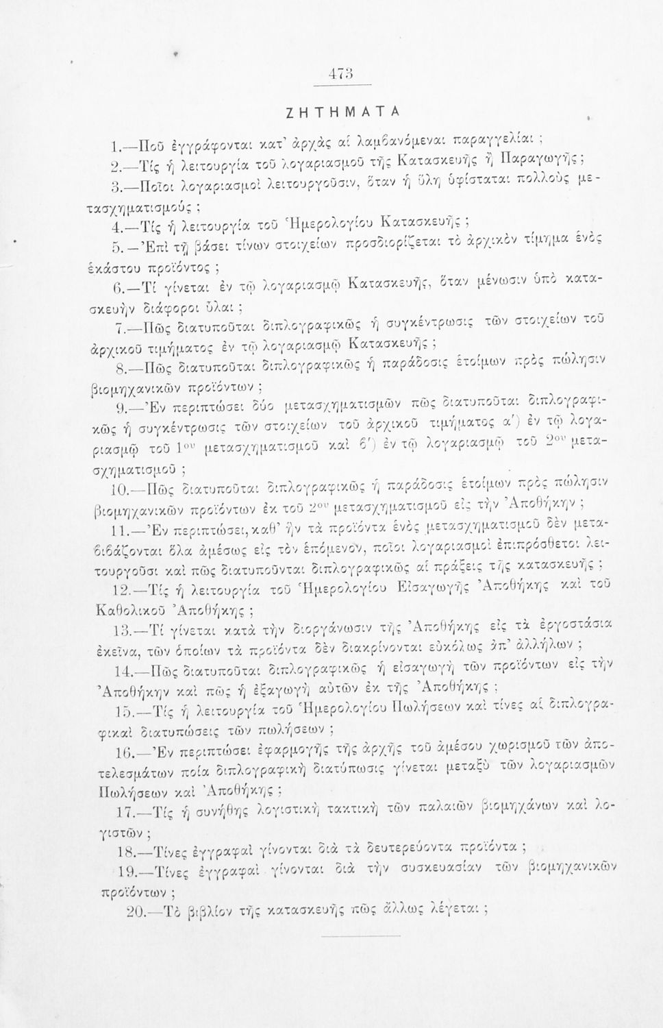Εγχειρίδιο που στόχο είχε τη θεωρητική και πρακτική εξοικείωση και εξάσκηση εμπόρων, βιομηχάνων, τραπεζιτών, καθώς και σπουδαστών εμπορικών σχολών στη λογιστική επιστήμη. Το βιβλίο περιλαμβάνει τρόπους υπολογισμού των λογιστικών των εταιριών καθώς και σειρά ασκήσεων για πρακτική εξάσκηση.