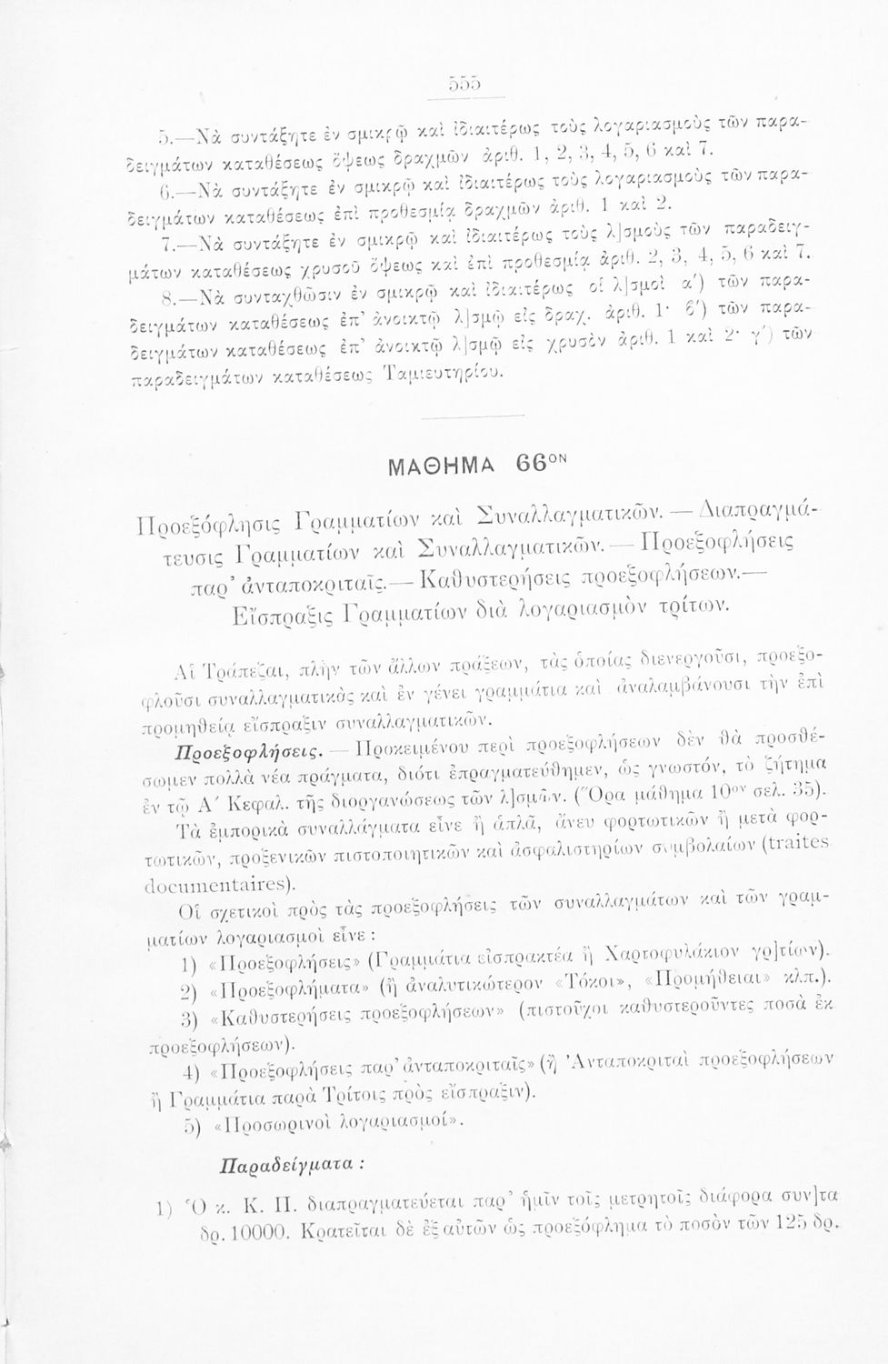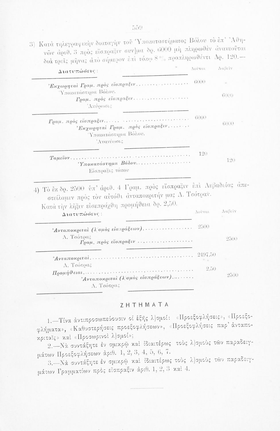 Βαθμίδα εκπαίδευσης: Δευτεροβάθμια Τάξη: Εμπορικές Σχολές Μάθημα: Λογιστική Γλώσσα: Καθαρεύουσα Παρουσίαση περιεχομένου: Εγχειρίδιο που στόχο είχε τη θεωρητική και πρακτική εξοικείωση και εξάσκηση εμπόρων, βιομηχάνων, τραπεζιτών, καθώς και σπουδαστών εμπορικών σχολών στη λογιστική επιστήμη. Το βιβλίο περιλαμβάνει τρόπους υπολογισμού των λογιστικών των εταιριών καθώς και σειρά ασκήσεων για πρακτική εξάσκηση. |