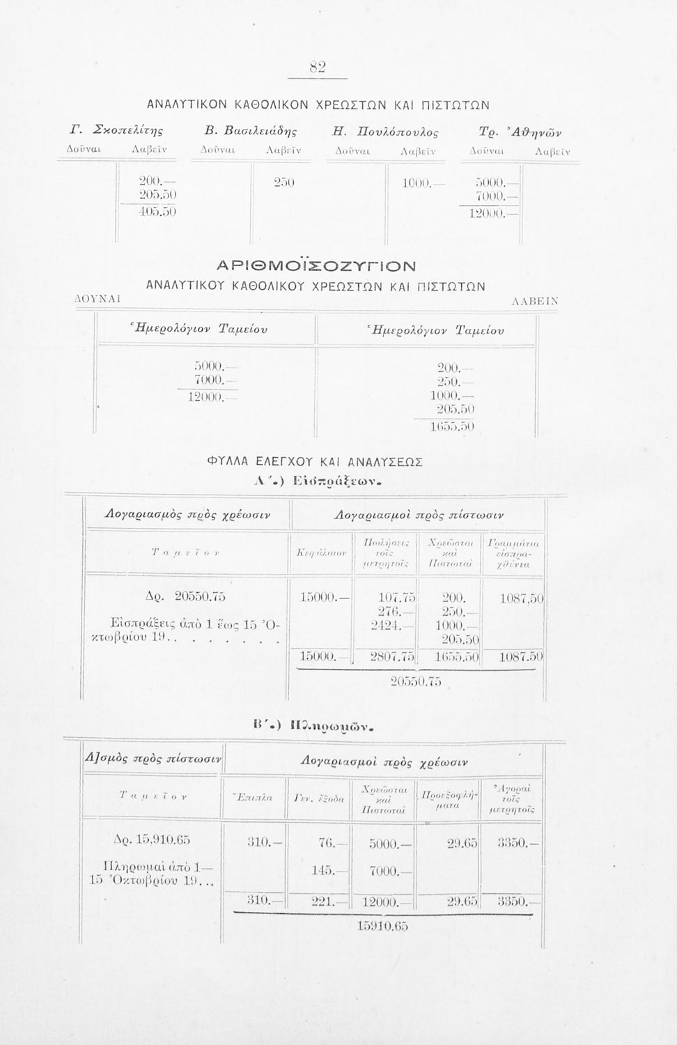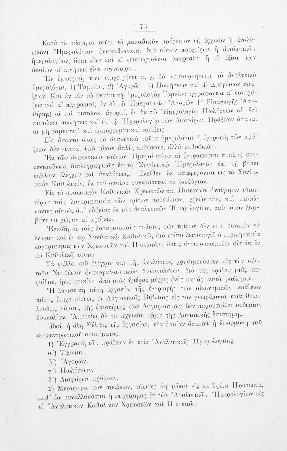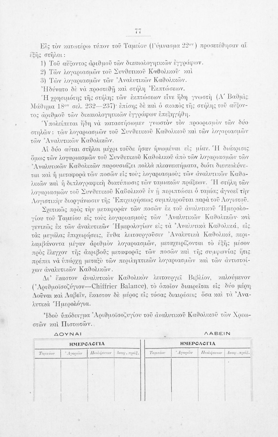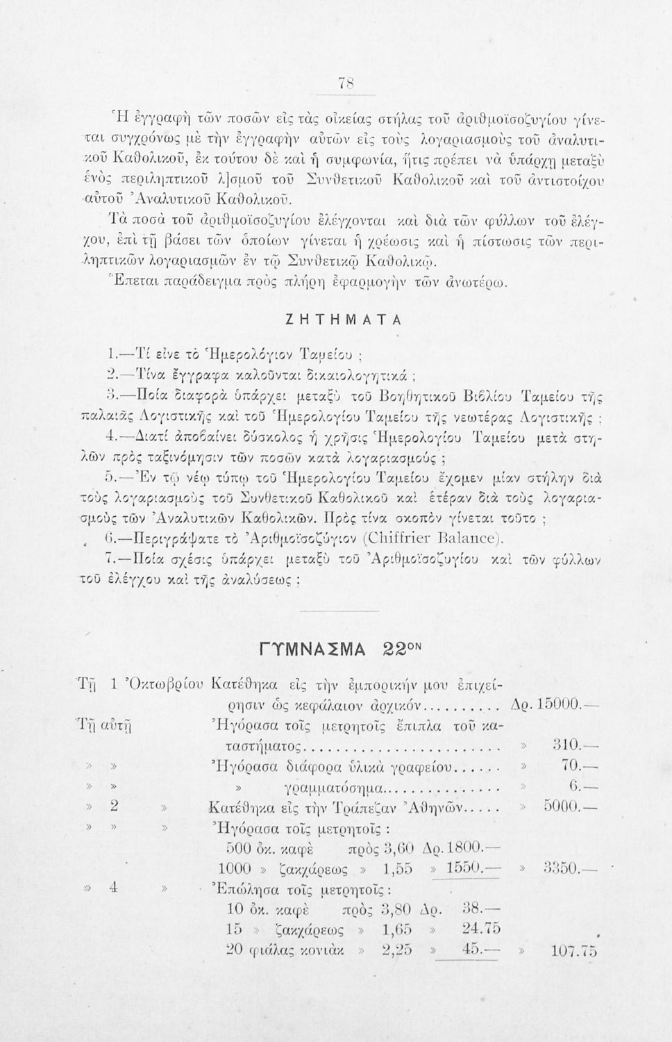 Εγχειρίδιο που στόχο είχε τη θεωρητική και πρακτική εξοικείωση και εξάσκηση εμπόρων, βιομηχάνων, τραπεζιτών, καθώς και σπουδαστών εμπορικών σχολών στη λογιστική επιστήμη. Το βιβλίο περιλαμβάνει τρόπους υπολογισμού των λογιστικών των εταιριών καθώς και σειρά ασκήσεων για πρακτική εξάσκηση.