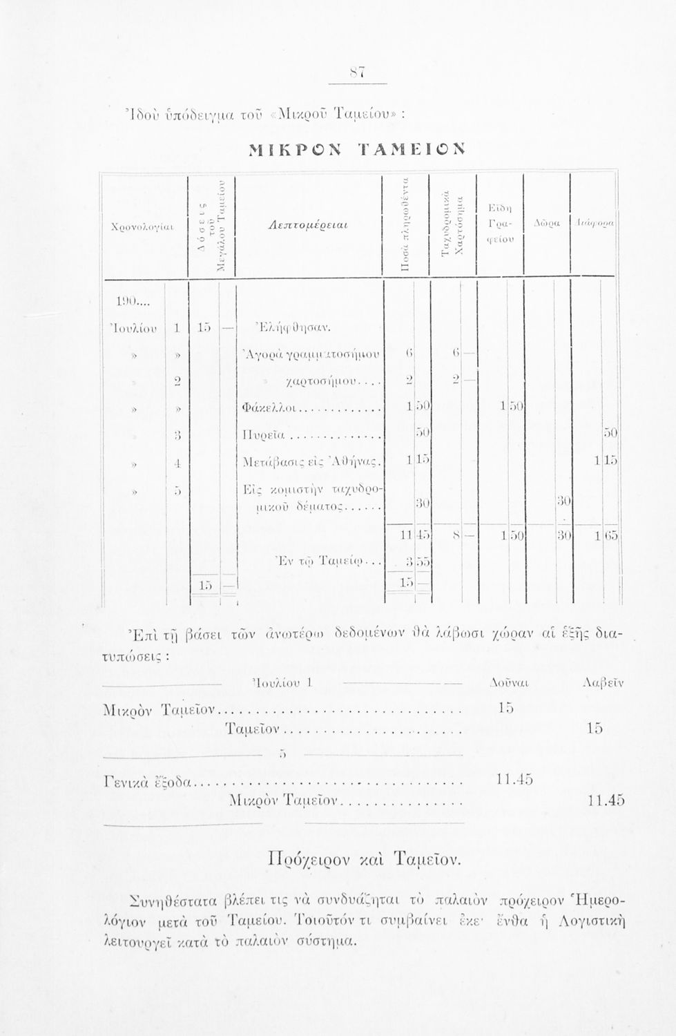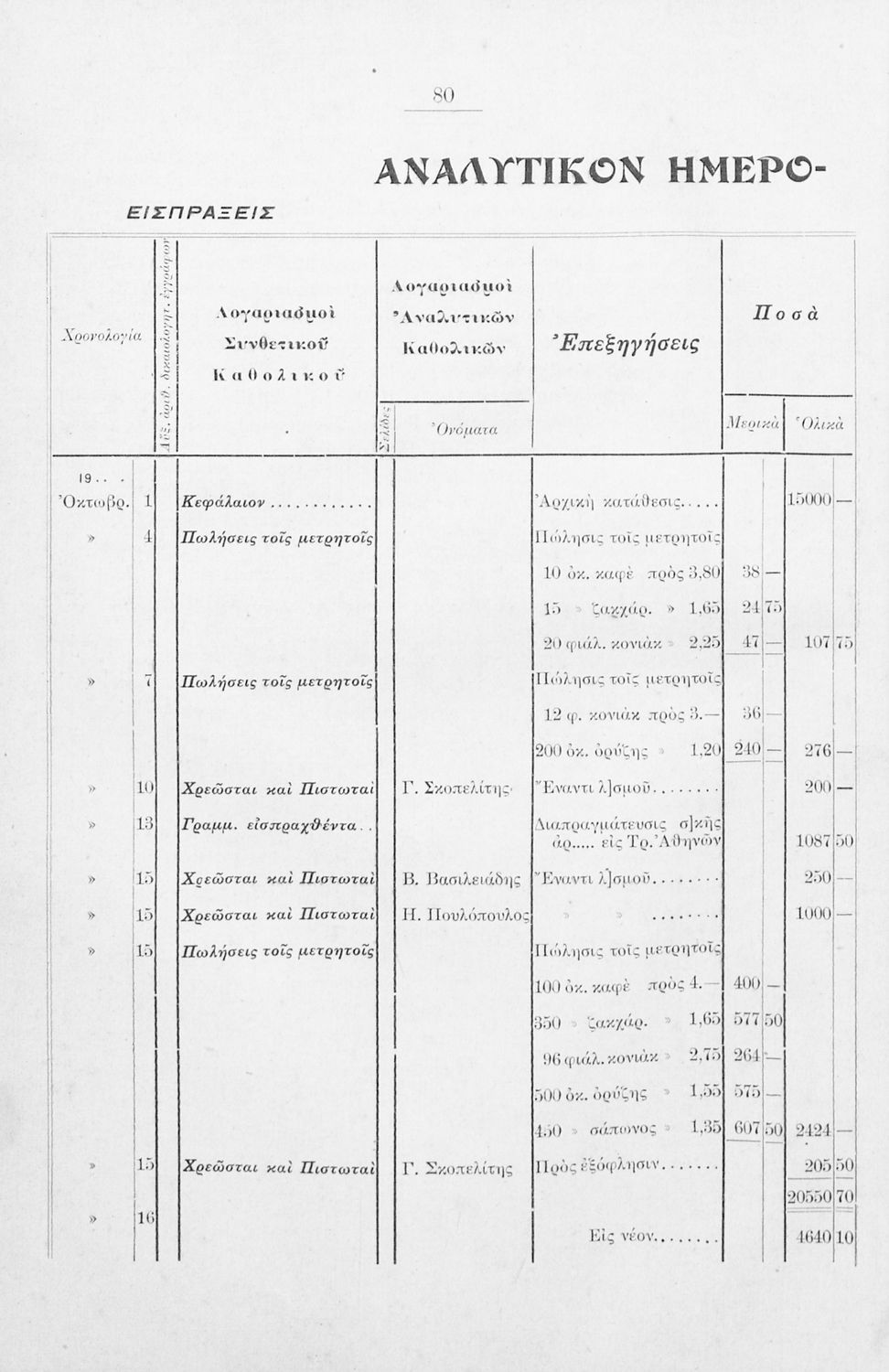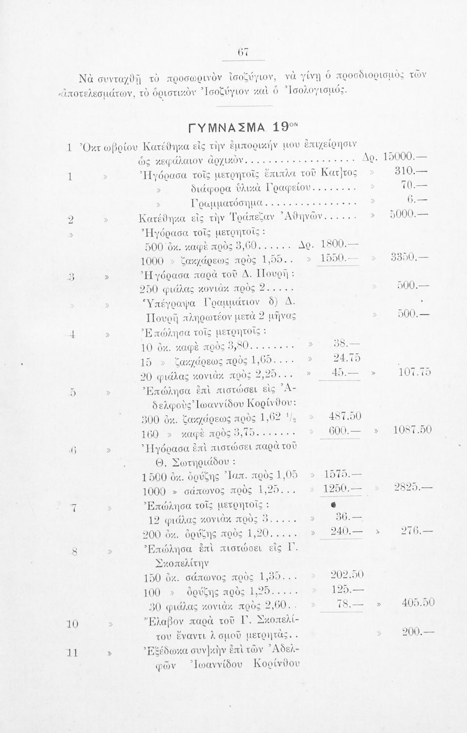 Εγχειρίδιο που στόχο είχε τη θεωρητική και πρακτική εξοικείωση και εξάσκηση εμπόρων, βιομηχάνων, τραπεζιτών, καθώς και σπουδαστών εμπορικών σχολών στη λογιστική επιστήμη. Το βιβλίο περιλαμβάνει τρόπους υπολογισμού των λογιστικών των εταιριών καθώς και σειρά ασκήσεων για πρακτική εξάσκηση.