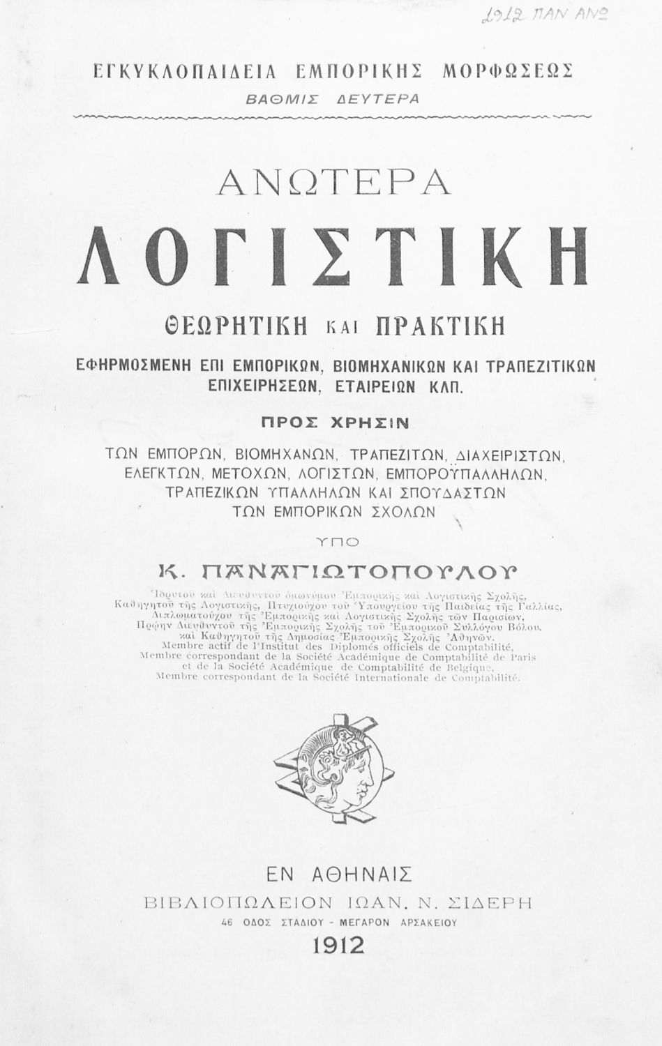 Τίτλος: Ανωτέρα Λογιστική, Θεωρητική και Πρακτική, Εφηρμοσμένη επί εμπορικών, βιομηχανικών και τραπεζιτικών επιχειρήσεων, εταιρειών κλπ