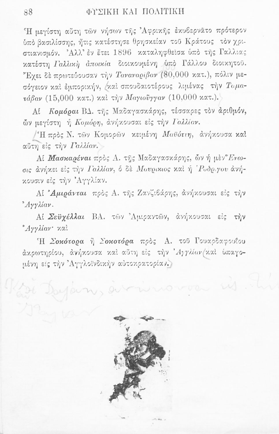 Πρόκειται για σχολικό εγχειρίδιο το οποίο προοριζόταν για τη διδασκαλία του μαθήματος της φυσικής και πολιτικής γεωγραφία της Ασίας, Αφρικής, Αμερικής και Αυστραλίας στην Α΄ τάξη των Ελληνικών Σχολείων. Φέρει λίγες προσωπικές σημειώσεις και σκίτσα του μαθητή, το ενδεικτικό βιβλιόσημο γνησιότητας, καθώς και την ένδειξη Βασίλειον της Ελλάδας.