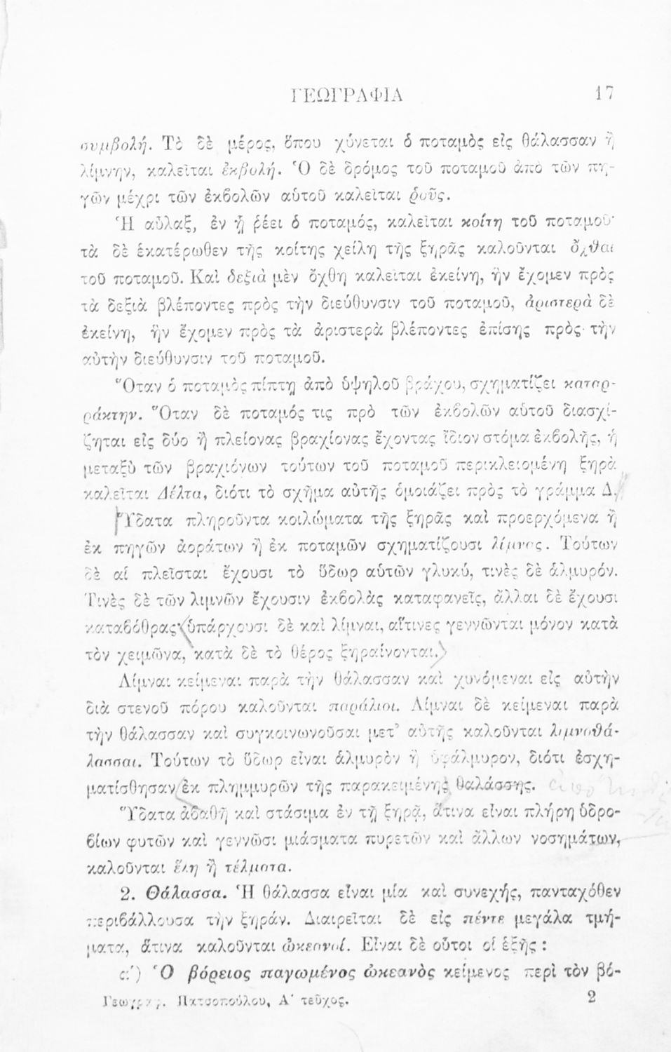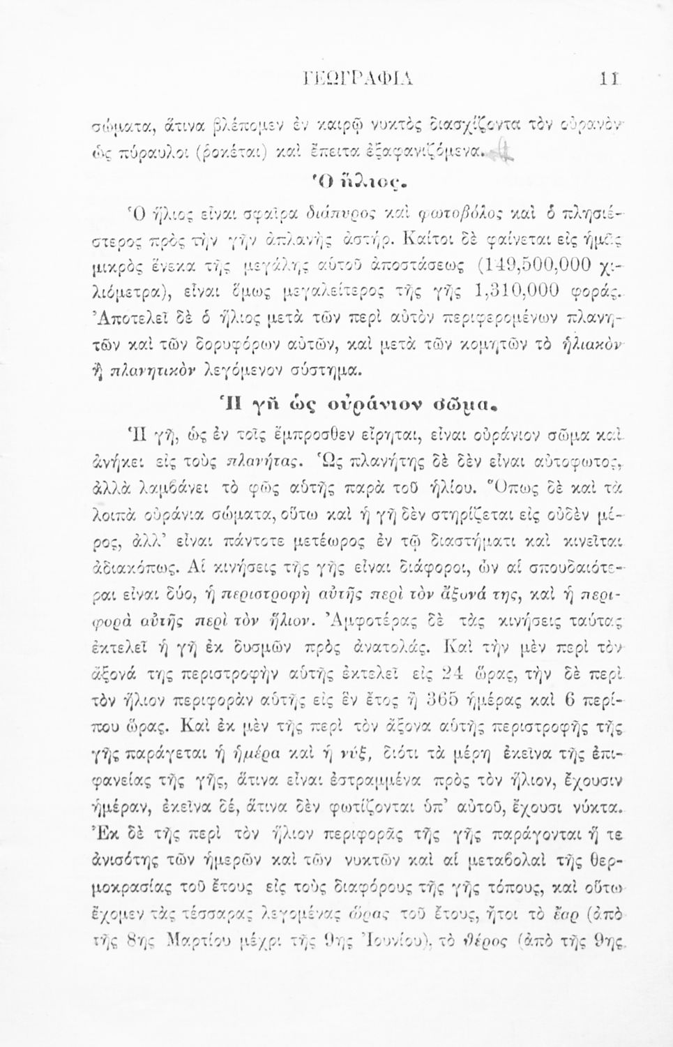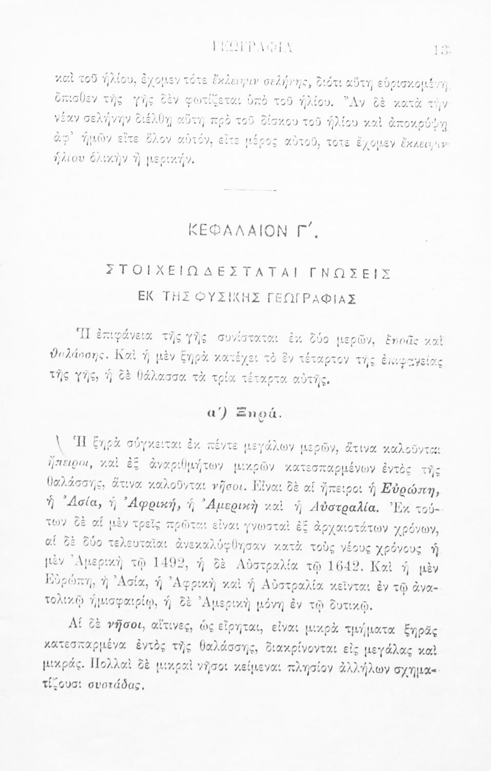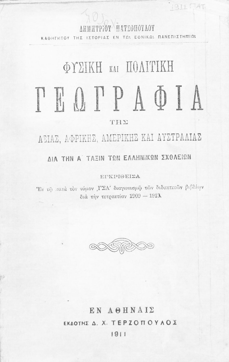 Πρόκειται για σχολικό εγχειρίδιο το οποίο προοριζόταν για τη διδασκαλία του μαθήματος της φυσικής και πολιτικής γεωγραφία της Ασίας, Αφρικής, Αμερικής και Αυστραλίας στην Α΄ τάξη των Ελληνικών Σχολείων. Φέρει λίγες προσωπικές σημειώσεις και σκίτσα του μαθητή, το ενδεικτικό βιβλιόσημο γνησιότητας, καθώς και την ένδειξη Βασίλειον της Ελλάδας.