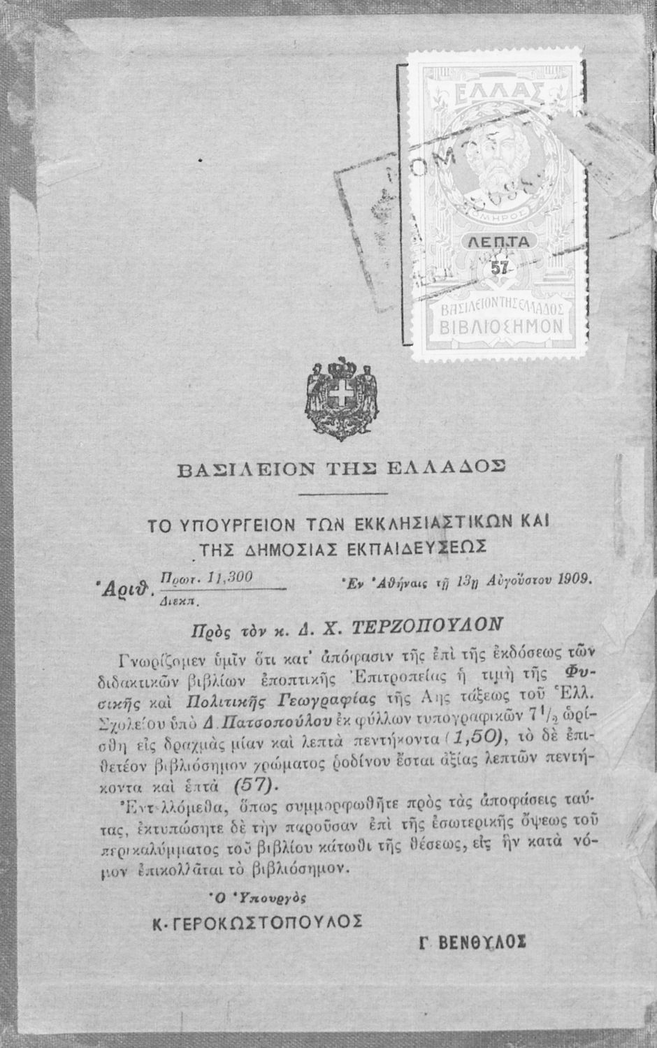 Εκδότης: Δ.Χ. Τερζόπουλος Έτος έκδοσης: 1911 Τόπος έκδοσης: Αθήνα Υπουργική απόφαση / Σύμβαση: 11300/13-8-1909 |