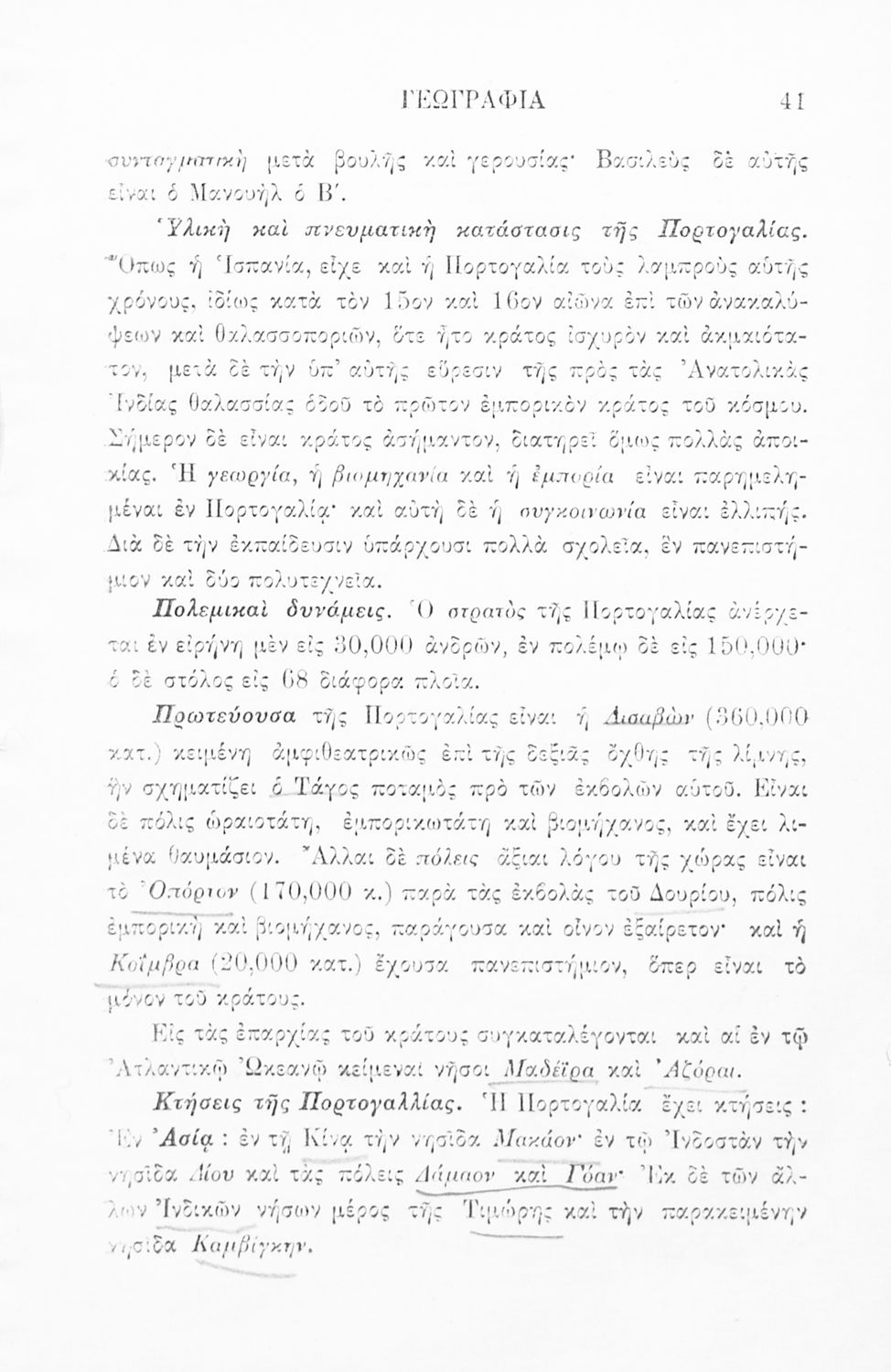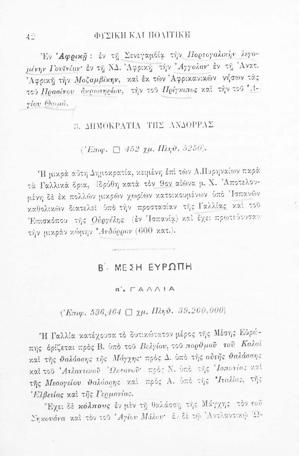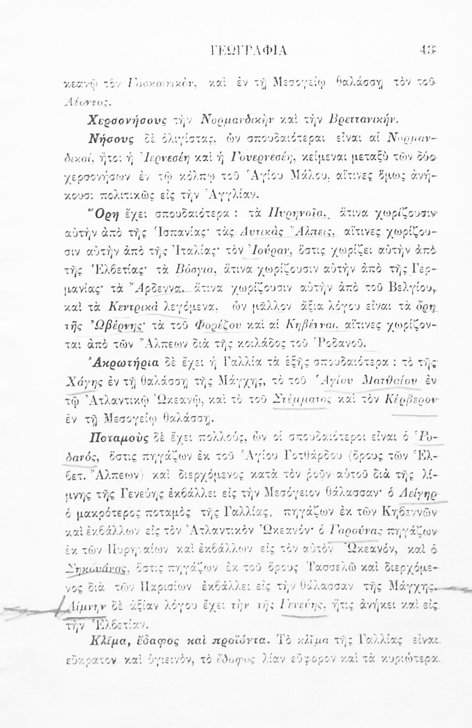 Πρόκειται για σχολικό εγχειρίδιο το οποίο προοριζόταν για τη διδασκαλία του μαθήματος της φυσικής και πολιτικής γεωγραφία της Ευρώπης, πλην της Ελλάδας, στη Β΄ τάξη των Ελληνικών Σχολείων. Φέρει λίγες προσωπικές σημειώσεις του μαθητή, καθώς και το ενδεικτικό βιβλιόσημο γνησιότητας