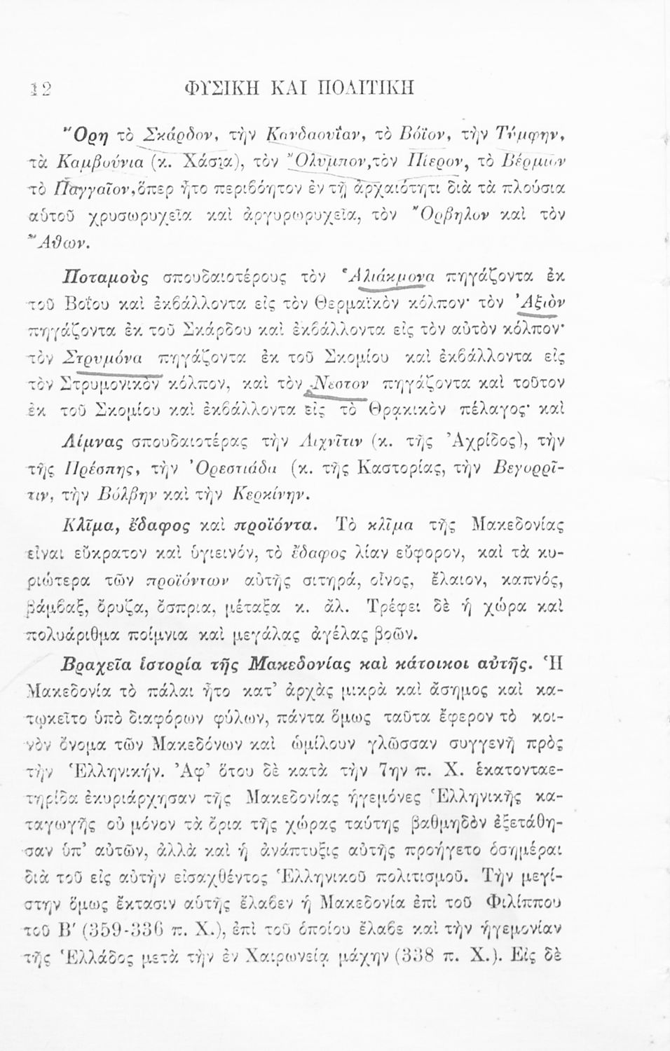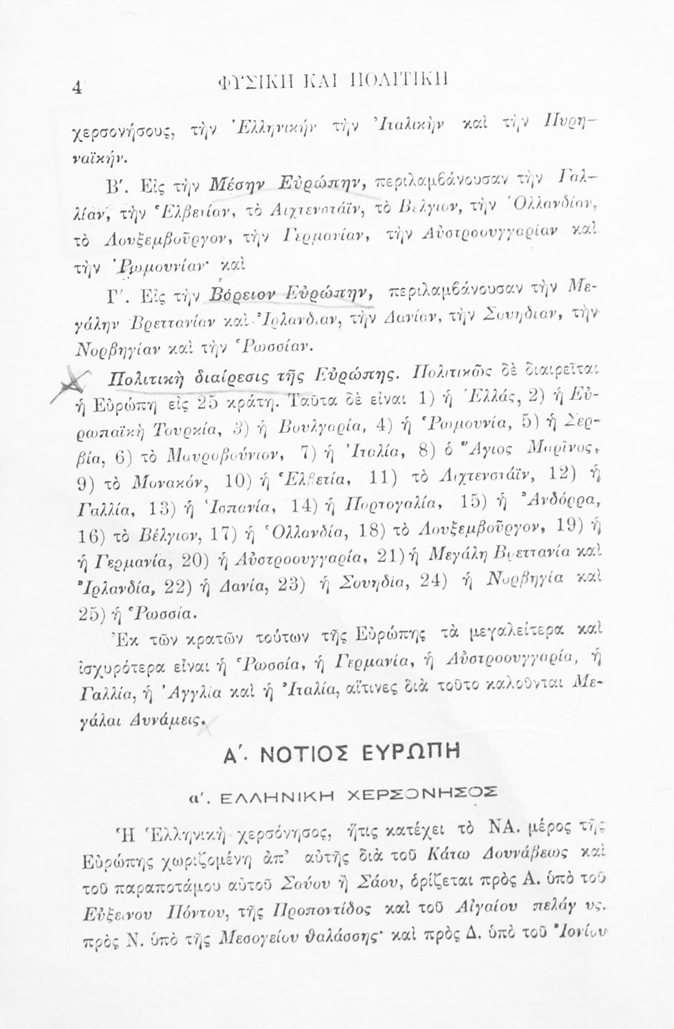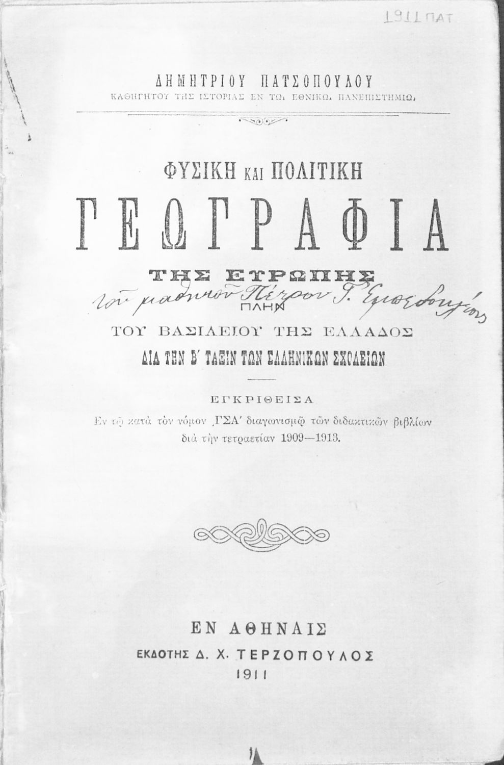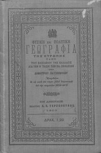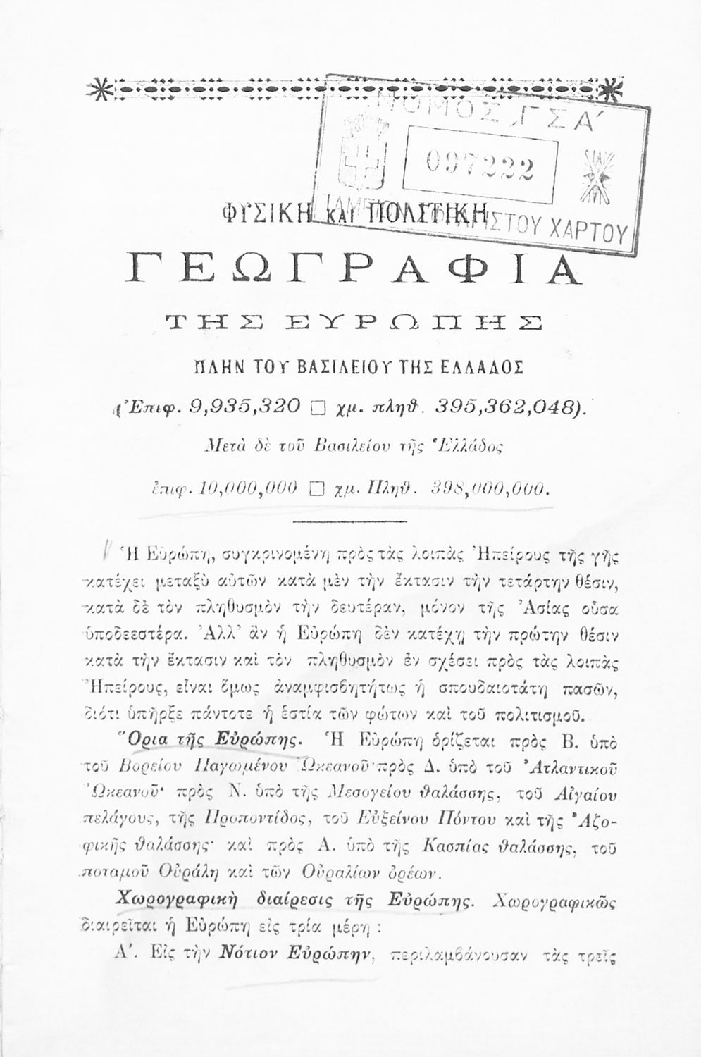 Πρόκειται για σχολικό εγχειρίδιο το οποίο προοριζόταν για τη διδασκαλία του μαθήματος της φυσικής και πολιτικής γεωγραφία της Ευρώπης, πλην της Ελλάδας, στη Β΄ τάξη των Ελληνικών Σχολείων. Φέρει λίγες προσωπικές σημειώσεις του μαθητή, καθώς και το ενδεικτικό βιβλιόσημο γνησιότητας