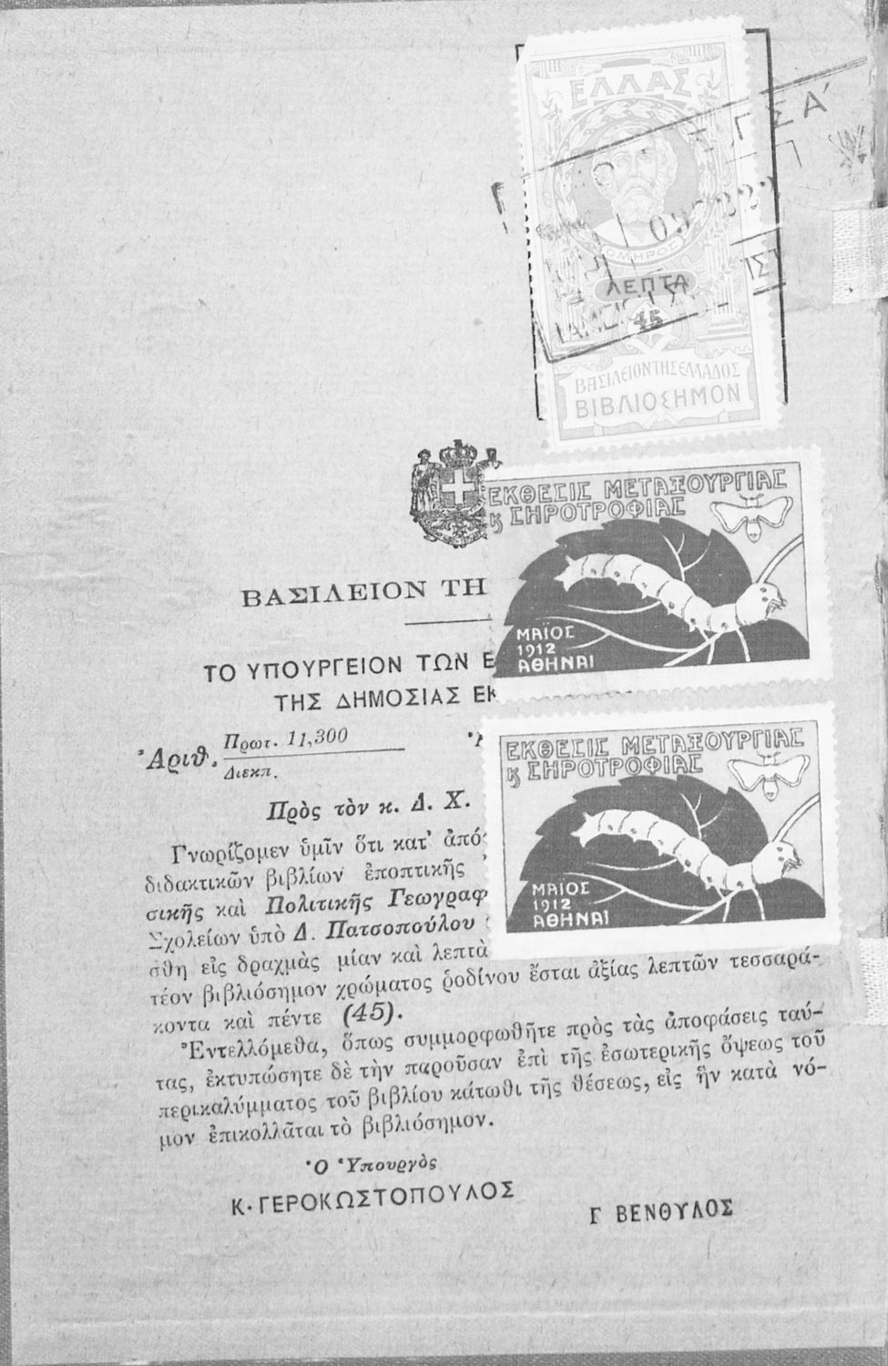 Εκδότης: Δ.Χ. Τερζόπουλος Έτος έκδοσης: 1911 Τόπος έκδοσης: Αθήνα Υπουργική απόφαση / Σύμβαση: 11300/13-8-1909 |