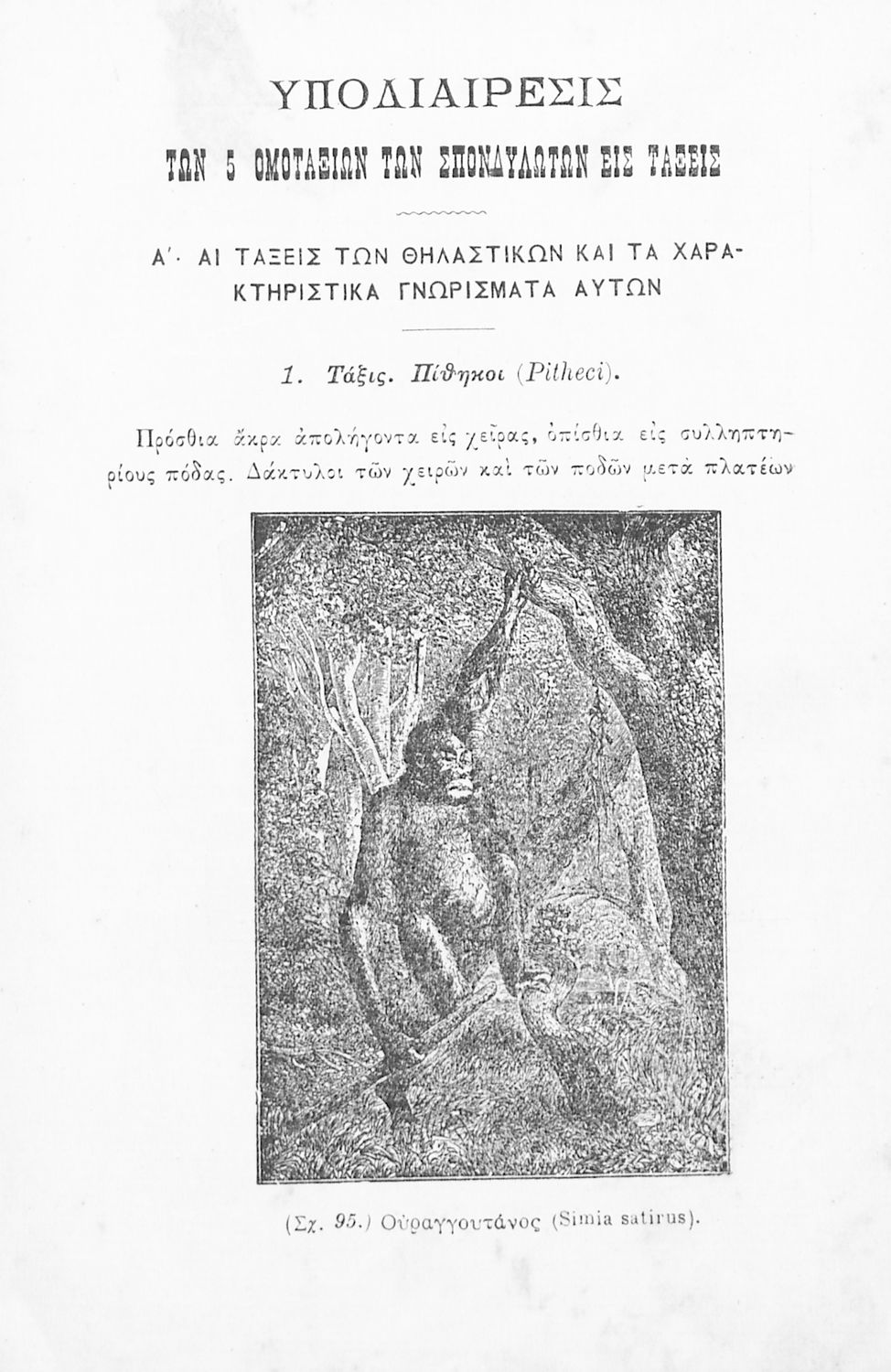 Σχολικό εγχειρίδιο Ζωολογίας για τα Γυμνάσια, τα Παρθεναγωγεία και τα Διδασκαλεία που εστιάζει στην ανθρώπινη φυσιολογία και παρουσιάζει τα διάφορα ζώα ανάλογα με την συνομοταξία στην οποία ανήκουν.