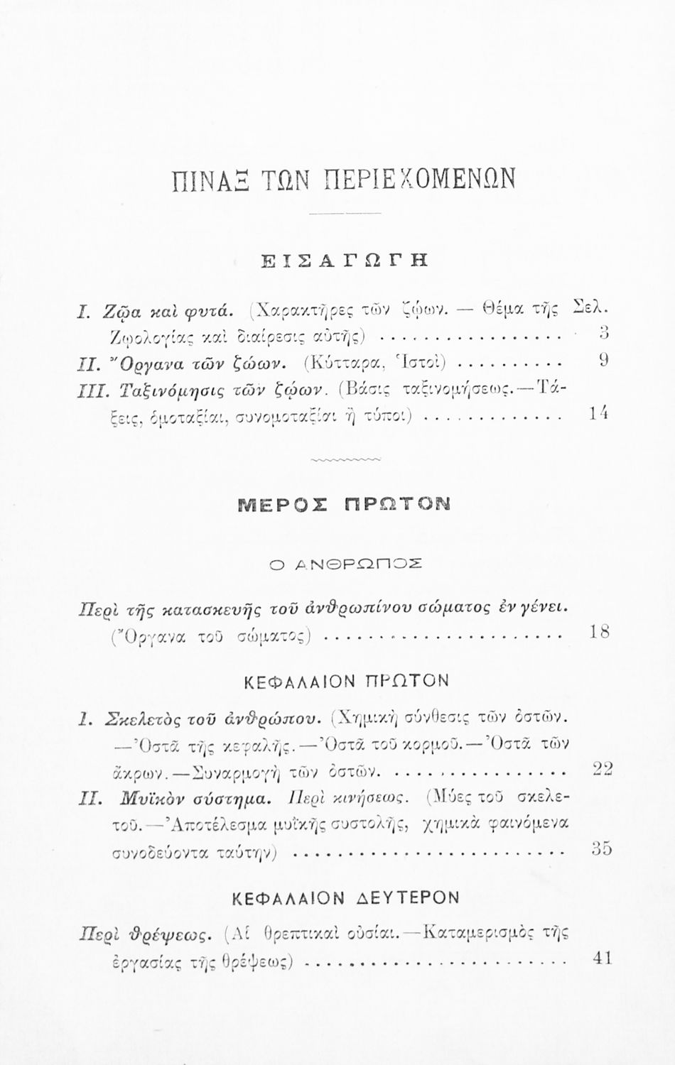 Σχολικό εγχειρίδιο Ζωολογίας για τα Γυμνάσια, τα Παρθεναγωγεία και τα Διδασκαλεία που εστιάζει στην ανθρώπινη φυσιολογία και παρουσιάζει τα διάφορα ζώα ανάλογα με την συνομοταξία στην οποία ανήκουν.