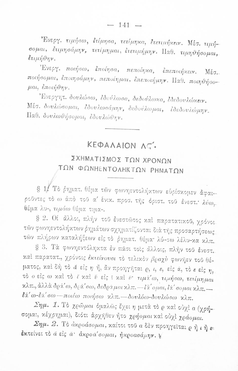 Σχολικό εγχειρίδιο Αρχαίων Ελληνικών για τα Ελληνικά Σχολεία και Παρθεναγωγεία που περιέχει τους κανόνες γραμματικής και είναι χωρισμένο σε φθογγολογικό, τυπολογικό και ετυμολογικό μέρος.