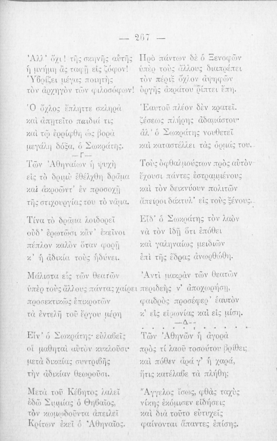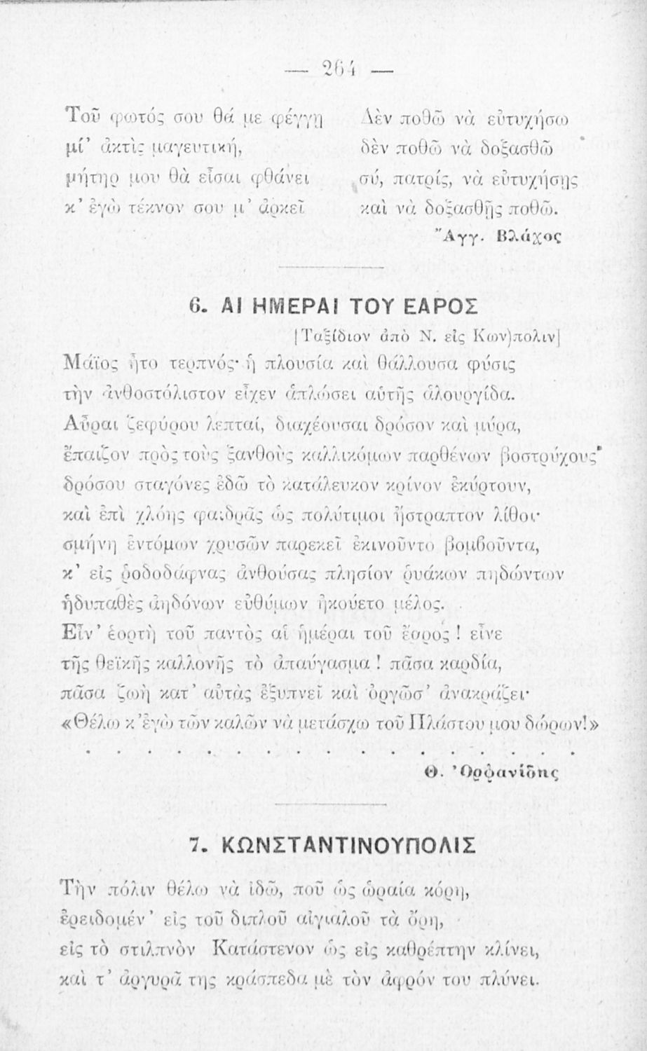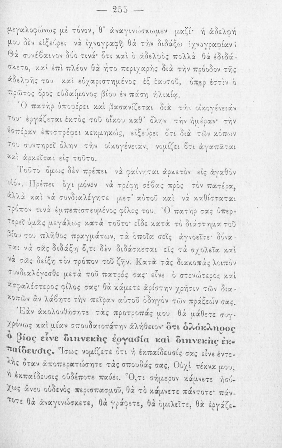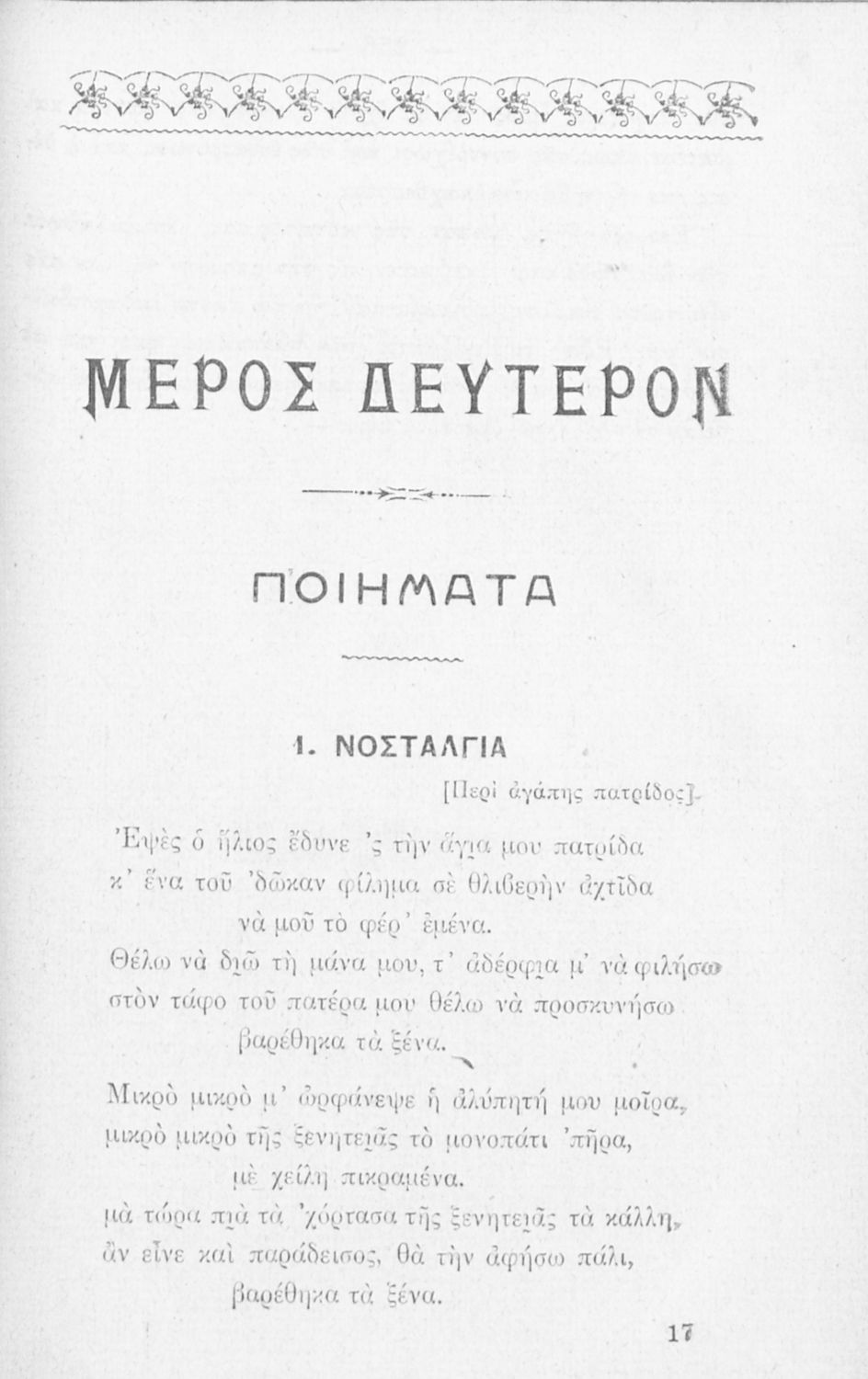 Σχολικό εγχειρίδιο Νέων και Αρχαίων Ελληνικών για τη Β΄ Ελληνικού και τη Γ΄ Αστικού Σχολείου που περιλαμβάνει ποιήματα και πεζά εμπνευσμένα από την πατρίδα, την οικογένεια, τη θρησκεία, και την καθημερινή ζωή.