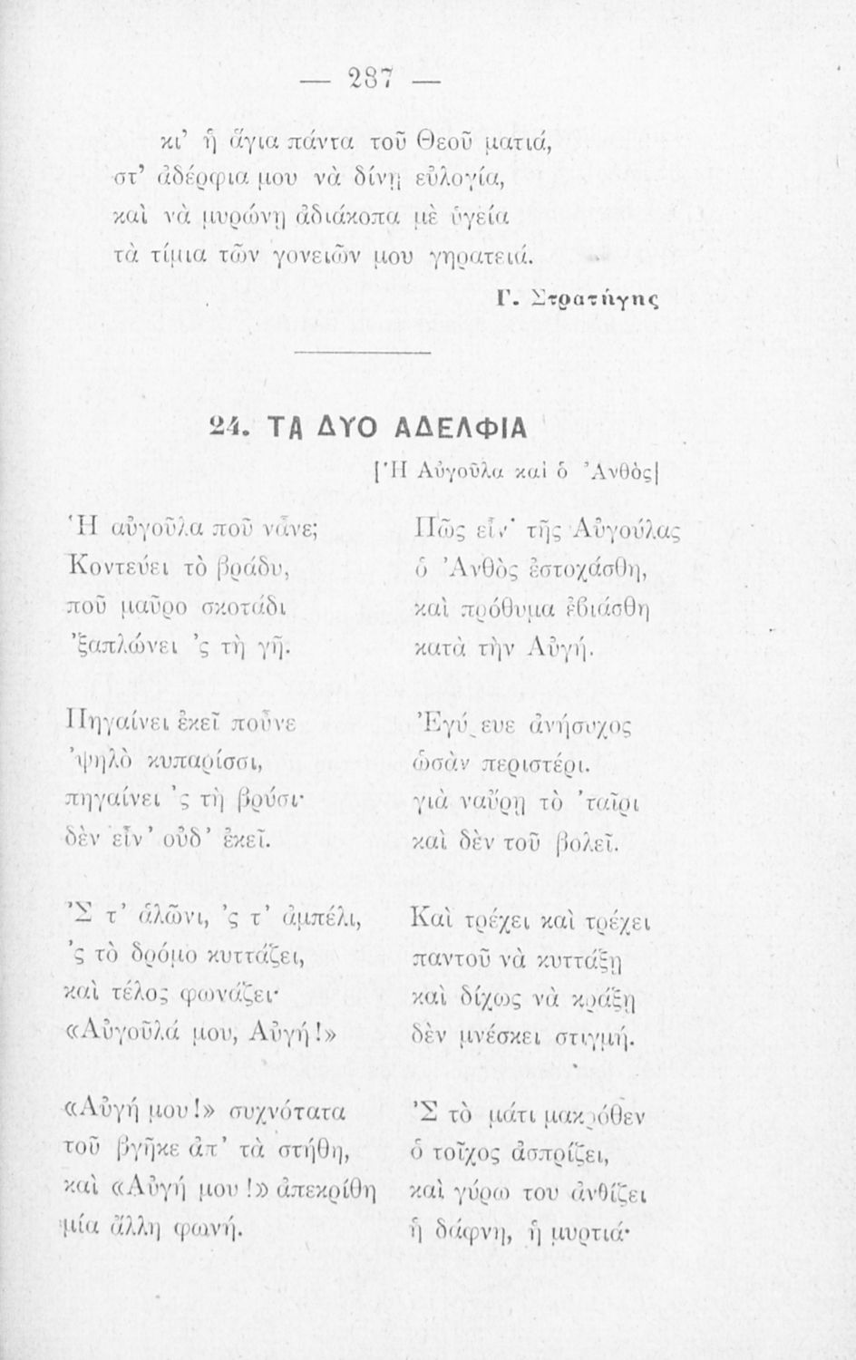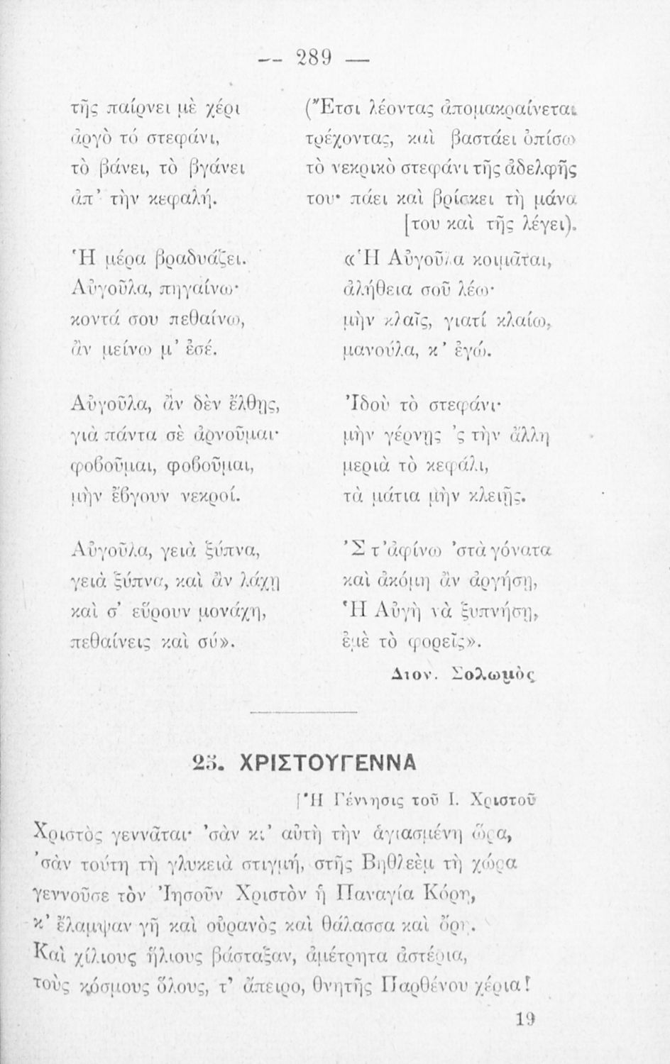 Σχολικό εγχειρίδιο Νέων και Αρχαίων Ελληνικών για τη Β΄ Ελληνικού και τη Γ΄ Αστικού Σχολείου που περιλαμβάνει ποιήματα και πεζά εμπνευσμένα από την πατρίδα, την οικογένεια, τη θρησκεία, και την καθημερινή ζωή.