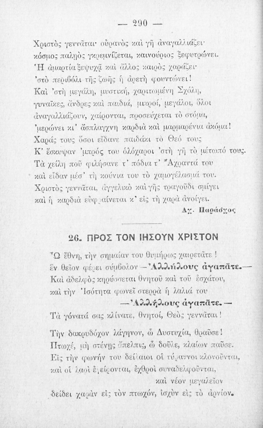 Βαθμίδα εκπαίδευσης: Δευτεροβάθμια Τάξη: Γ' Αστικού Σχολείου / Β' Ελληνικού Σχολείου Μάθημα: Αρχαία Ελληνικά Γλώσσα: Καθαρεύουσα Παρουσίαση περιεχομένου: Σχολικό εγχειρίδιο Νέων και Αρχαίων Ελληνικών για τη Β΄ Ελληνικού και τη Γ΄ Αστικού Σχολείου που περιλαμβάνει ποιήματα και πεζά εμπνευσμένα από την πατρίδα, την οικογένεια, τη θρησκεία, και την καθημερινή ζωή. |