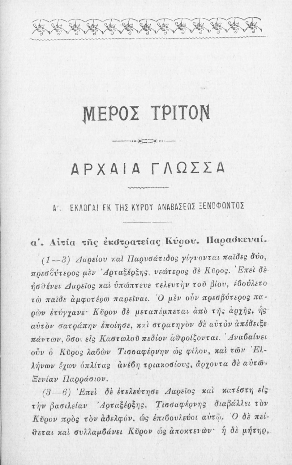 Βαθμίδα εκπαίδευσης: Δευτεροβάθμια Τάξη: Γ' Αστικού Σχολείου / Β' Ελληνικού Σχολείου Μάθημα: Αρχαία Ελληνικά Γλώσσα: Καθαρεύουσα Παρουσίαση περιεχομένου: Σχολικό εγχειρίδιο Νέων και Αρχαίων Ελληνικών για τη Β΄ Ελληνικού και τη Γ΄ Αστικού Σχολείου που περιλαμβάνει ποιήματα και πεζά εμπνευσμένα από την πατρίδα, την οικογένεια, τη θρησκεία, και την καθημερινή ζωή. |