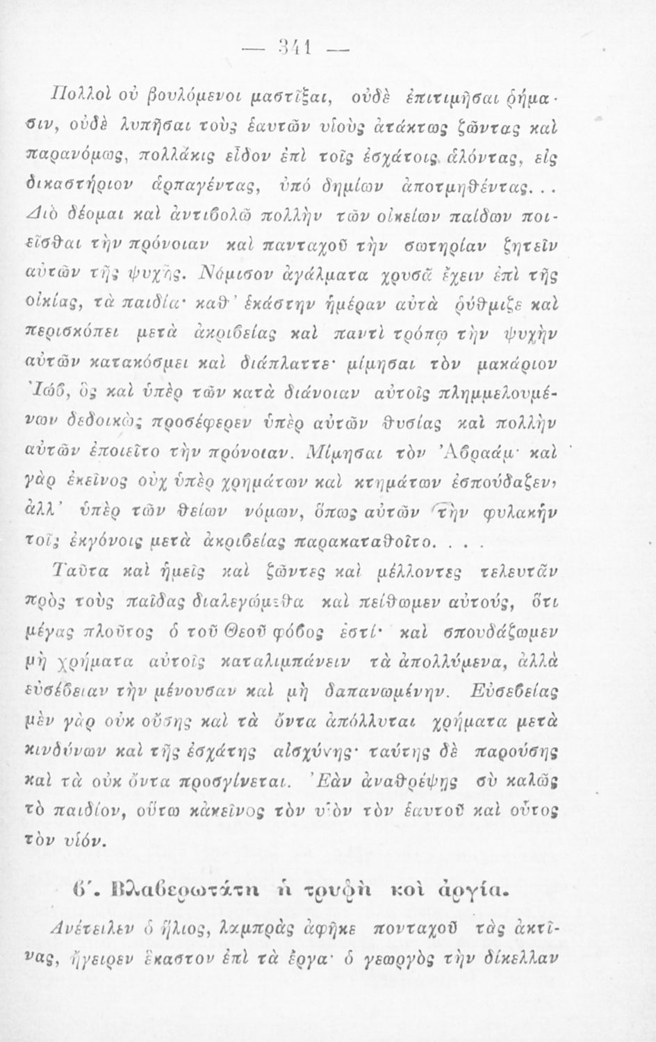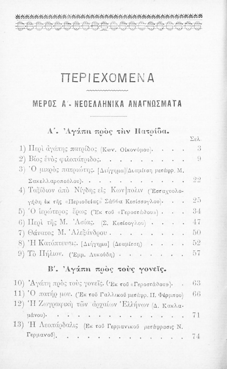 Σχολικό εγχειρίδιο Νέων και Αρχαίων Ελληνικών για τη Β΄ Ελληνικού και τη Γ΄ Αστικού Σχολείου που περιλαμβάνει ποιήματα και πεζά εμπνευσμένα από την πατρίδα, την οικογένεια, τη θρησκεία, και την καθημερινή ζωή.