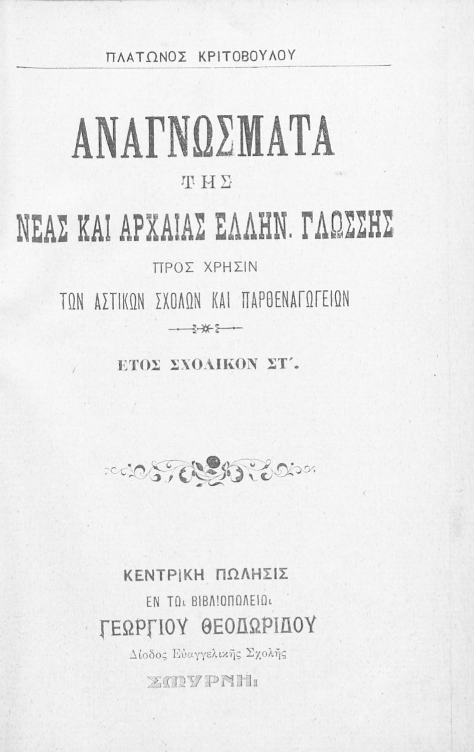 Κωδικός αναγνώρισης: 02-02168 Τίτλος: Αναγνώσματα της νέας και αρχαίας ελληνικής γλώσσης προς χρήσιν των Αστικών Σχολών και Παρθεναγωγείων έτος σχολικόν ΣΤ΄ δια την τελευταίαν τάξιν των Αστικών ή Β΄ των Ελληνικών Σχολείων Συγγραφέας: Πλάτων Κριτόβουλος Μέγεθος και υπόστρωμα: Σχολικό εγχειρίδιο, σκληρό εξώφυλλο, 352 σελίδες. |