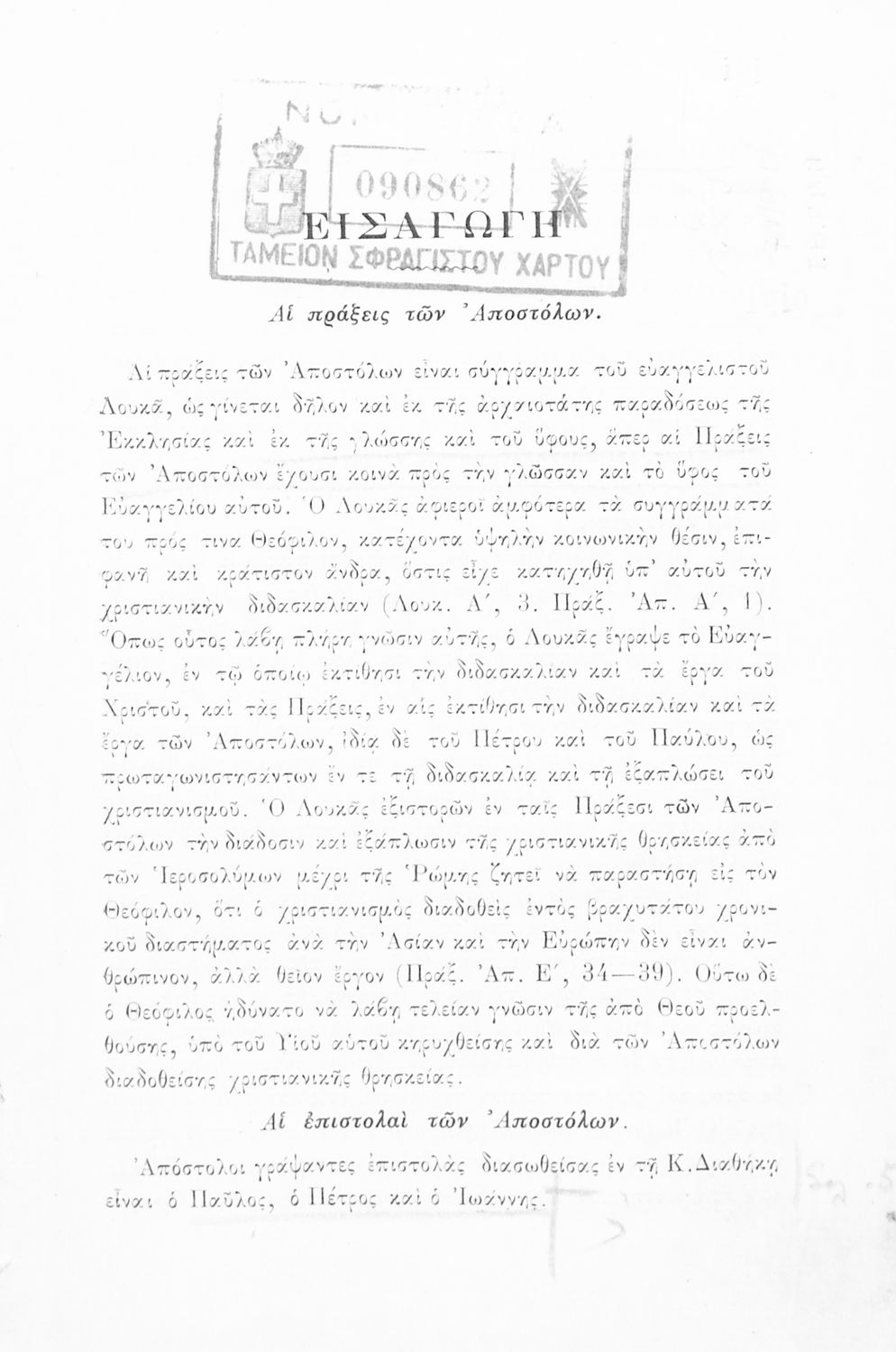 Βαθμίδα εκπαίδευσης: Δευτεροβάθμια Τάξη: Β' Γυμνασίου Μάθημα: Θρησκευτικά Γλώσσα: Καθαρεύουσα Παρουσίαση περιεχομένου: Σχολικό εγχειρίδιο Θρησκευτικών Β΄ Γυμνασίου που περιλαμβάνει εισαγωγή στις πράξεις, στις επιστολές και στους βίους των Αποστόλων Παύλου, Πέτρου και Ιακώβου, περικοπές των πράξεων και των επιστολών τους, και ερμηνευτικά σχόλια και σημειώσεις. |