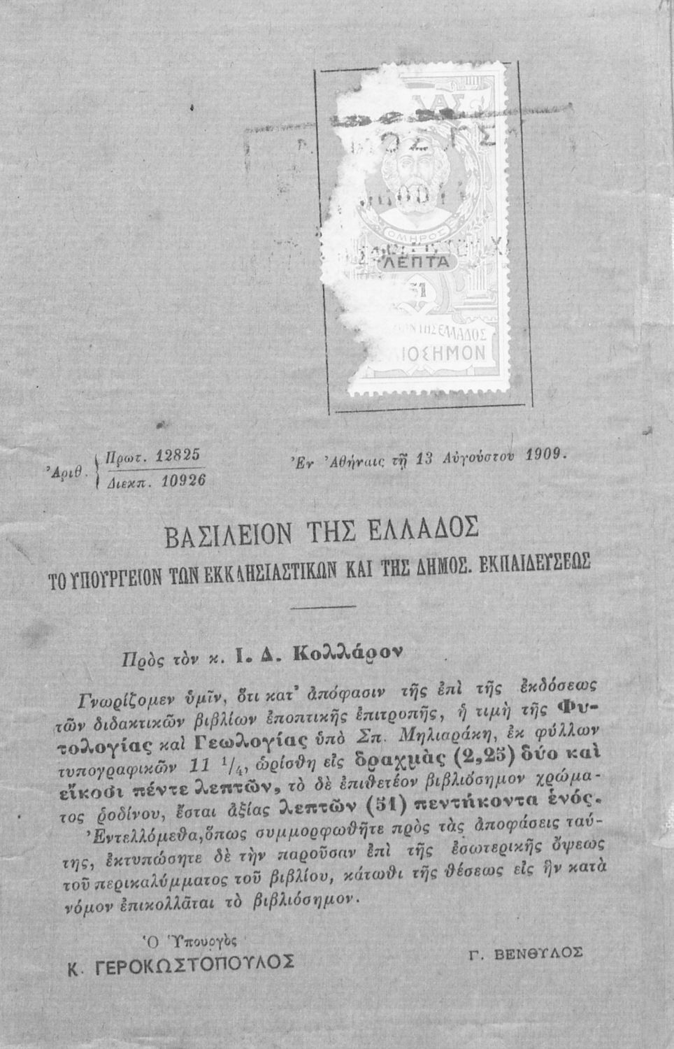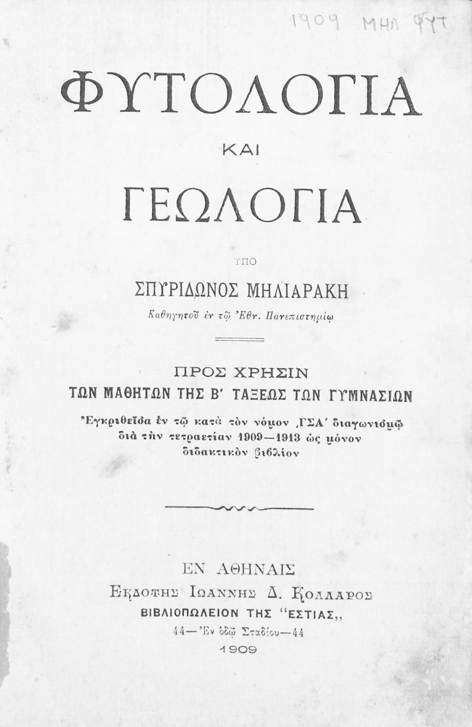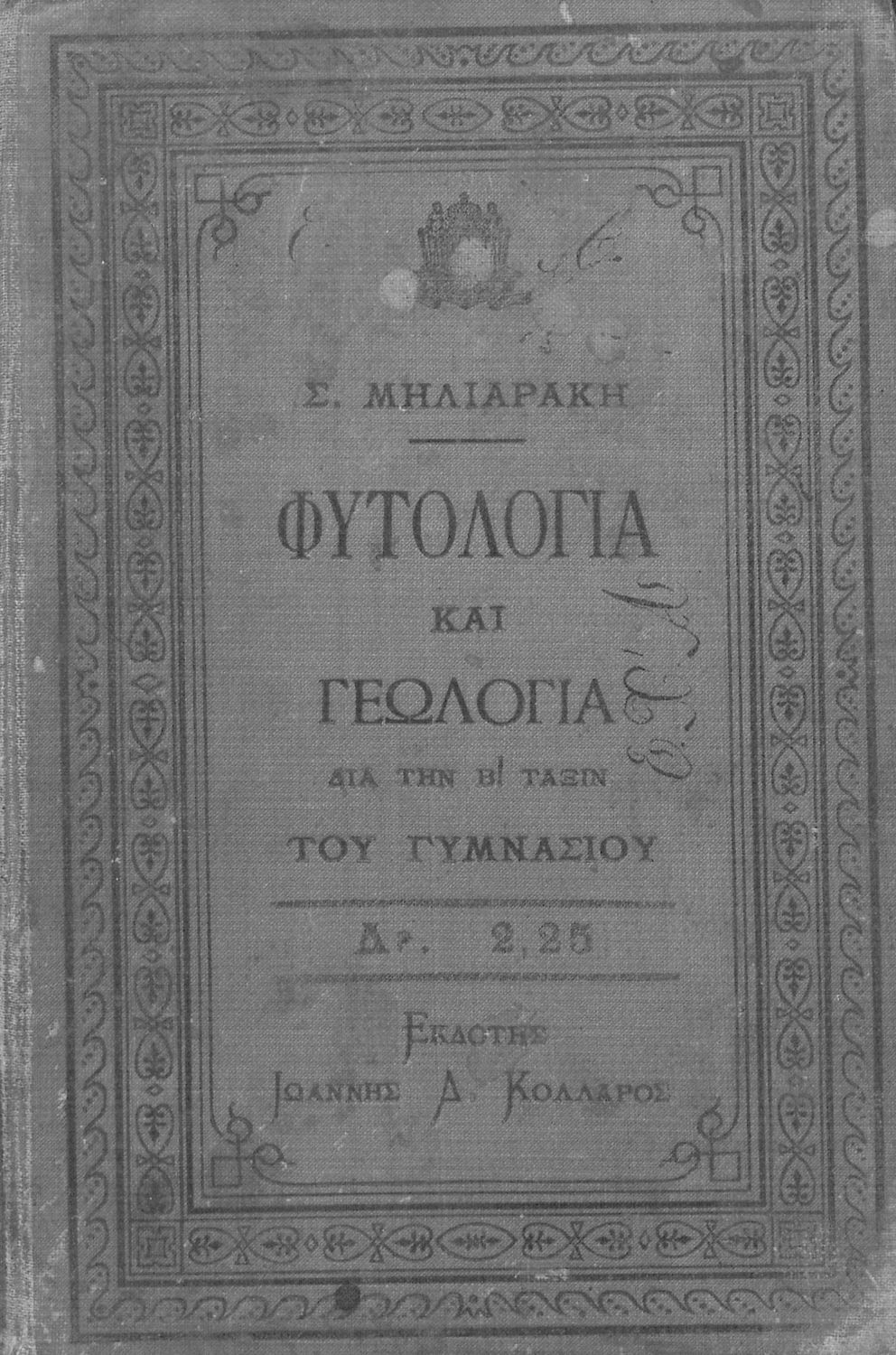 Κωδικός αναγνώρισης: 02-02191 Τίτλος: Φυτολογία και Γεωλογία, προς χρήσιν των μαθητών της Β΄ Τάξεως των Γυμνασίων Συγγραφέας: Σπυρίδων Μηλιαράκης Μέγεθος και υπόστρωμα: Σχολικό εγχειρίδιο, σκληρό εξώφυλλο, 172 σελίδες. Εικόνες (ασπρόμαυρες), σκίτσα (ασπρόμαυρα). |