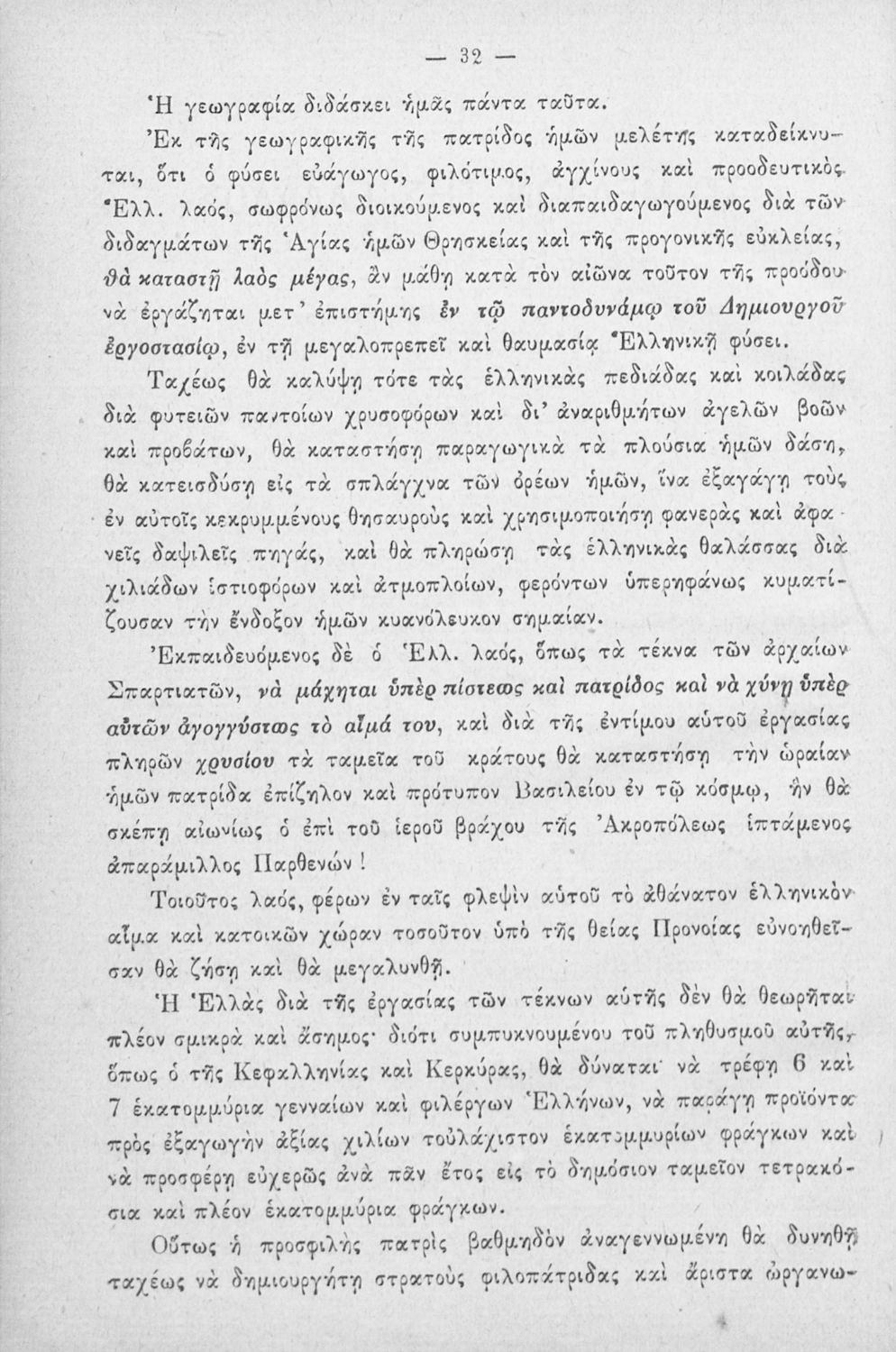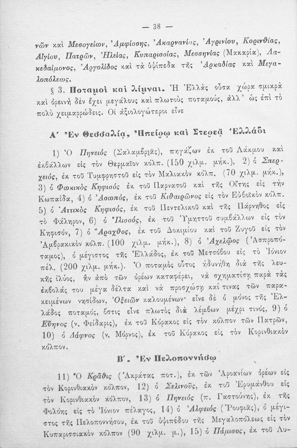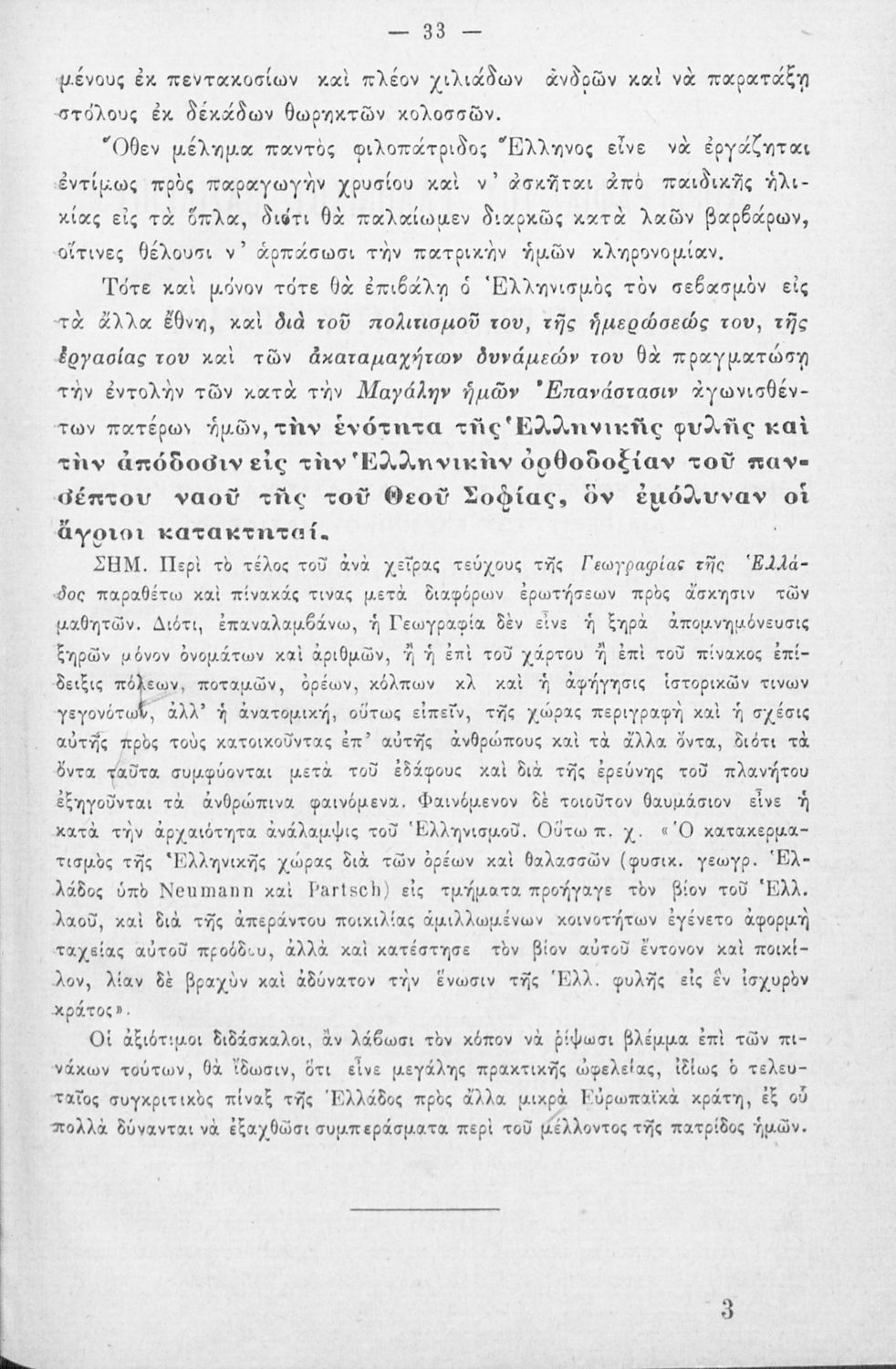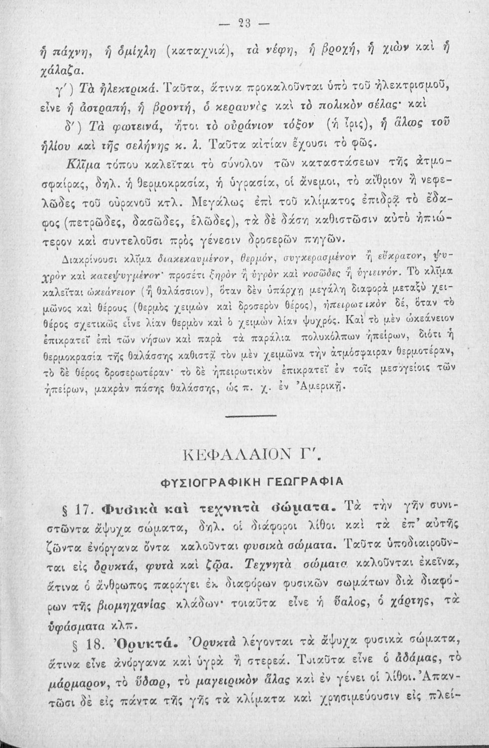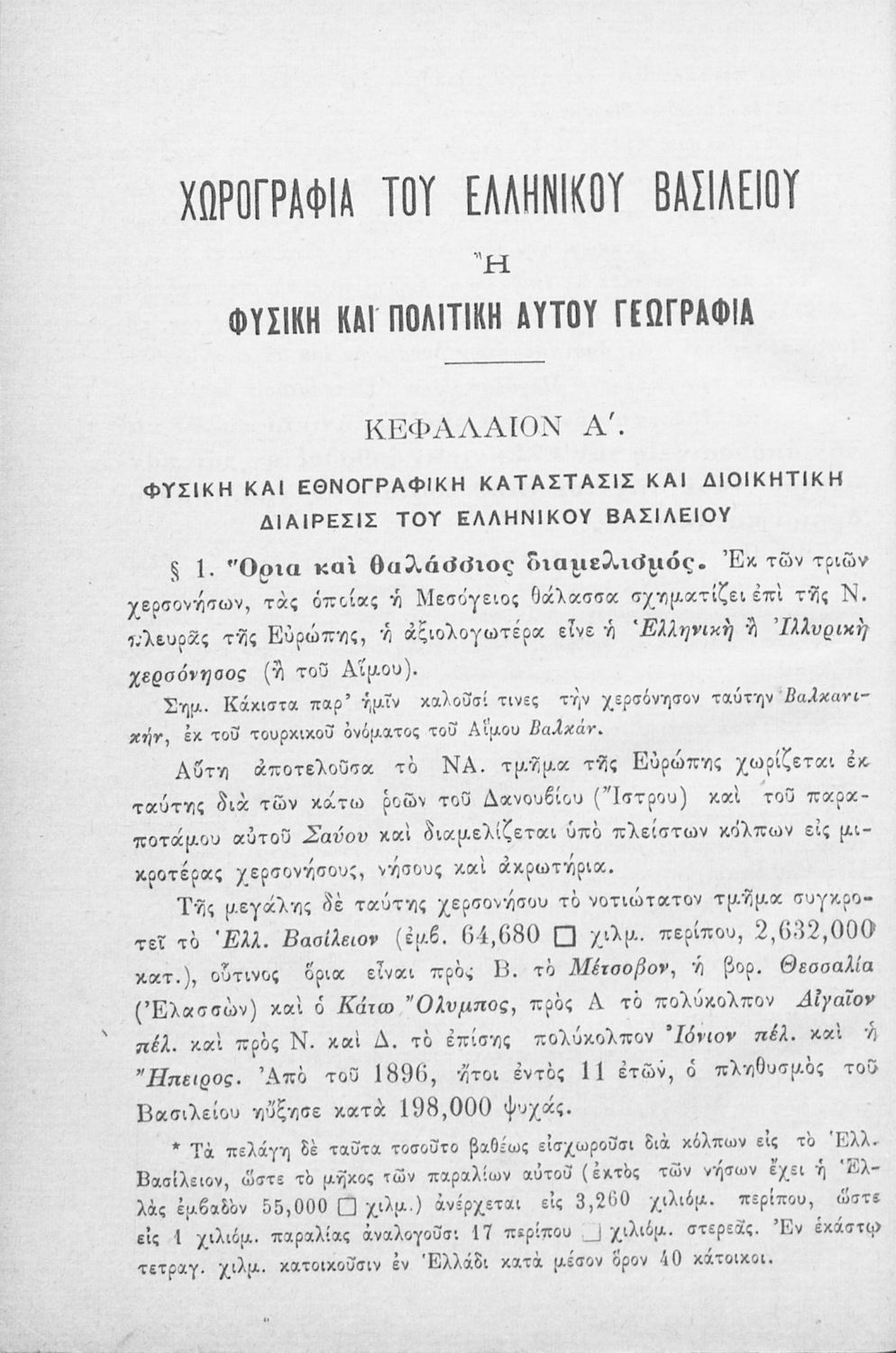 Σχολικό εγχειρίδιο Γεωγραφίας για τους μαθητές της Γ΄ τάξης των Ελληνικών Σχολείων και των Παρθεναγωγείων που περιέχει εισαγωγή στη μαθηματική, φυσική, φυσιογραφική και ανθρωπολογική γεωγραφία και παρουσιάζει την Ελλάδα ανά διαμέρισμα και νομό από φυσική, πολιτική και οικονομική άποψη.