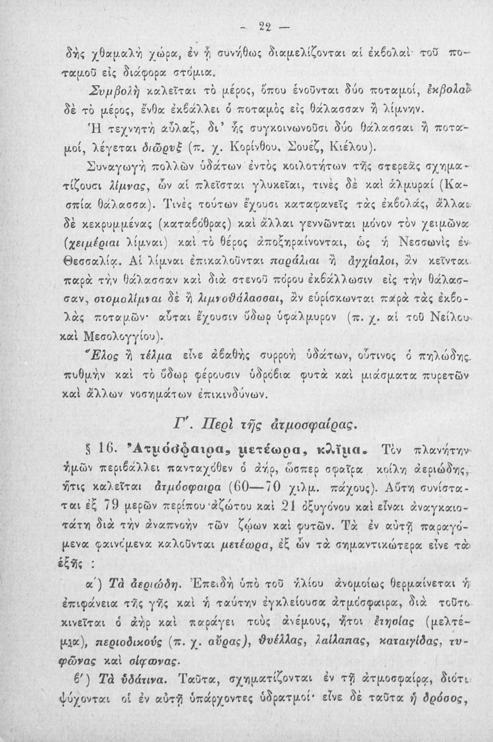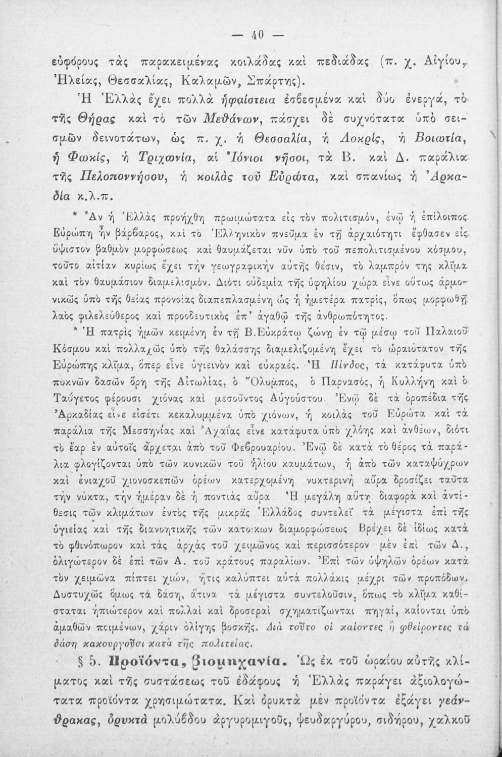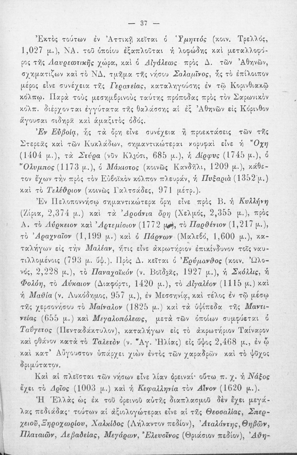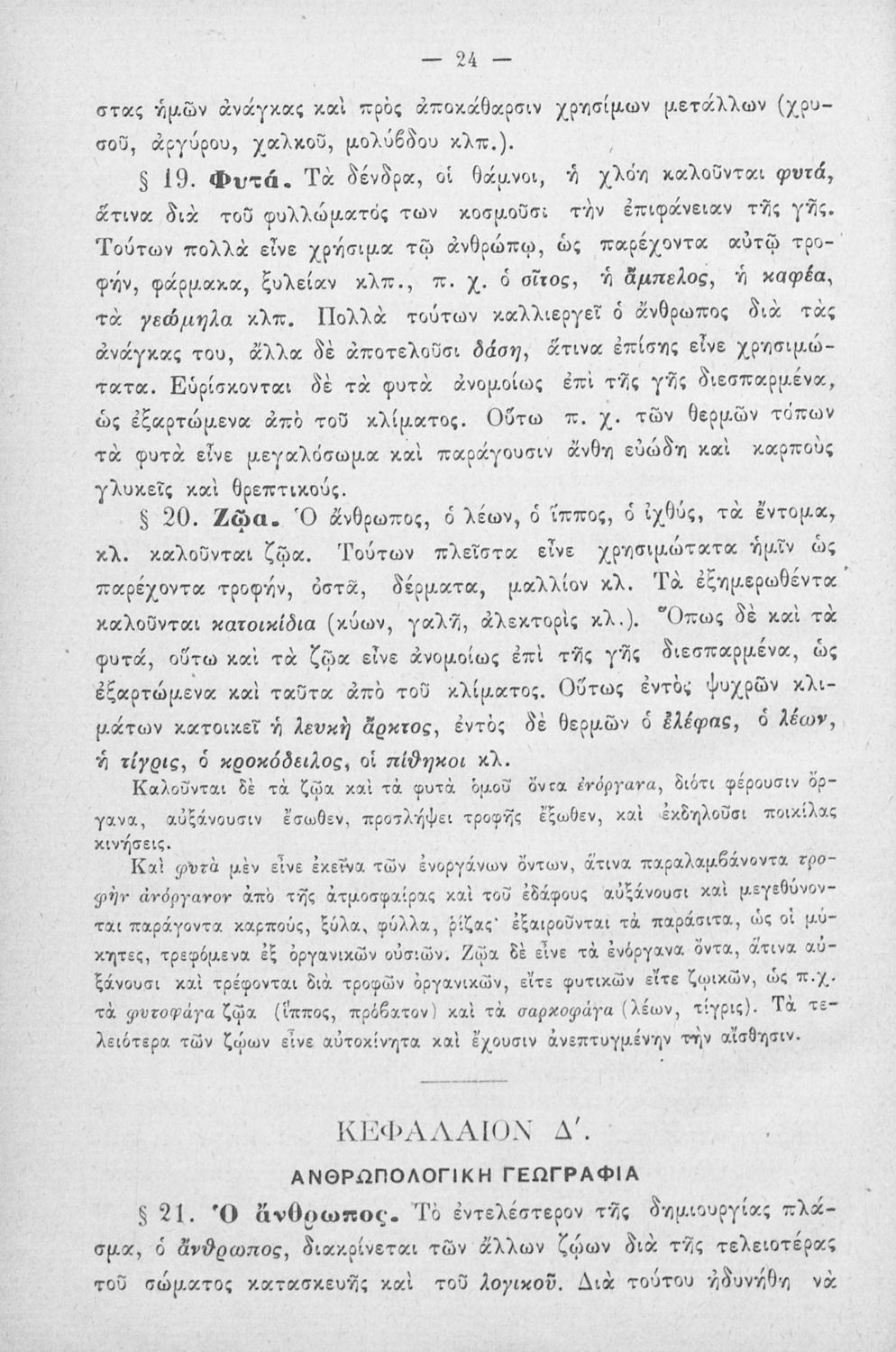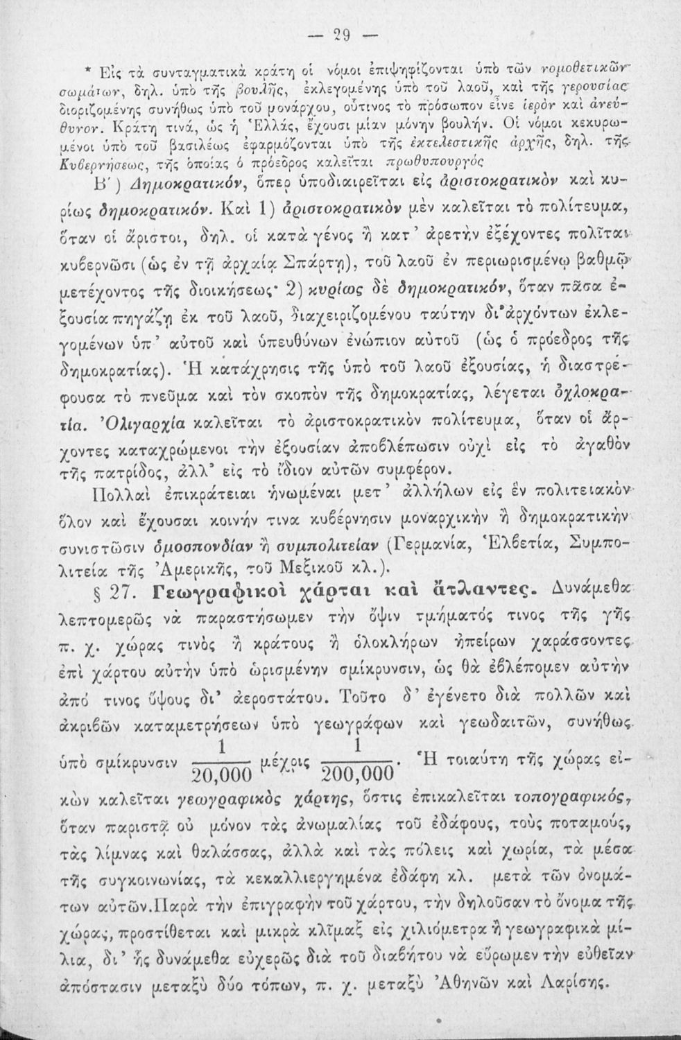 Σχολικό εγχειρίδιο Γεωγραφίας για τους μαθητές της Γ΄ τάξης των Ελληνικών Σχολείων και των Παρθεναγωγείων που περιέχει εισαγωγή στη μαθηματική, φυσική, φυσιογραφική και ανθρωπολογική γεωγραφία και παρουσιάζει την Ελλάδα ανά διαμέρισμα και νομό από φυσική, πολιτική και οικονομική άποψη.