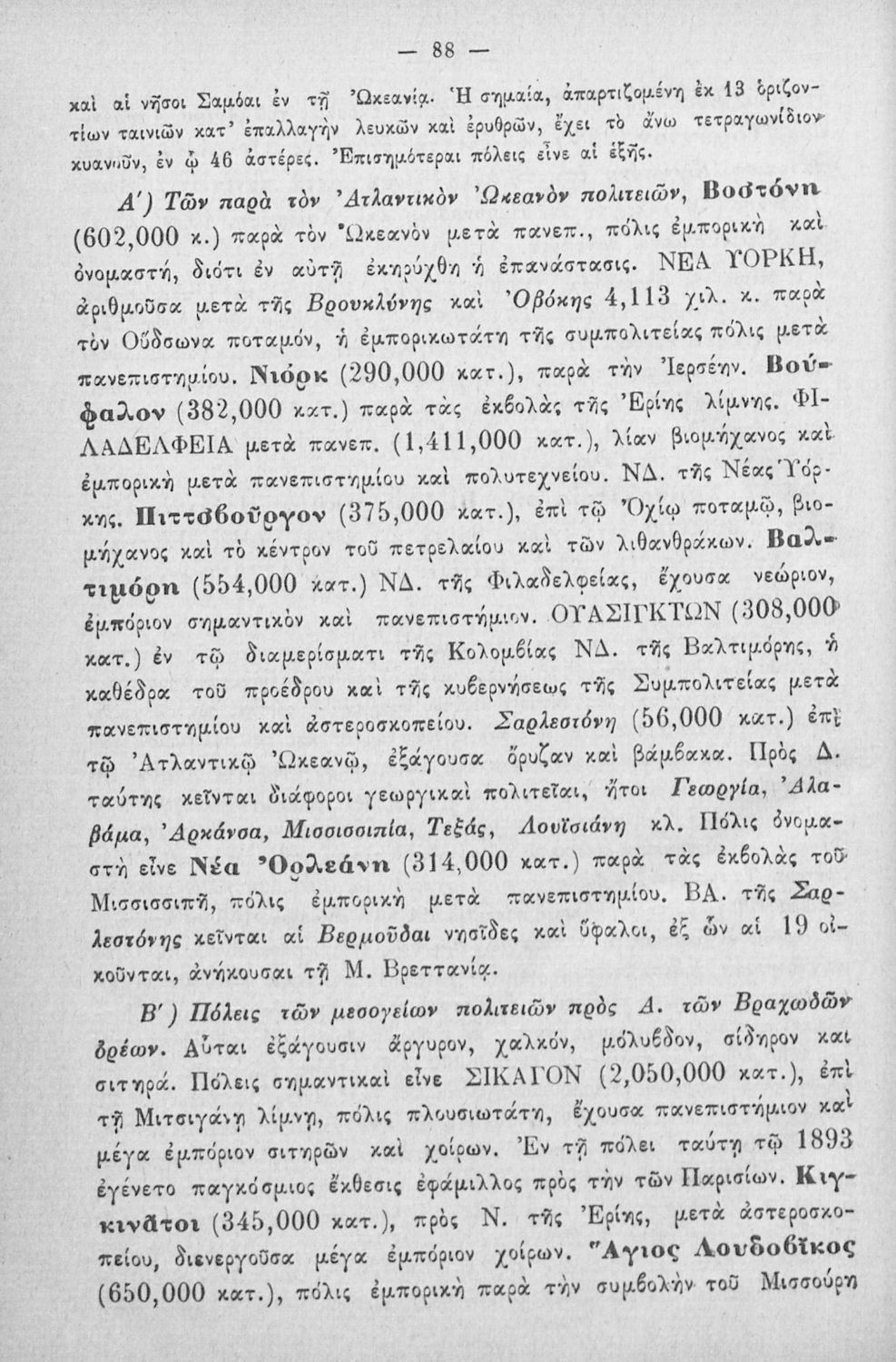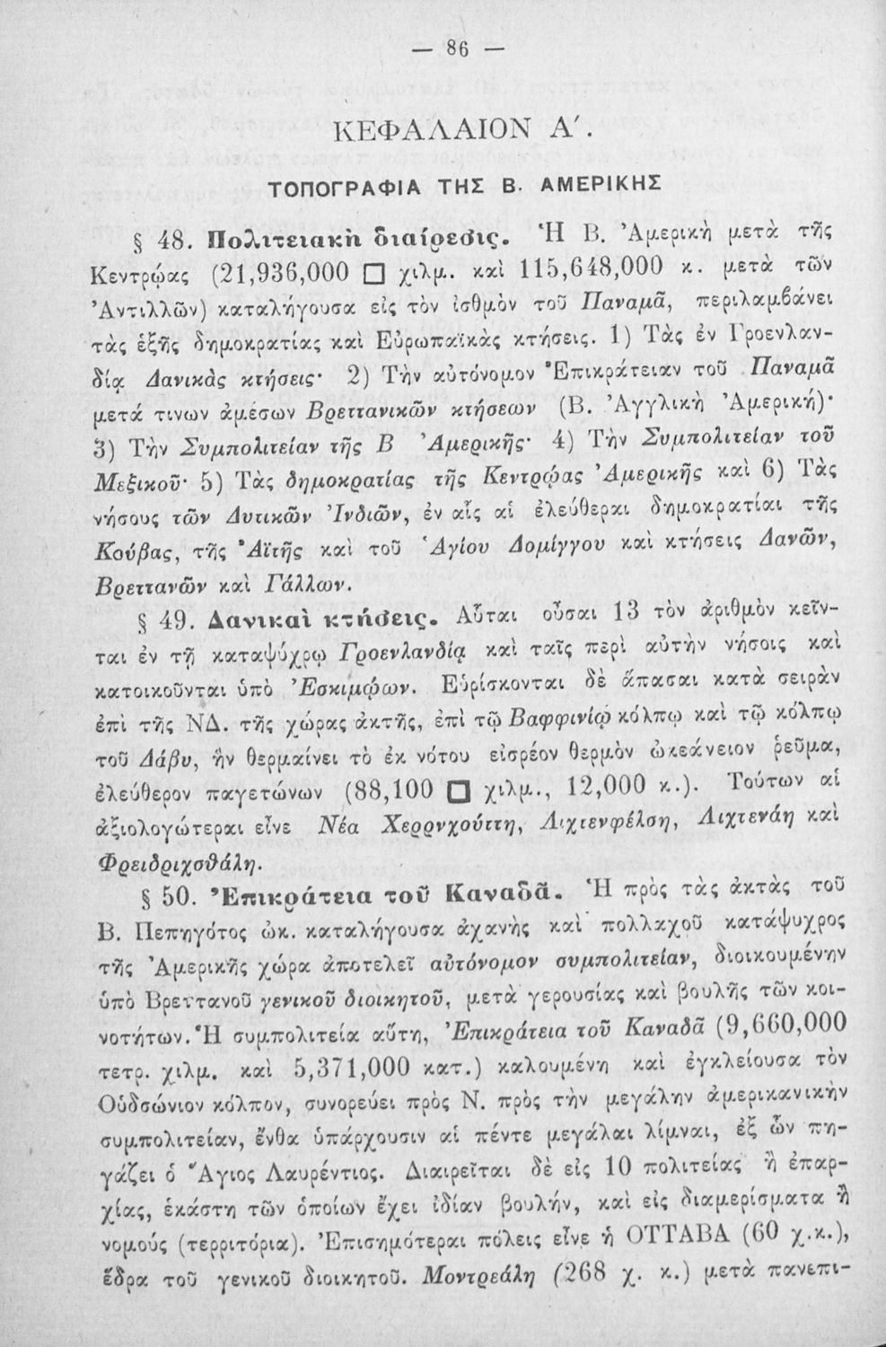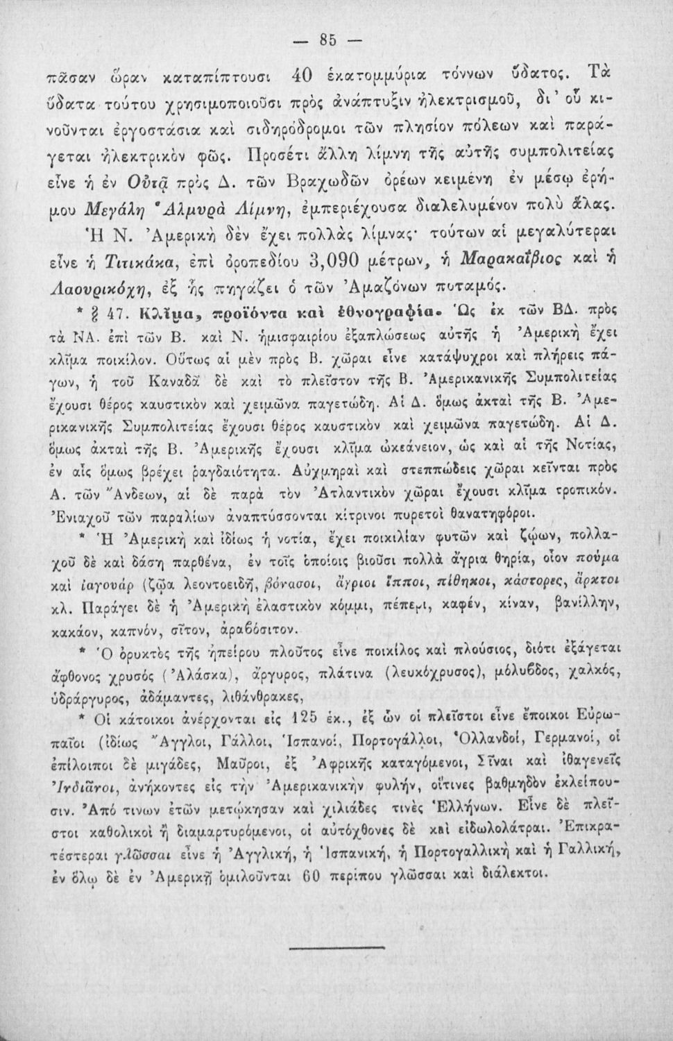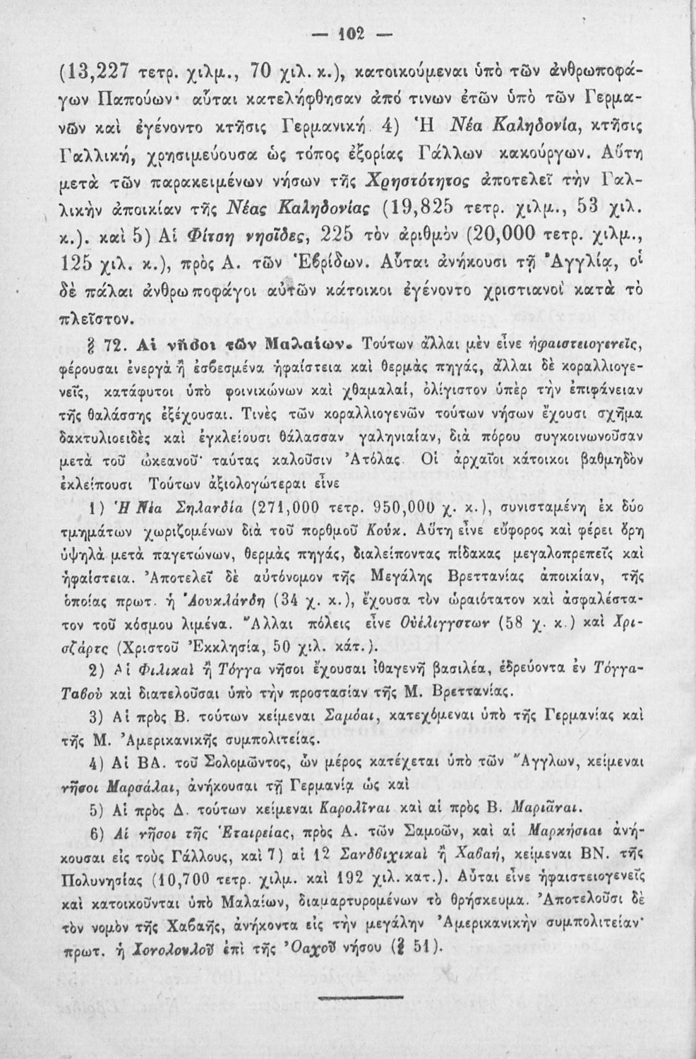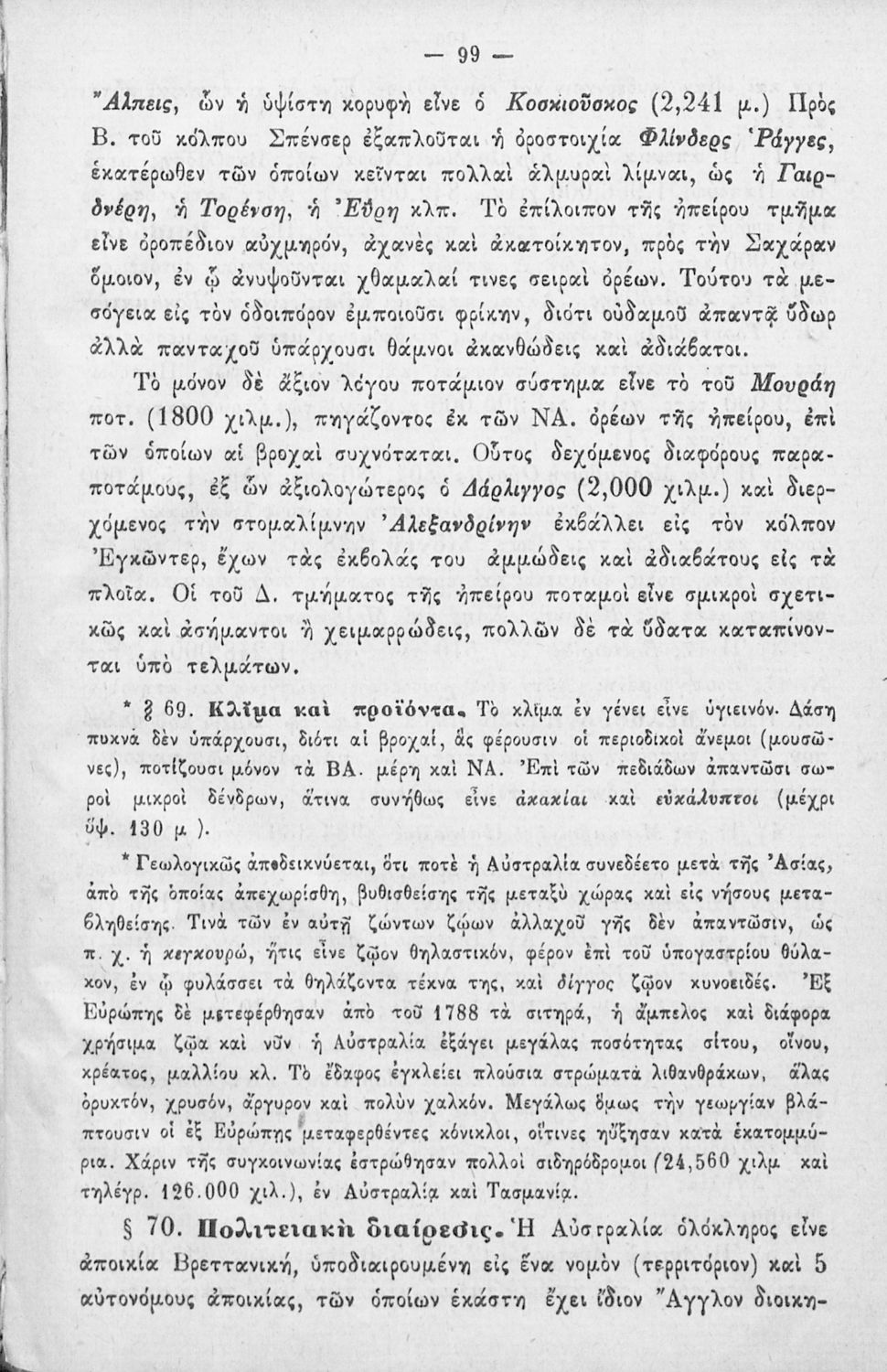 Σχολικό εγχειρίδιο Γεωγραφίας Α' Ελληνικού Σχολείου και Παρθεναγωγείου που περιλαμβάνει εισαγωγή περιέχει εισαγωγή στη μαθηματική, φυσική, φυσιογραφική και ανθρωπολογική γεωγραφία και εξετάζει τη γεωμορφολογία, την πληθυσμιακή σύσταση, το είδος του πολιτεύματος καθώς και τις μορφές οικονομίας των διαφόρων περιοχών της κάθε ηπείρου.