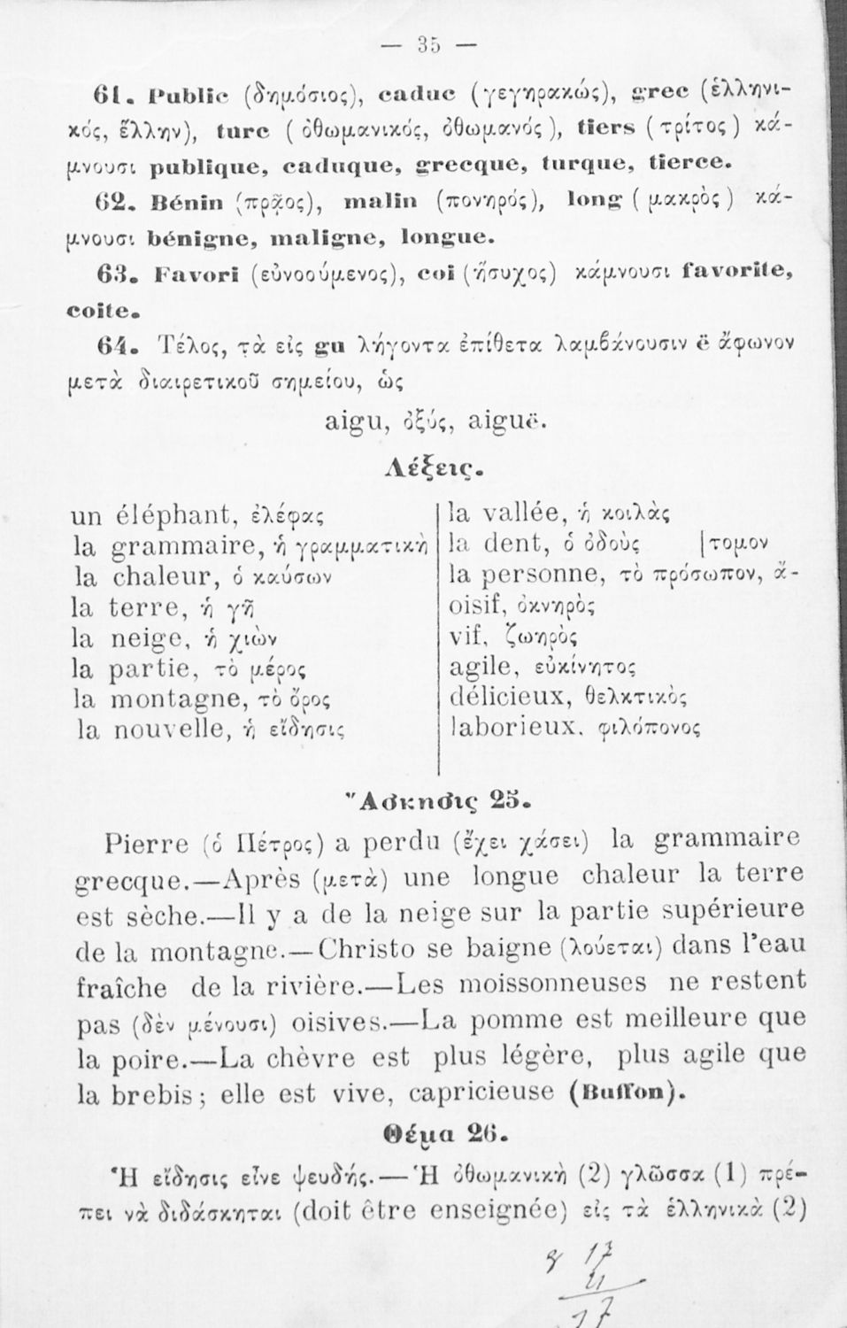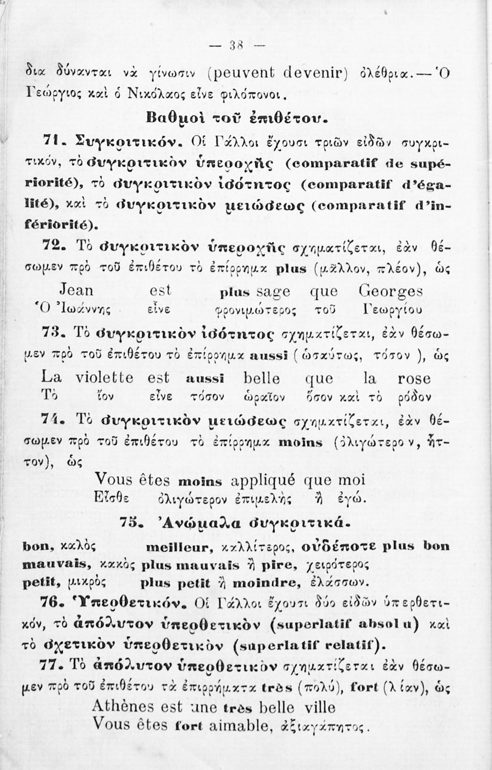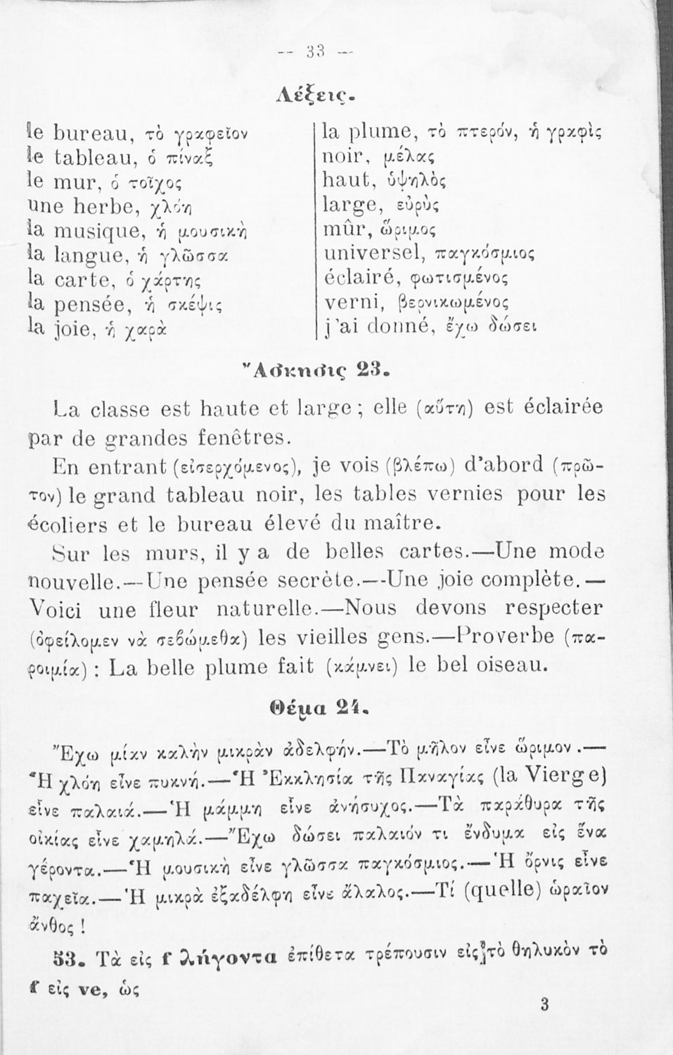 Γραμματική της Γαλλικής γλώσσας για τα Τετρατάξια Γυμνάσια, τη Γ΄ τάξη των Αστικών Σχολείων των Θηλέων και τα Διδασκαλεία της Δημοτικής Εκπαίδευσης που περιλαμβάνει θεωρία, ασκήσεις και λεξιλόγιο.