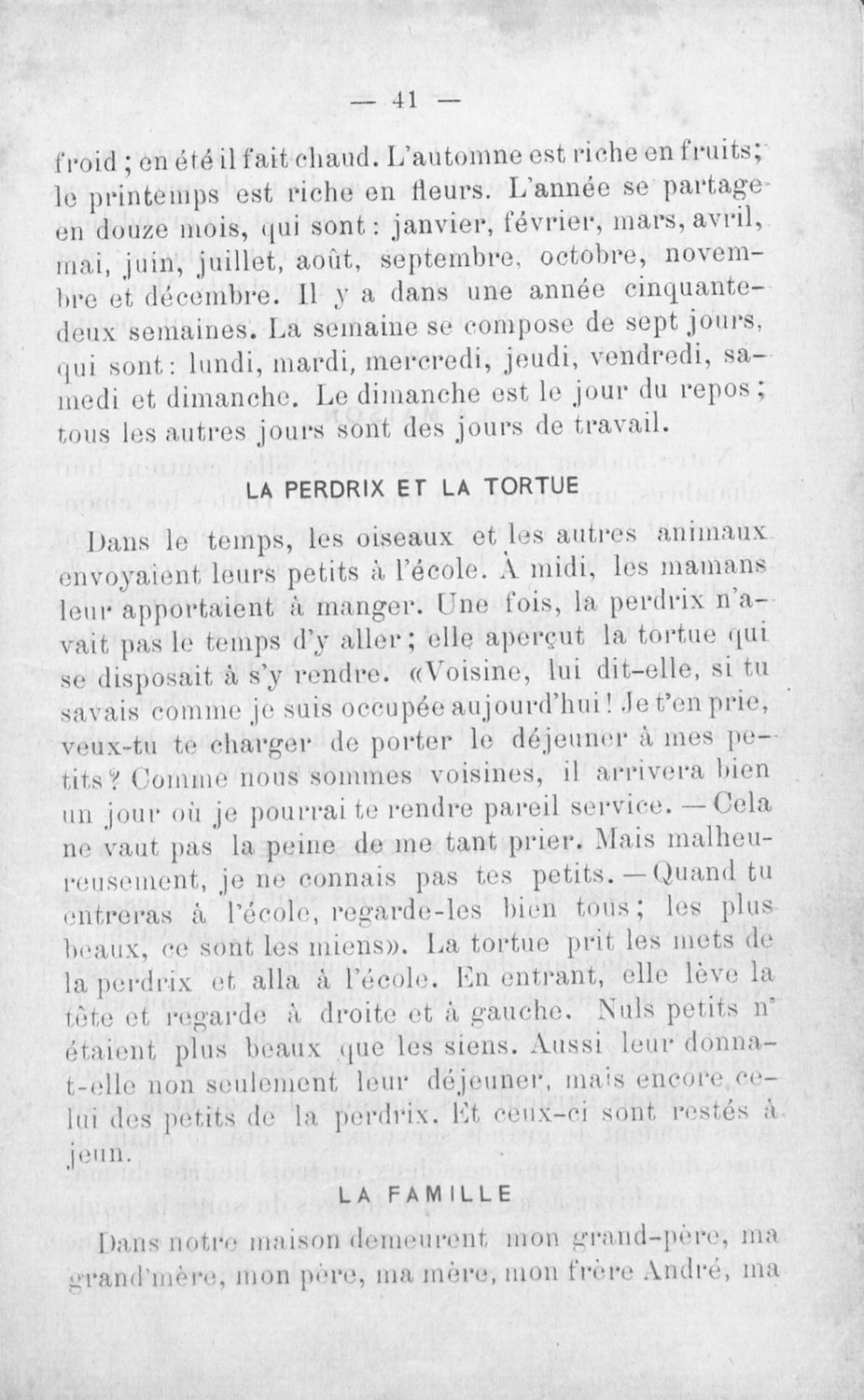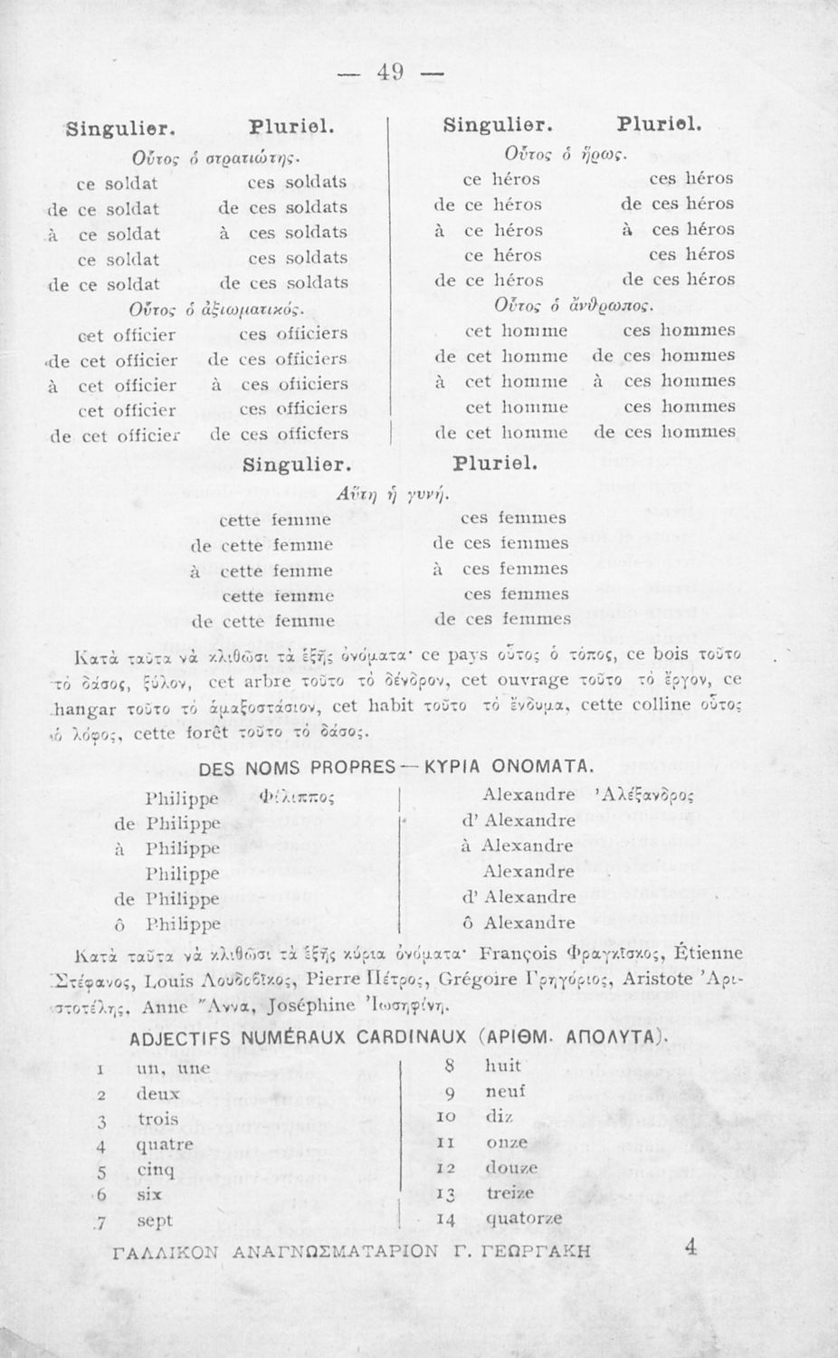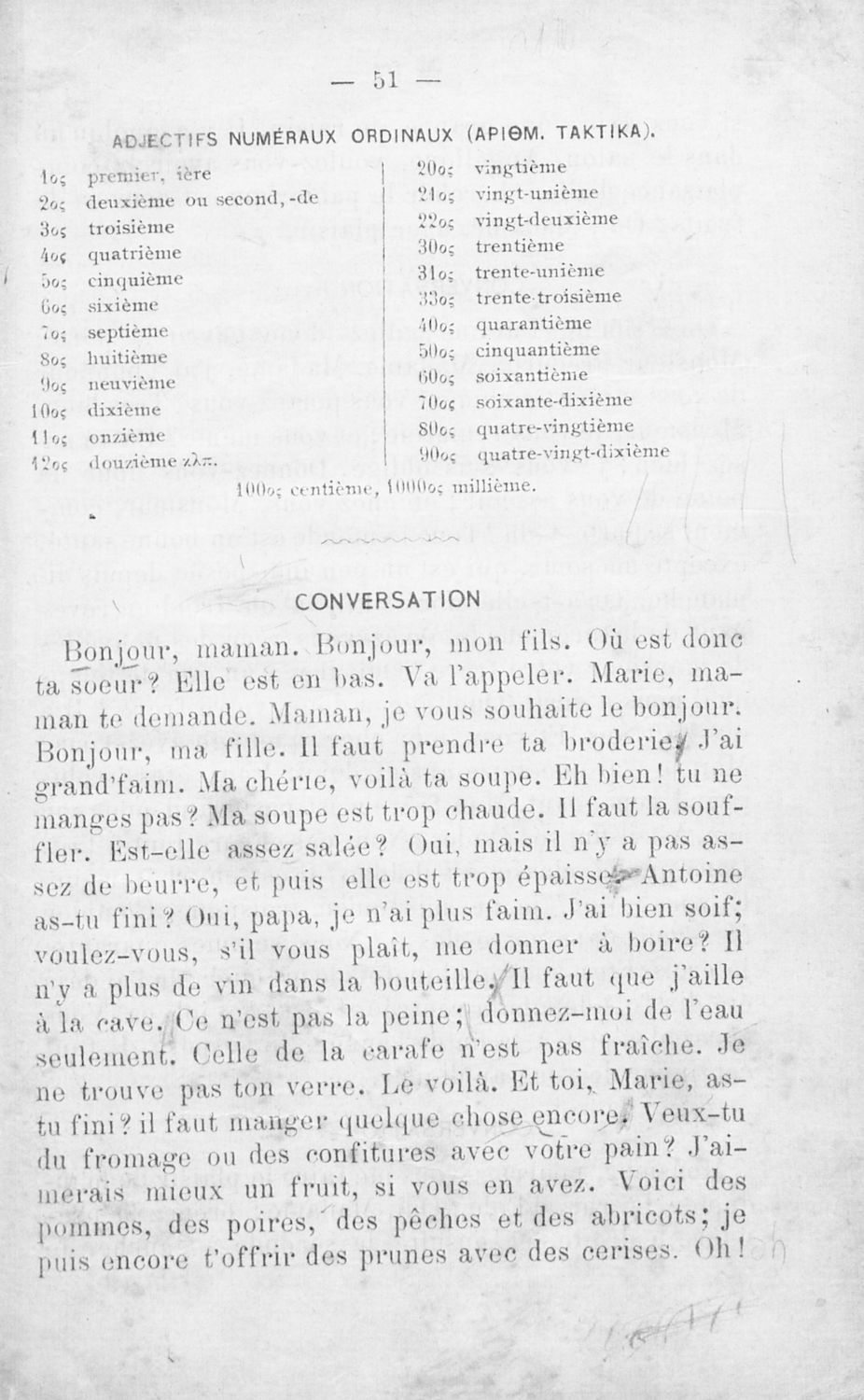 Σχολικό εγχειρίδιο Γαλλικών για τια Ελληνικά Σχολεία και των Παρθεναγωγεία που περιλαμβάνει τους βασικούς κανόνες γραμματικής καθώς και σειρά κειμένων ποικίλης θεματολογίας για πρακτική εξάσκηση των μαθητών. Περιλαμβάνεται και κατάλογος λεξιλογίου και υποδείγματα επιστολών.