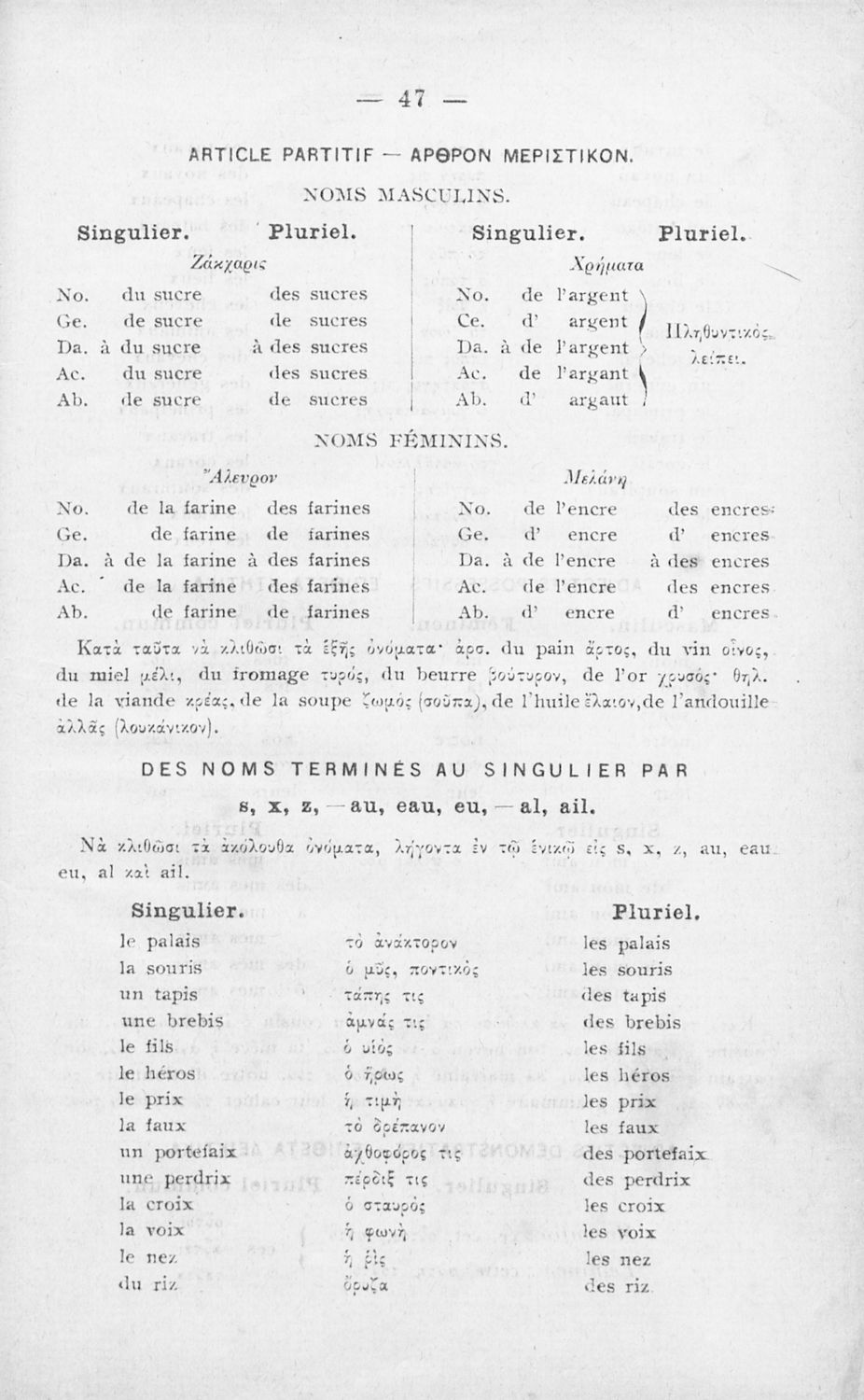 Μαθητικό βοήθημα Αρχαίων Ελληνικών για τα Ελληνικά Σχολεία, Παρθεναγωγεία και Γυμνάσια που περιλαμβάνει γραμματική της αρχαίας ελληνικής και κατάλογο ανωμάλων ρημάτων.